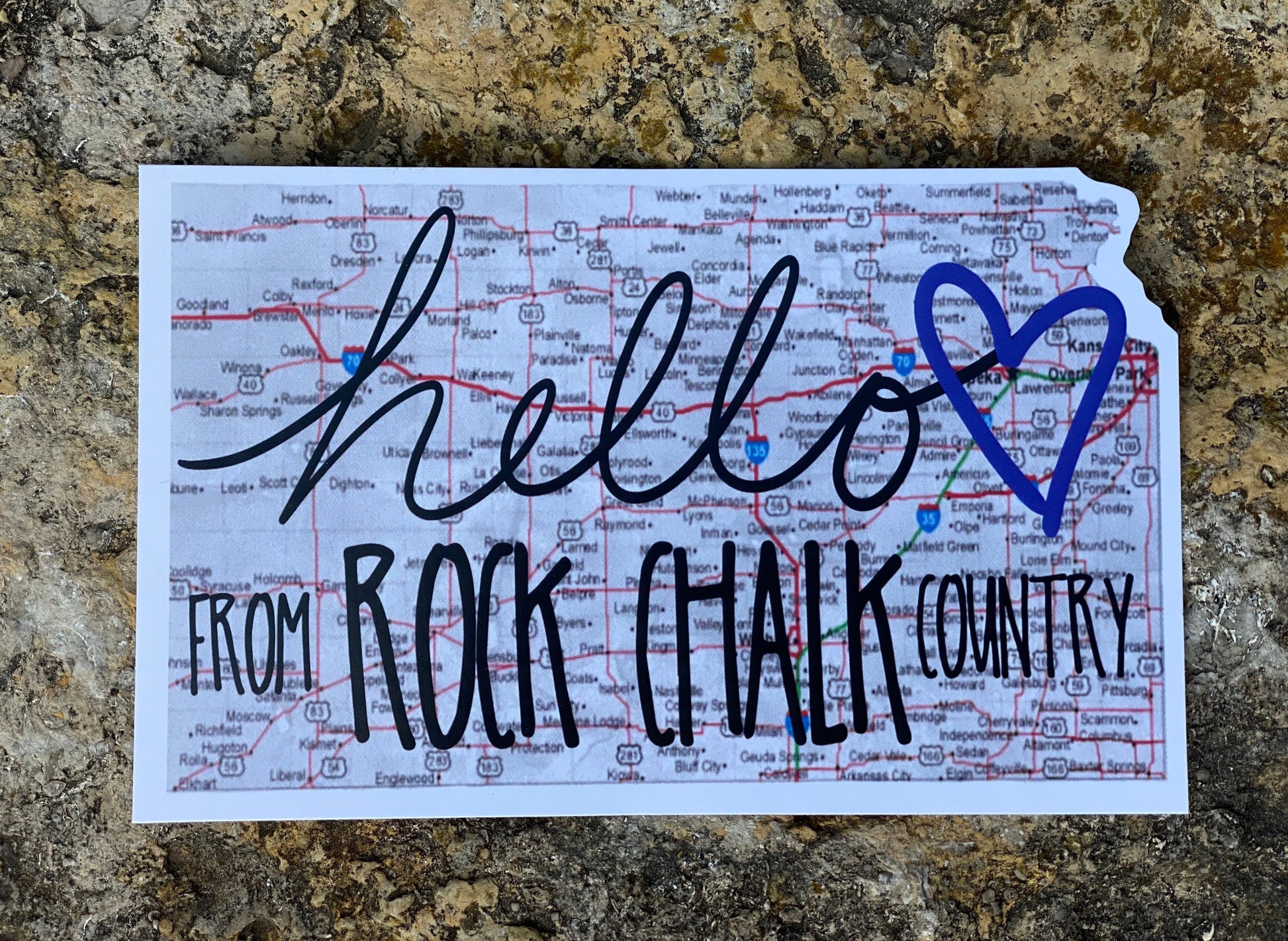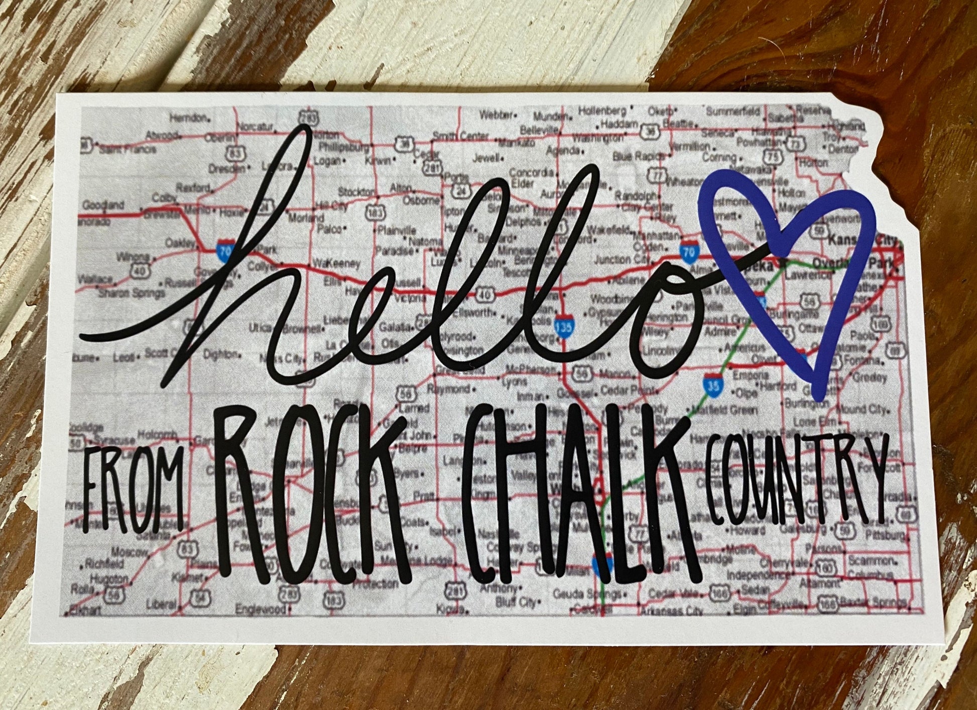A simple map of Kansas with hello from ROCK CHALK country. A huge blue heart covers Lawrence.
