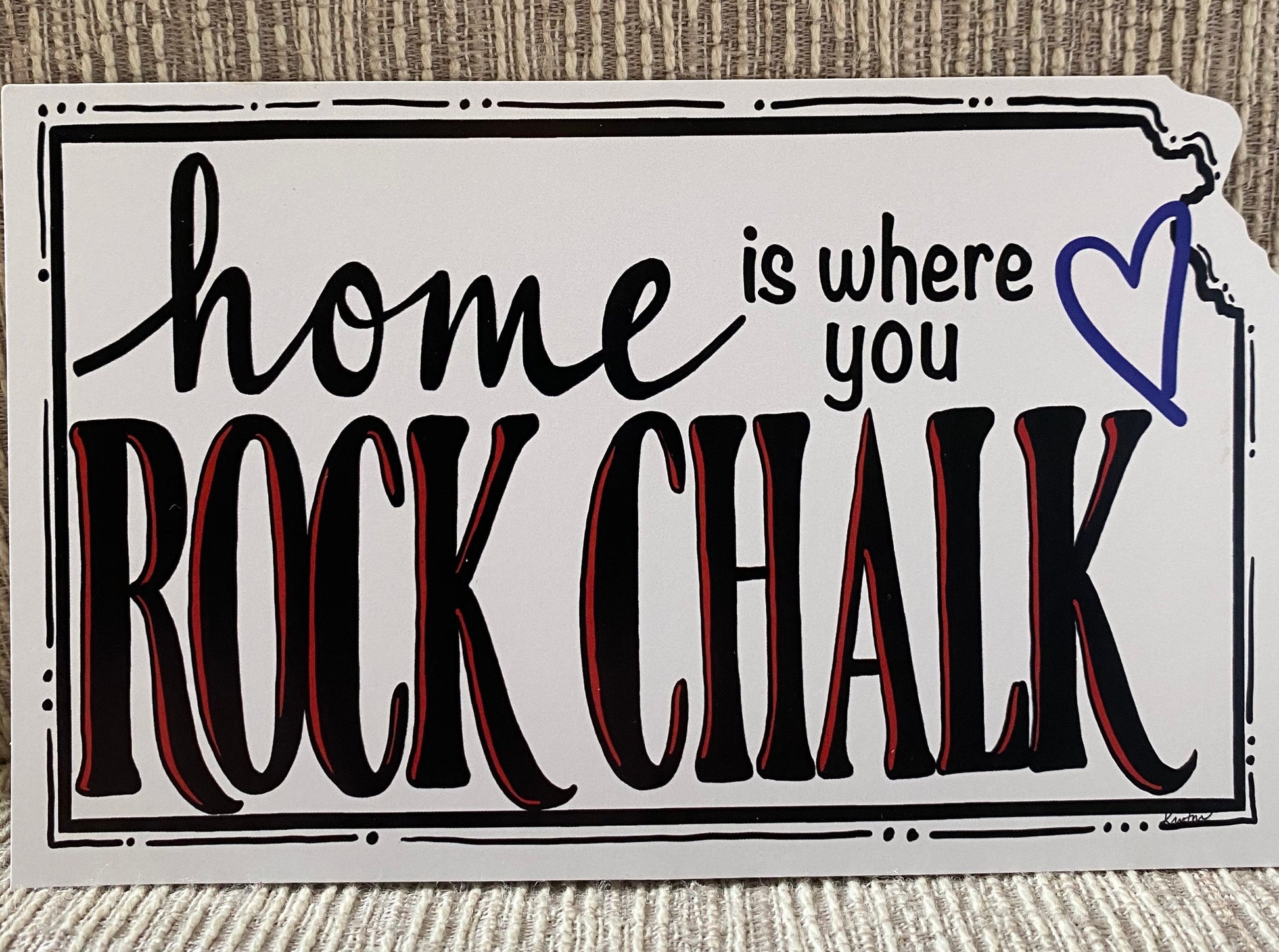 A simple outline of Kansas with a blue heart over Lawrence- home of the Jayhawks. All designs are original art, professionally printed and UV coated and then die cut into the shape of Kansas. Not the typical postcard and perfect for those cheering for KU