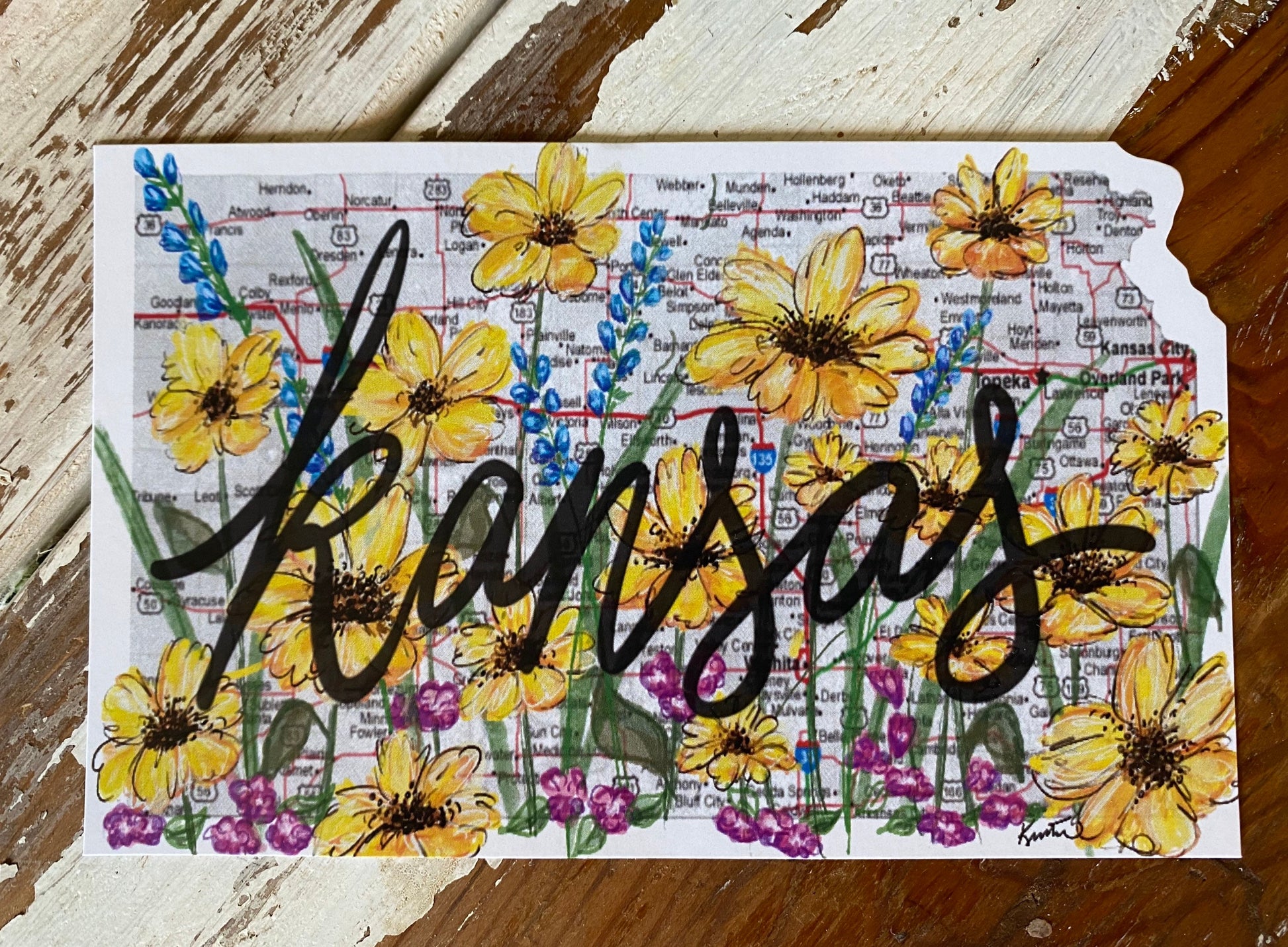 Whimsical yellow flowers cover a map of Kansas. Original artwork and lettering is hand painted. Cards are professionally printed, and UV coated, perfect for a frame. Postcards are die cut into the shape of Kansas.