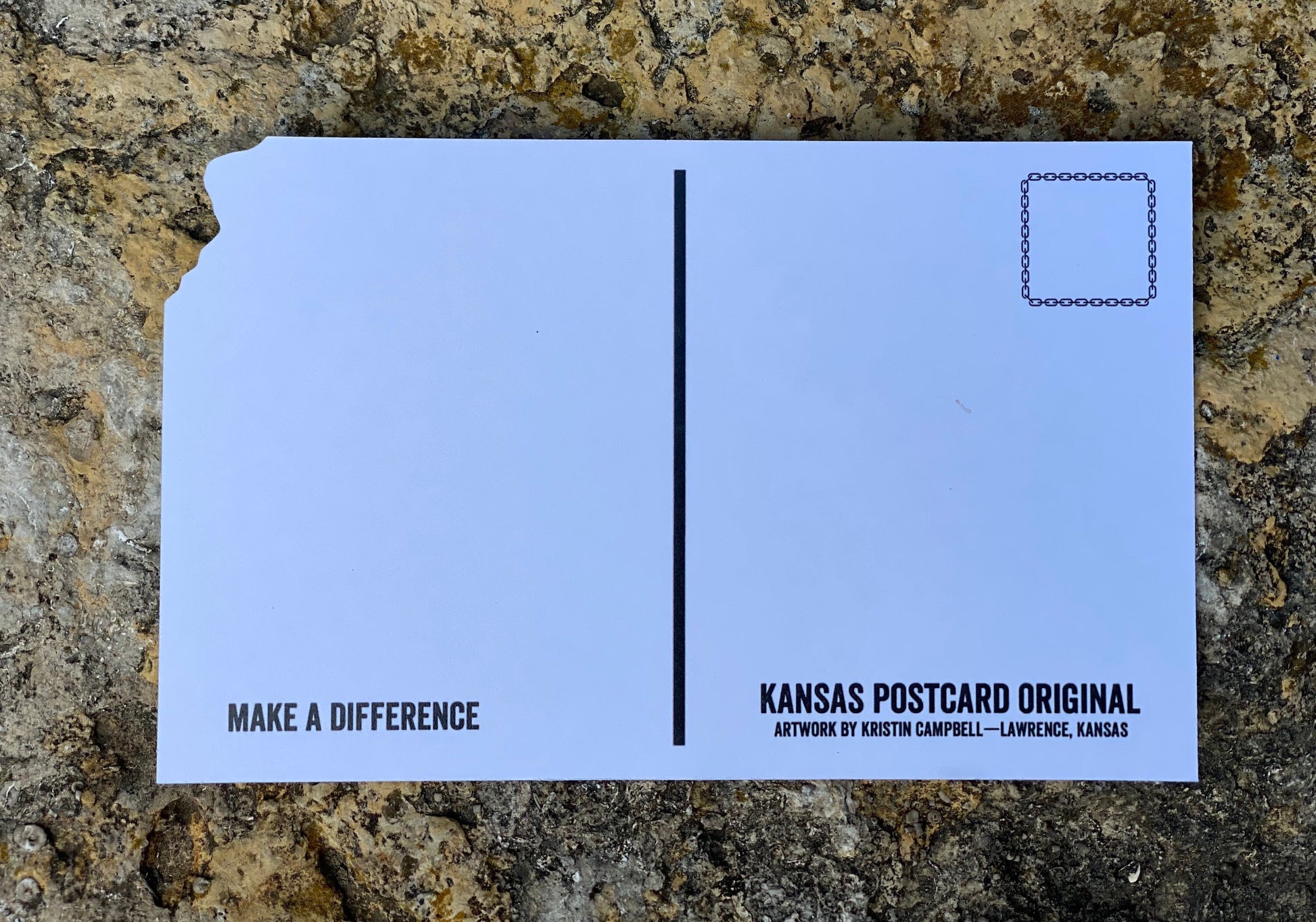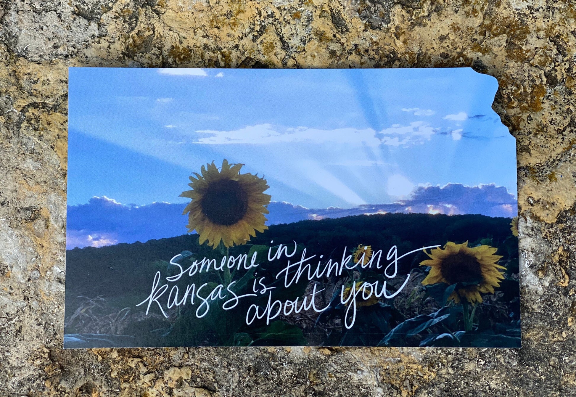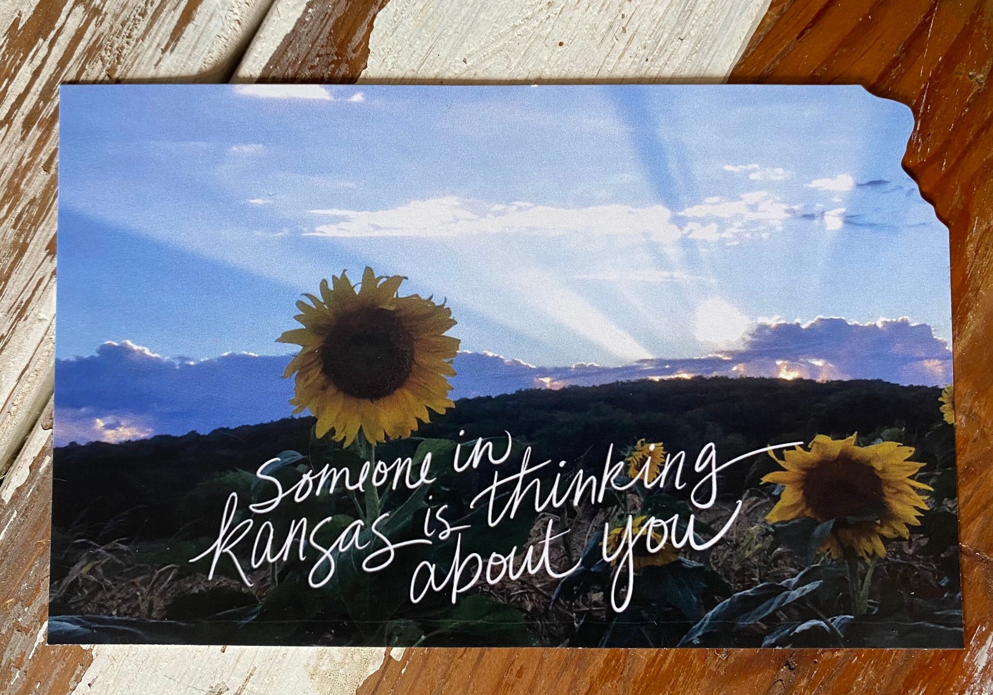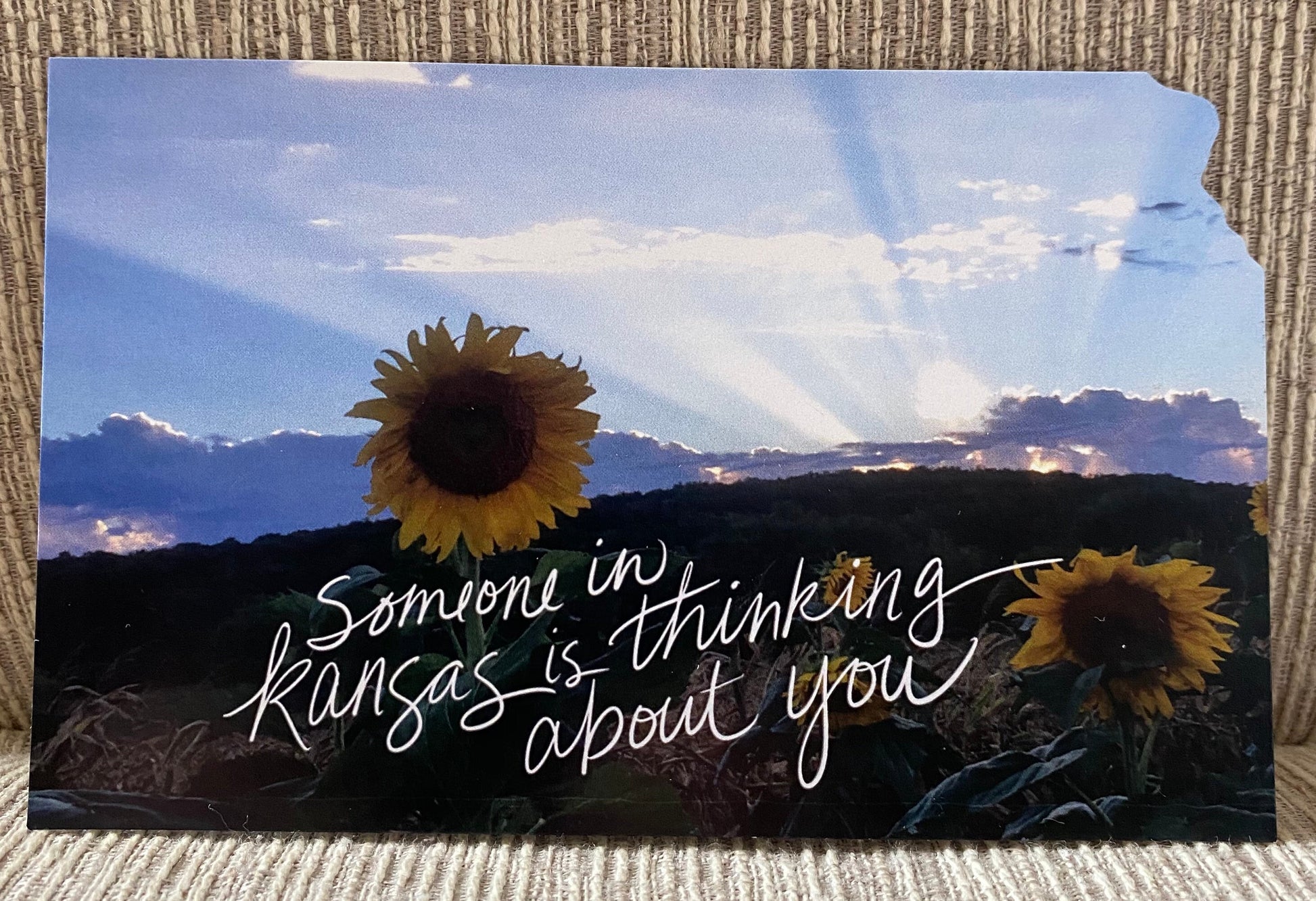 A simple note on a beautiful Kansas sunset photo. This photo was taken just south of Lawrence, Kansas. All designs are original and professionally printed and UV coated. Cards are then die cut into the shape of Kansas. Postcards measure 6”x 3.75”