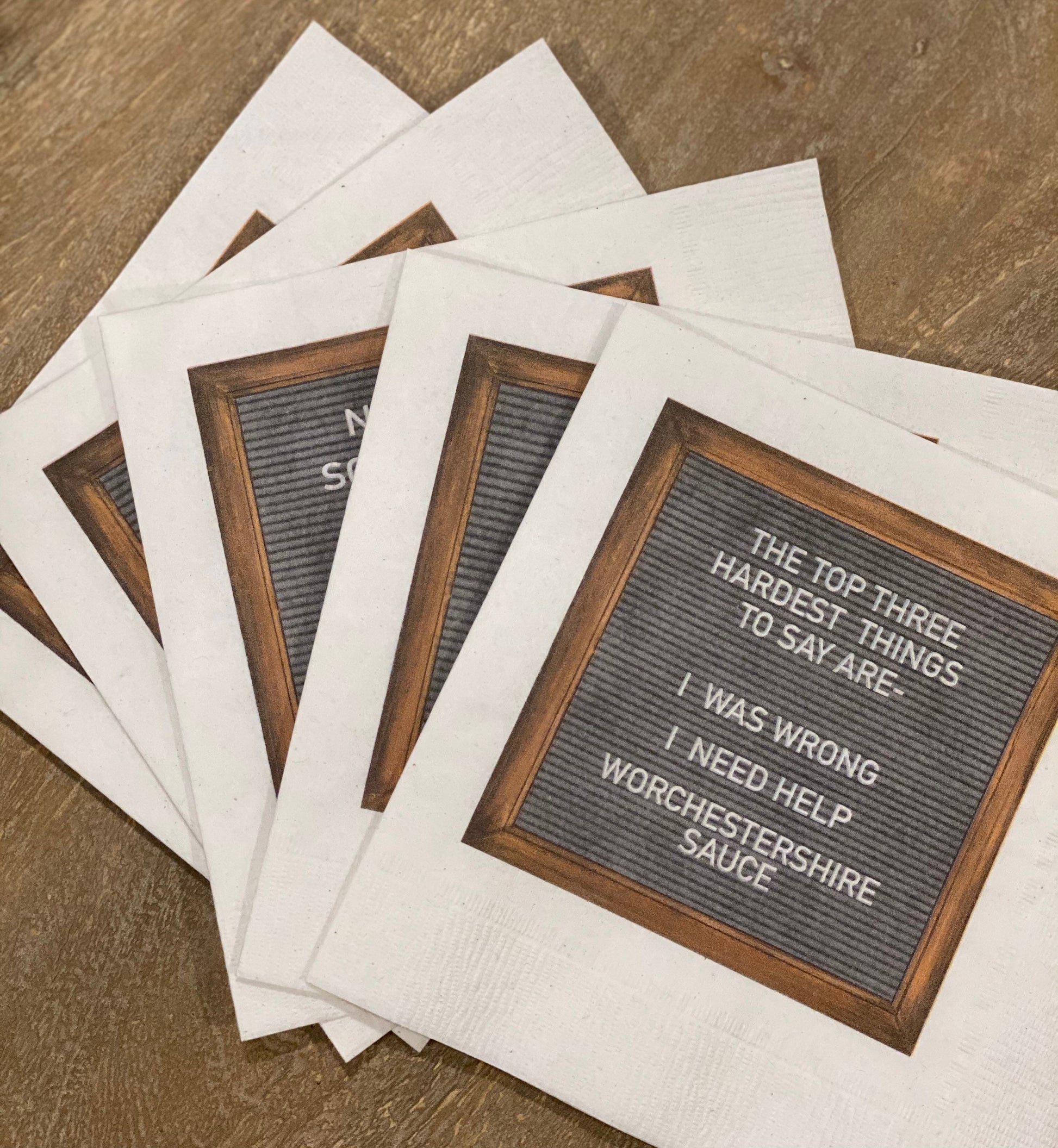 This set of Felt Board Magnet quotes capture the Honest Truth and can be used as a fun addition to the table decor for just about any occasion. Each package features 5 original designs/4 of each (20 total) Napkins are printed in Oshkosh, WI on recycled paper. Napkins come packaged in clear plastic with a card on the on the back showing examples of each napkin. I have a variety of felt board napkins to choose from. The more in a display the better. Customers love to read them and laugh as they checkout at the register.
