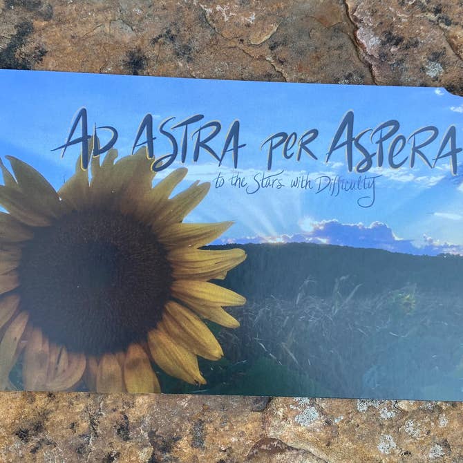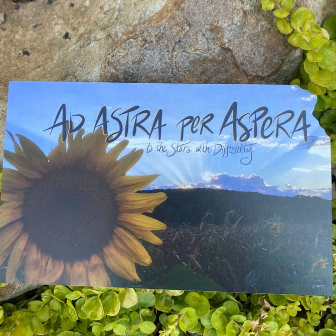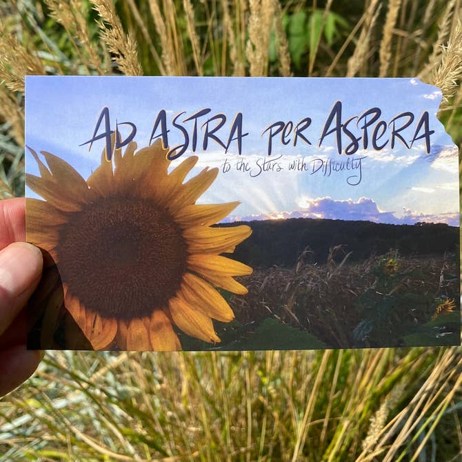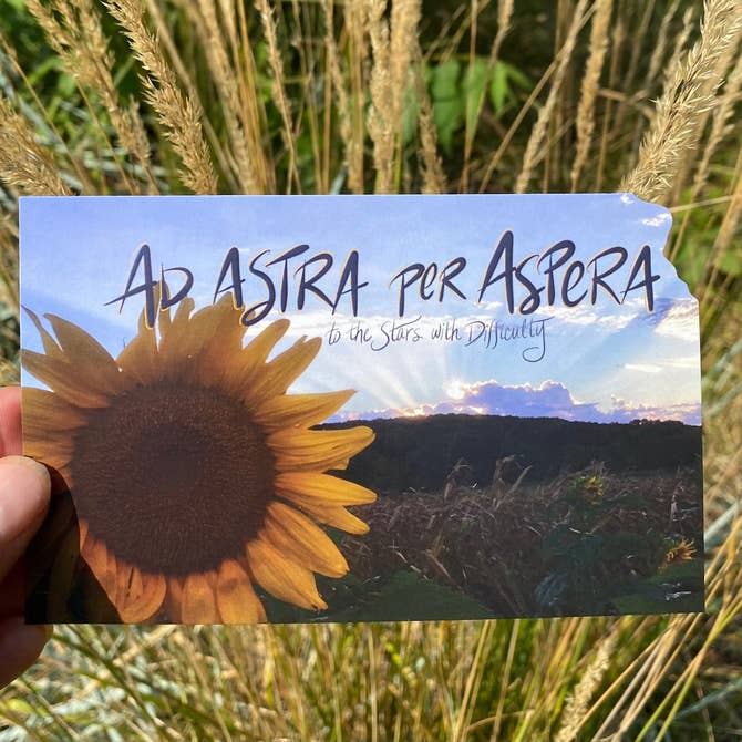 More than a basic postcard, this Kansas postcard is also die cut in the shape of Kansas. This photo was taken just south of Lawrence during a spectacular fall sunset. Share the beauty of our sunflower state as well as the Kansas Motto-Ad Astra per Aspera (to the stars with difficulty) with this beautiful sunflower postcard