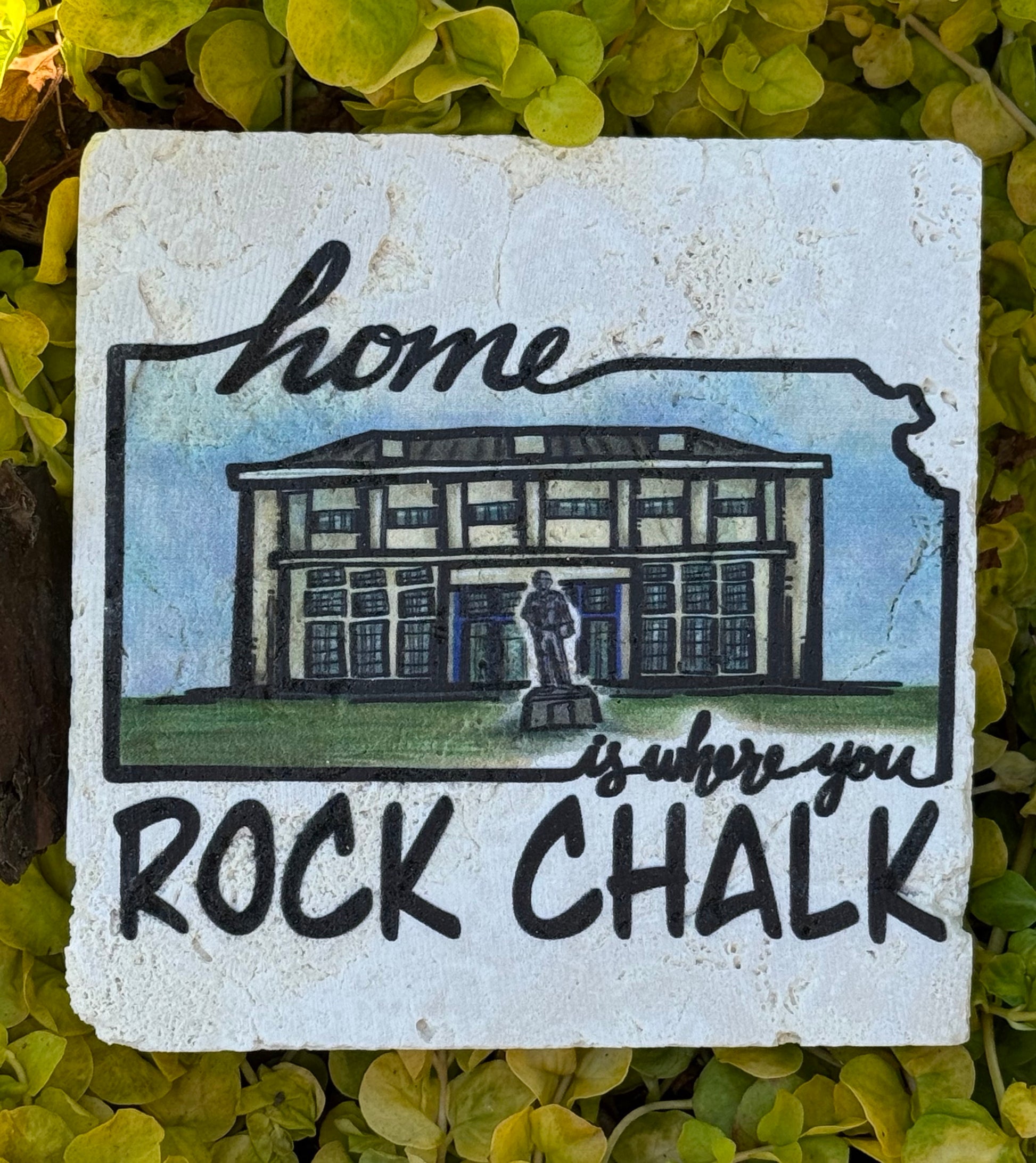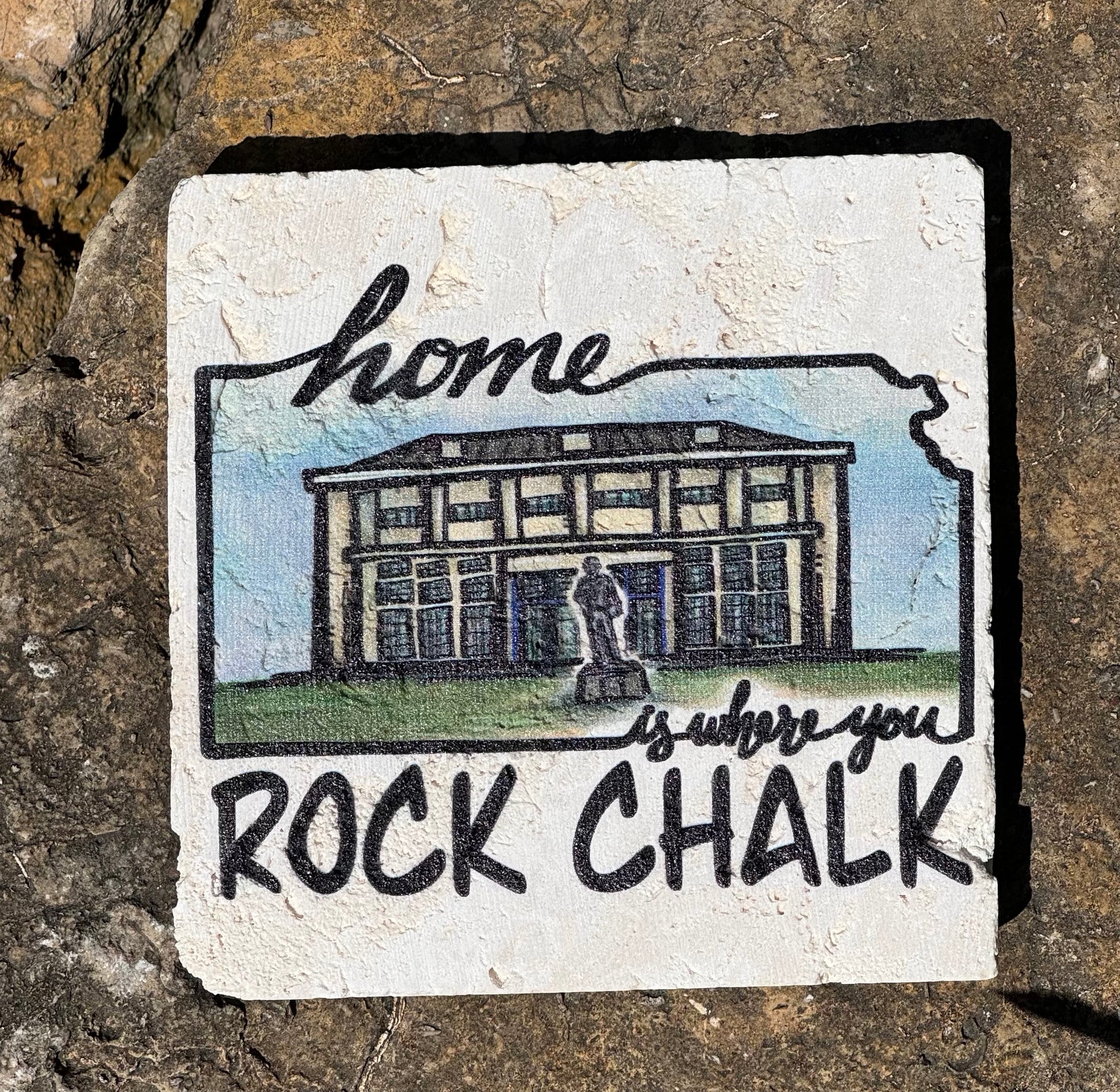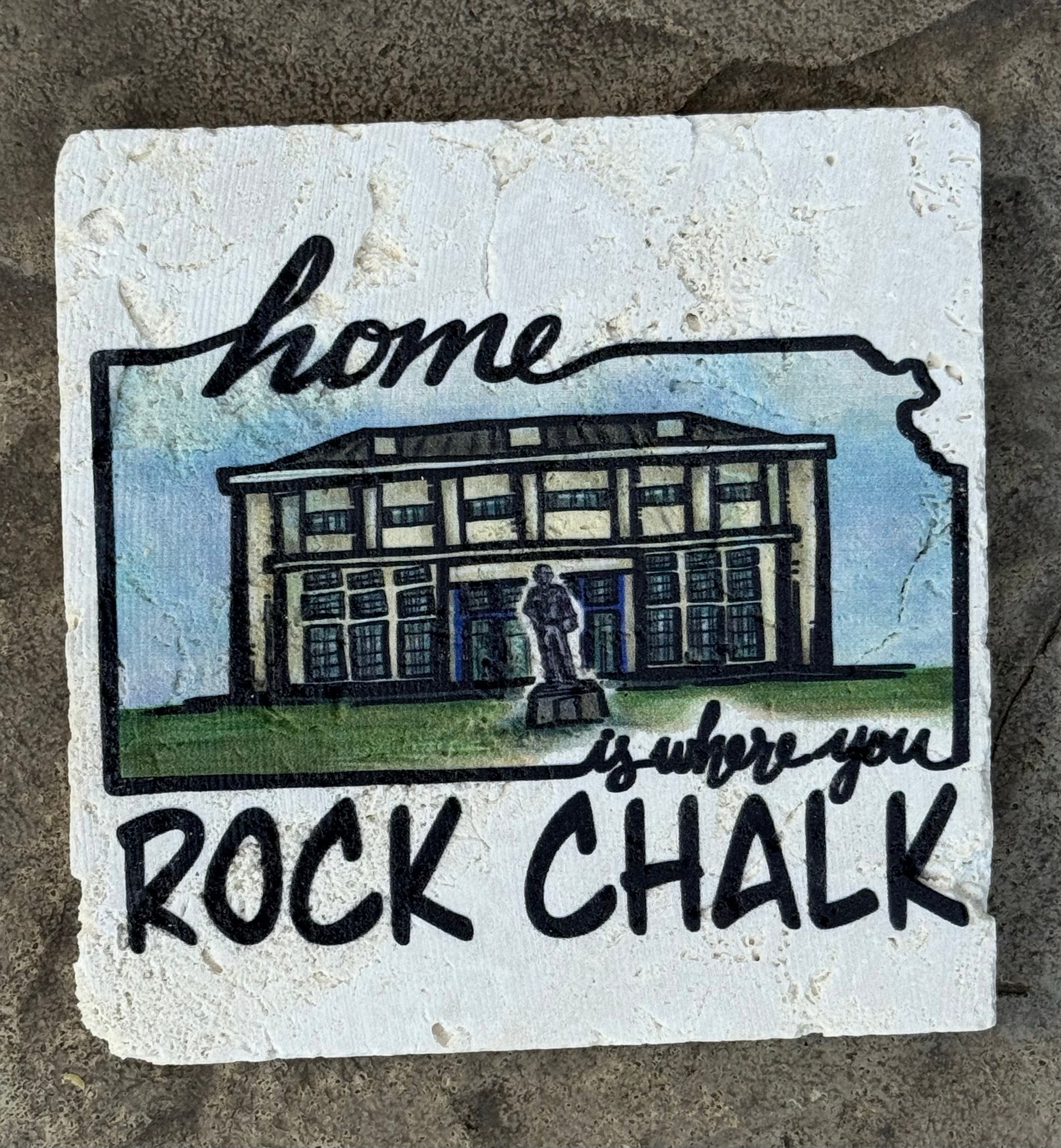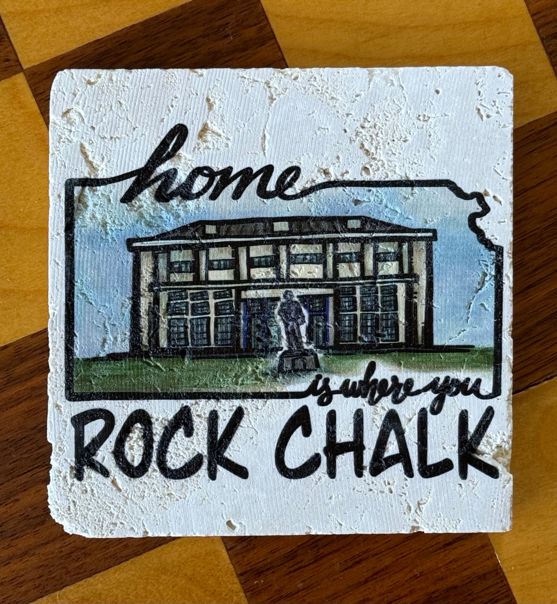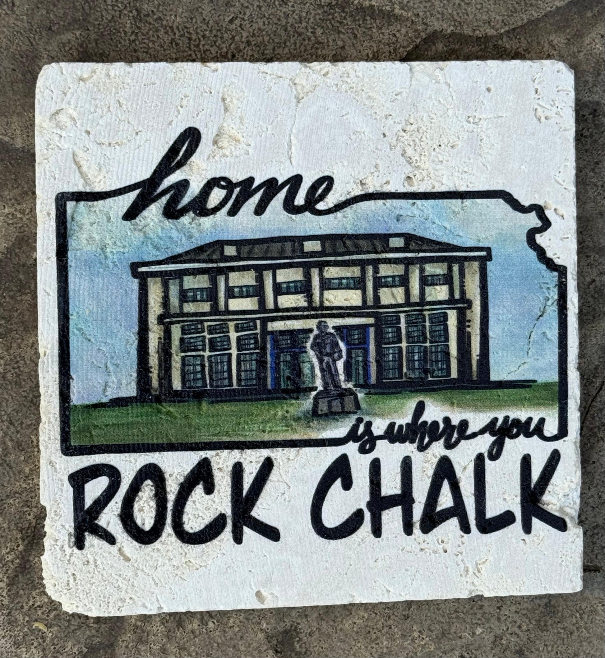 This natural travertine coaster has been professionally printed with my original watercolor painting of Allen Fieldhouse. The subtle outline of Kansas frames the artwork with the words “Home is Where You Rock Chalk”. A full cork back will protect surfaces. Coasters are naturally absorbent. The artwork is permanent and will not fade or scratch. Coasters measure roughly 4”x4” and are natural stone which will have divots and holes creating a bit of character. -no 2 coasters will be exactly alike. Designed and printed in Kansas.