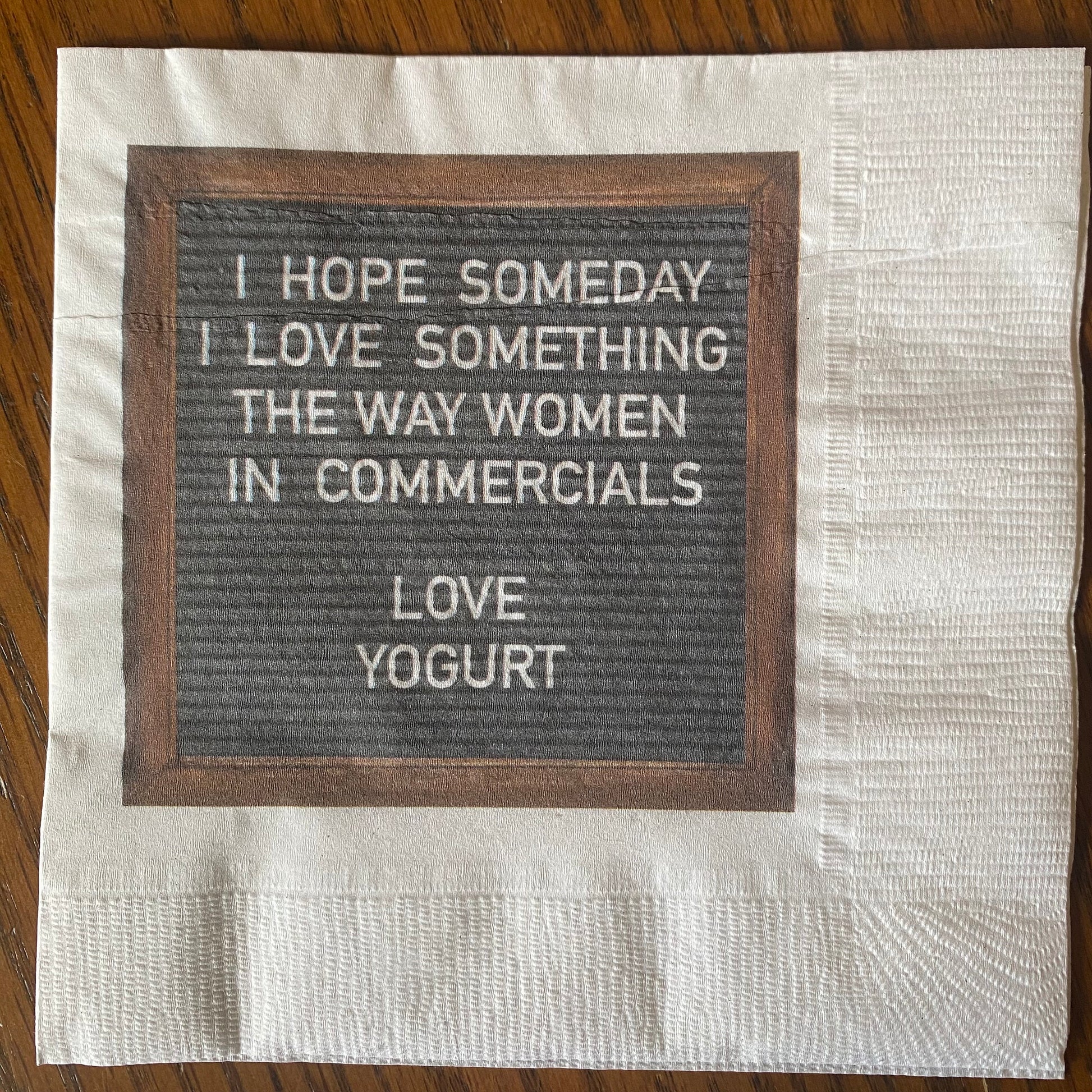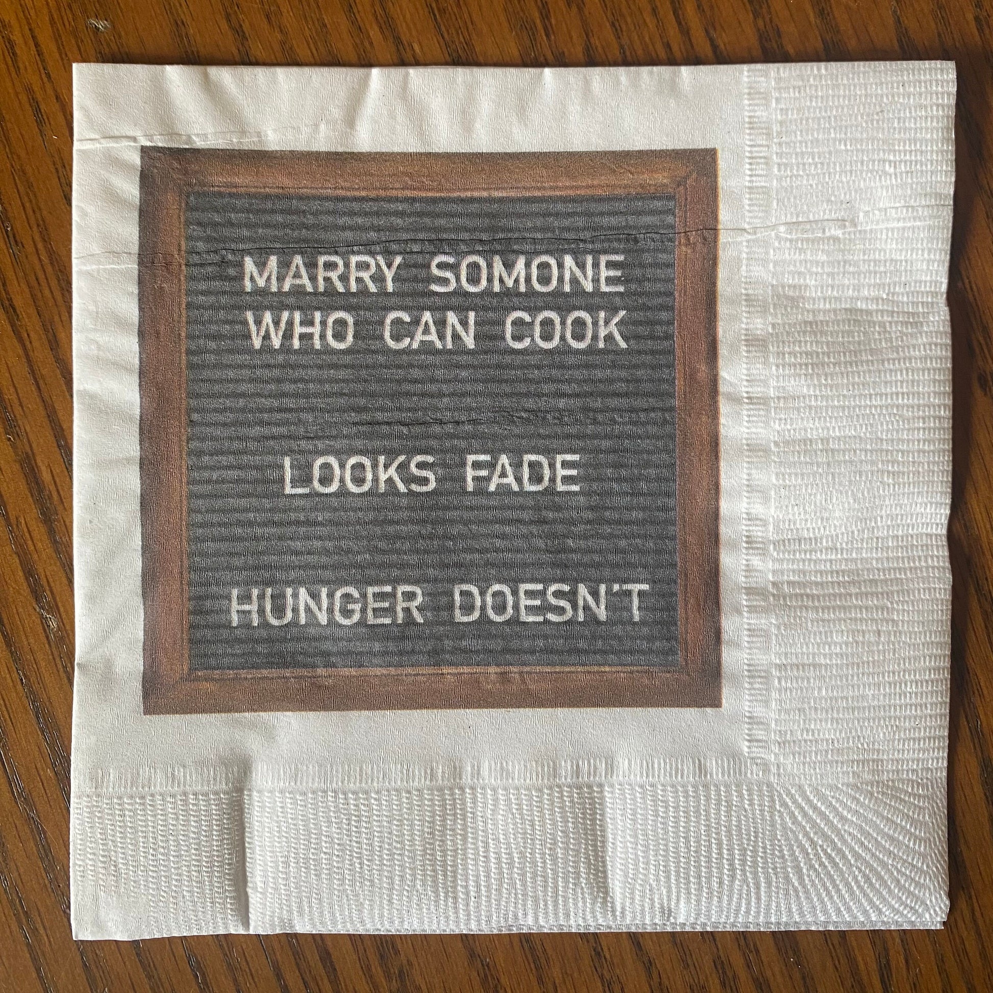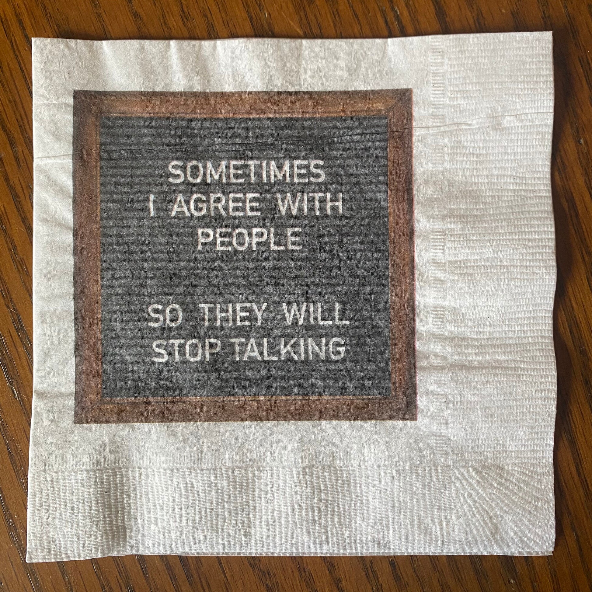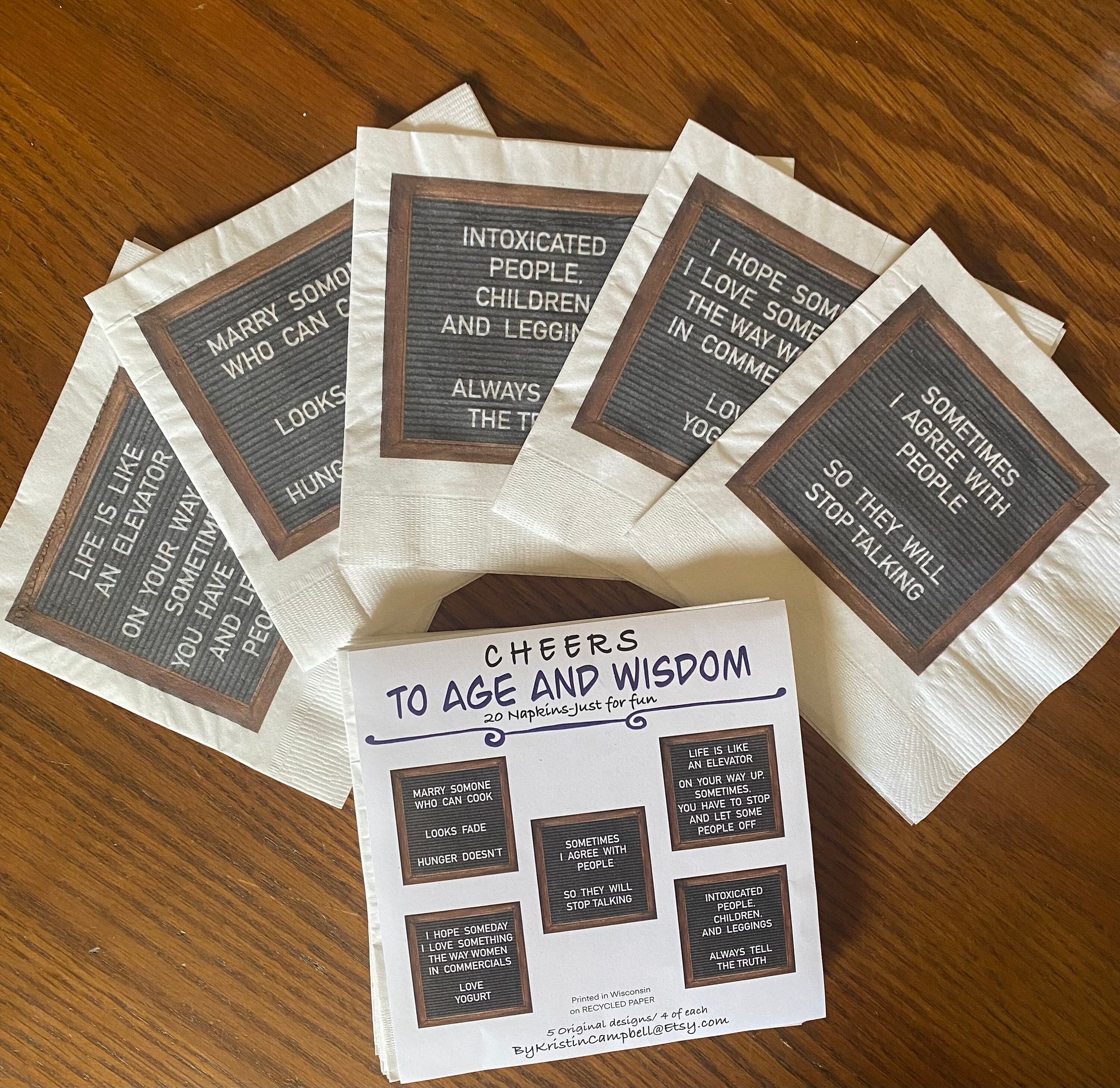 Each set includes 20 napkins designed to look just like a felt message bald. there are 5 different funny quotes poking a little fun at aging. 4 of each design.