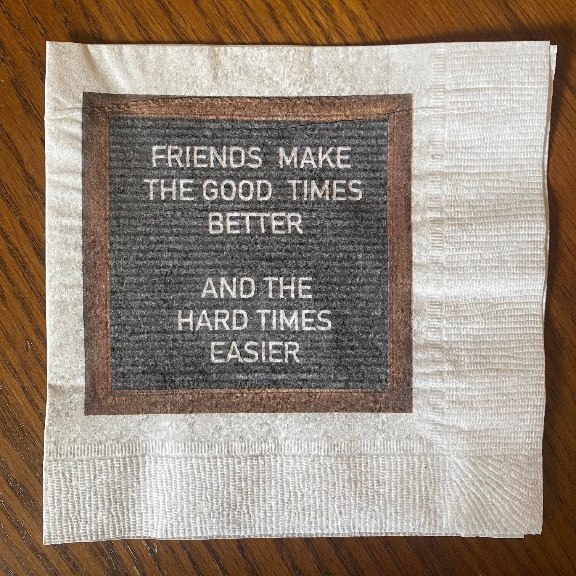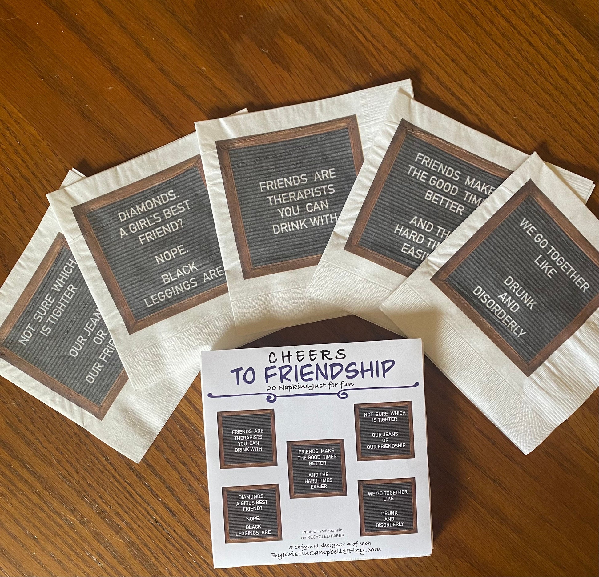 This set of napkins is truly Just for Fun! Add these to your next gathering for a bit of laughter with your friends. Each set includes 20 napkins designed to look just like felt message boards. 5 different quotes are included in each set so that guests can mix and match and laugh a little at the napkin someone else may have chosen. Combine this set with some of my other designs- employment, optimism, lifelong friends, birthday, marriage. This napkin set is a fun addition to any gift bag or celebration. Napkins are made from recycled paper in the US and measure 3.5”x 3.5”
