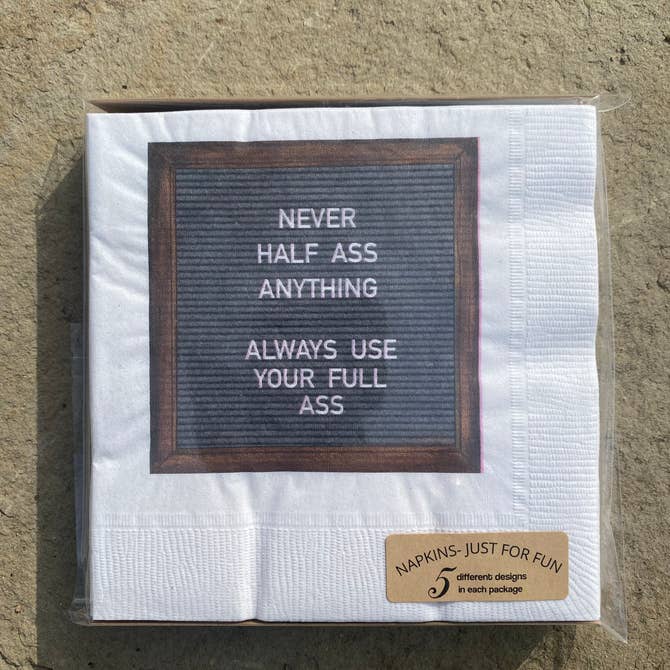 Beverage napkins are 5”x5” and come in clear packaging with a product information card on the back showing the 5 designs included in each package. 20 Napkins per package.  Napkins sell well in a basket near the register. Customers can read through them and laugh as they check out. An easy item to add to a gift basket or to host a party.