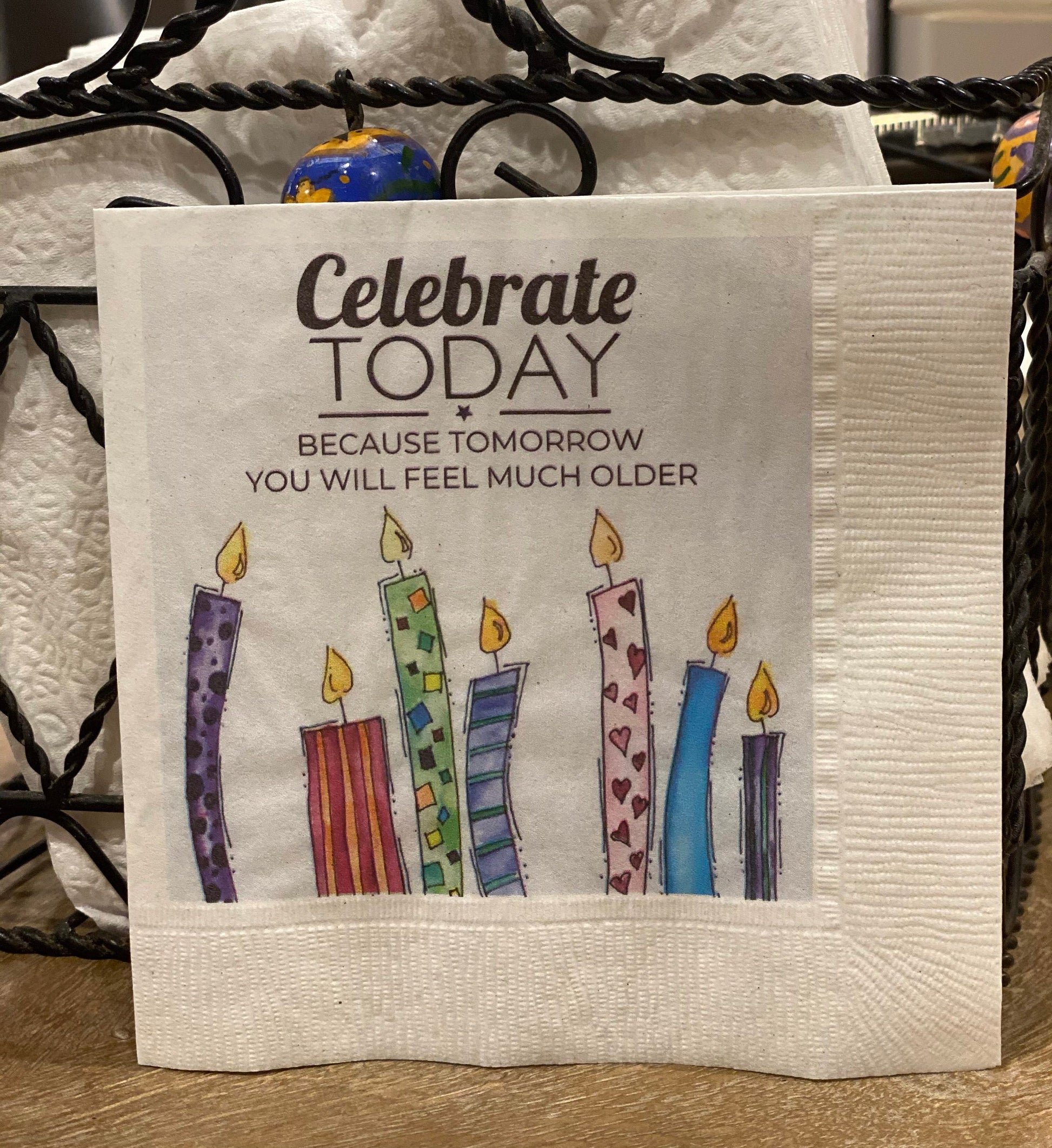 These birthday napkins make a perfect addition to a gift bag or for party decor. Each set includes 20 napkins- 5 original art designs, 4 of each design. The sayings tease about growing older and add a bit of fun to a party. Having multiple designs in the same package is a fun twist. Combine this colorful set with one of the felt board napkin sets about getting older.
