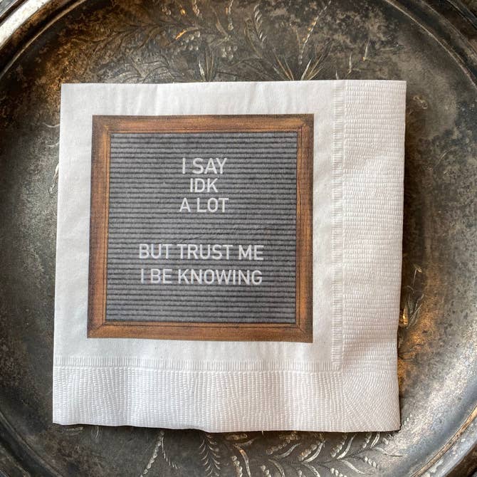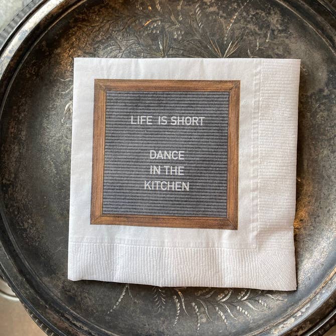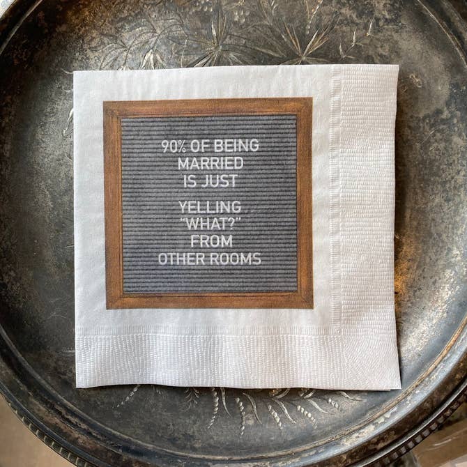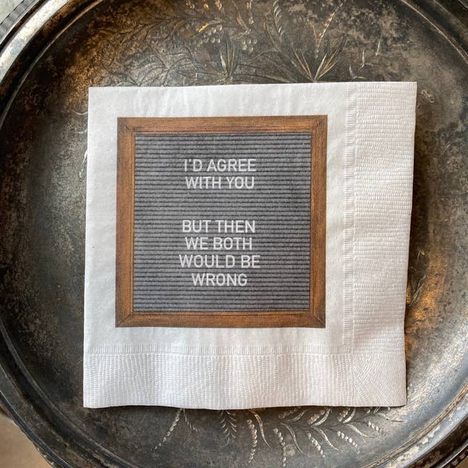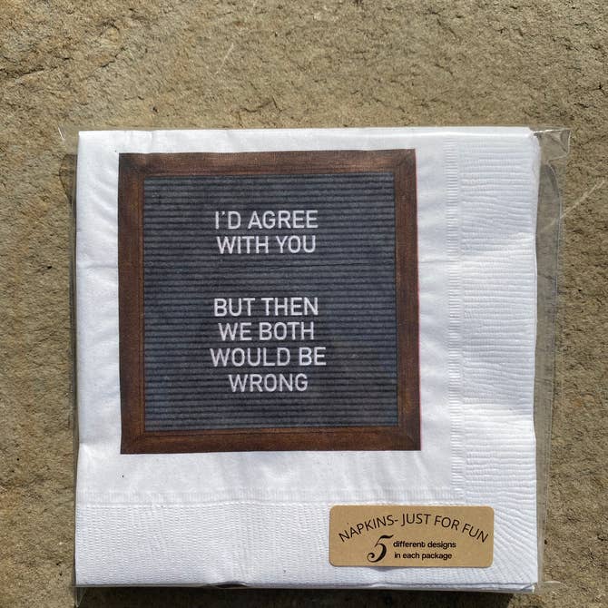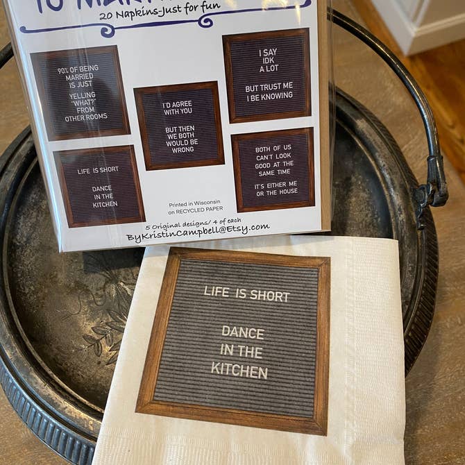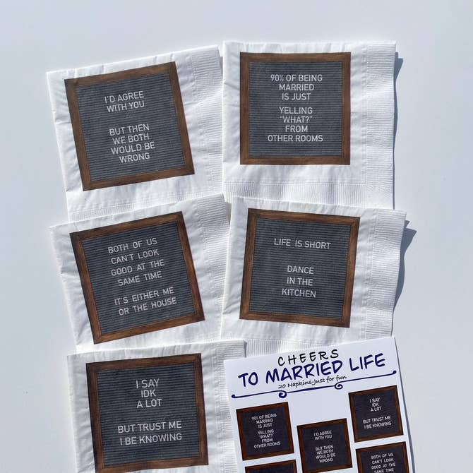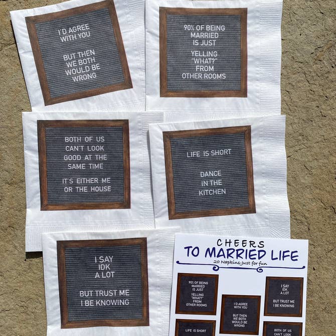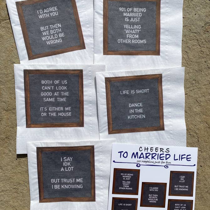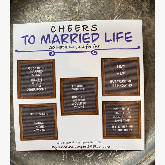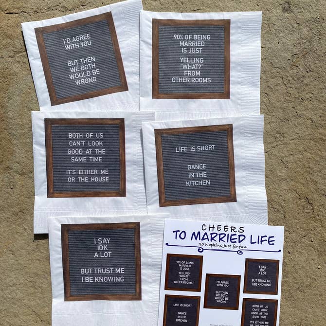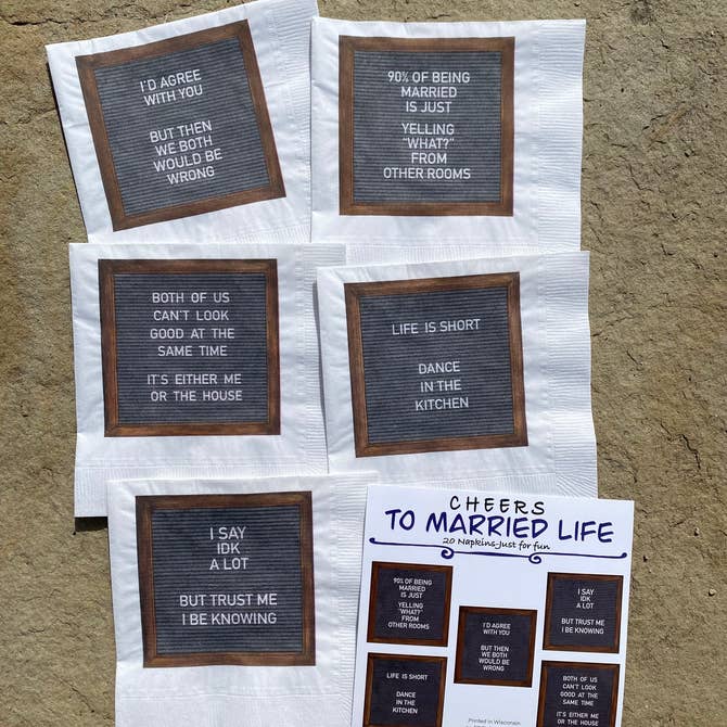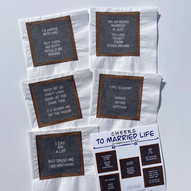 This set of 20 napkins features 5 original designs printed on recycled paper in Oshkosh, WI. The Felt Board quotes focus on marriage and relationships with a bit of humor and honesty. Fun for a wedding shower, anniversary, Valentines Day or just for fun. My napkin sets are unusual in that each package of 20 has multiple designs for guests to enjoy. Napkins come in a plastic sleeve with a card on the back with product info and examples of each napkin in the set. Napkins sell well in a basket near the register-customers can laugh at the quotes and add a few to the purchase. Check out all of the other Cheers Napkin sets