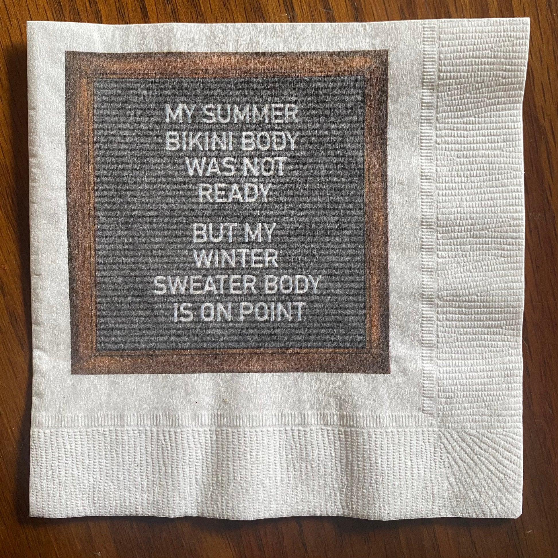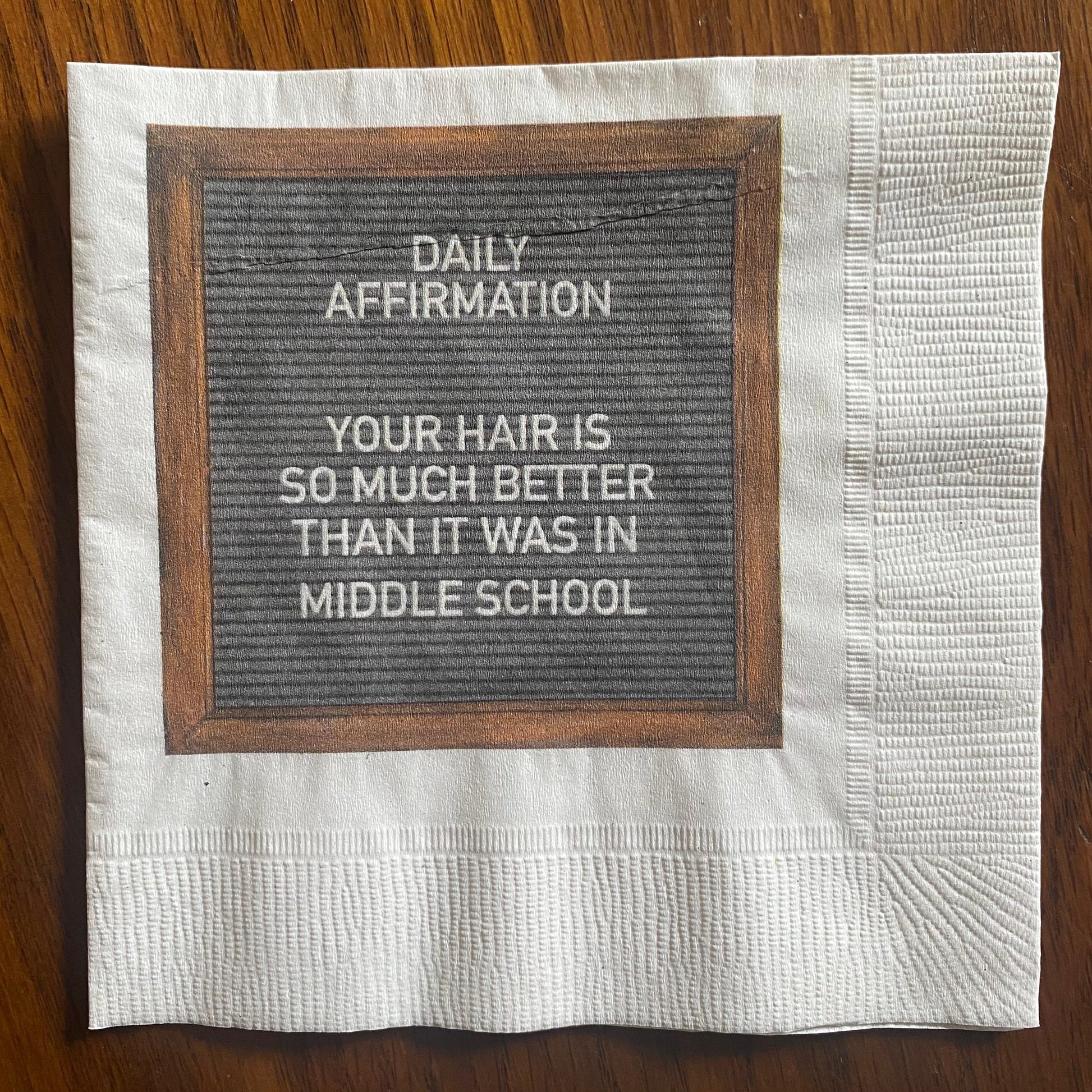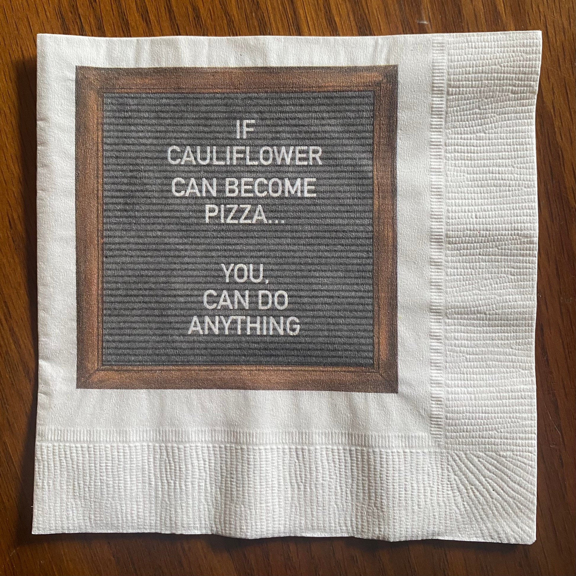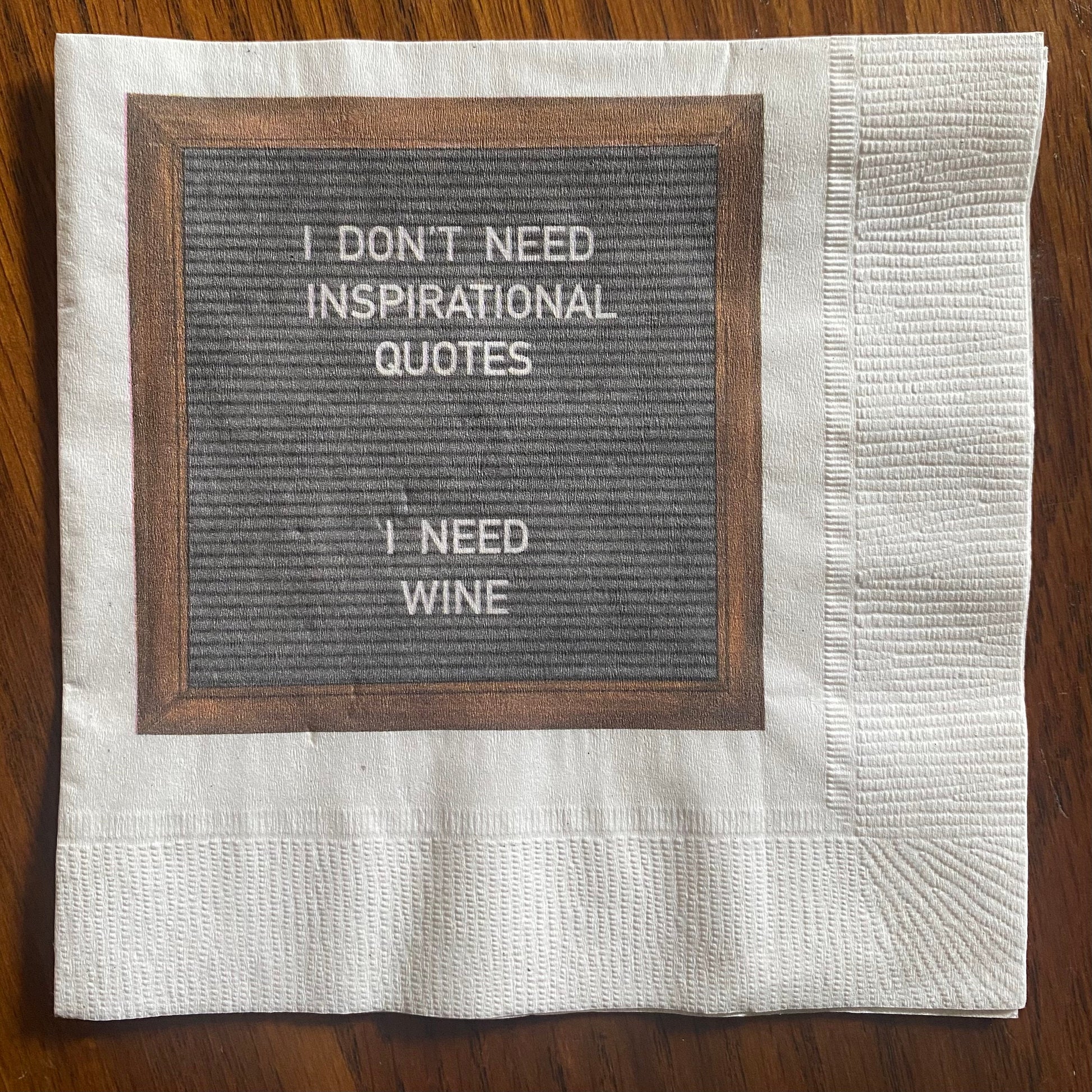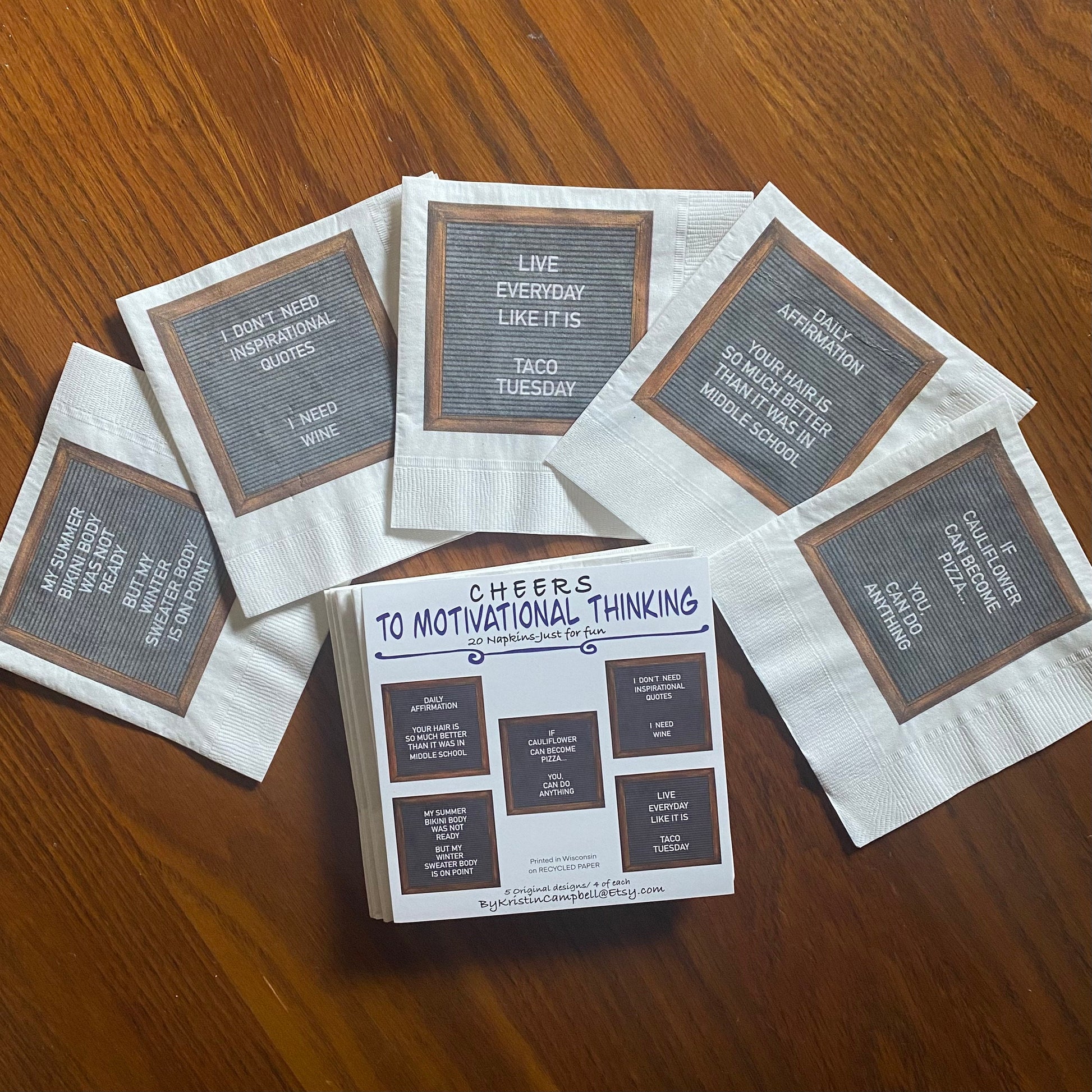 This cheerful set of napkins is designed to look just like a felt message board. Each set of 20 napkins includes 5 different funny quotes to help with motivational thinking or to perhaps poke a little fun at motivation. A fun gift for someone who needs a pick me up or for your next gathering of friends who need a laugh. Add this to a gift basket or a wine bag just for fun. Napkins are designed and printed in the US on recycled paper and measure 3.5” x 3.5”. Combine this set of napkins with some of my other napkins like "Cheers to Optimism" for even more fun. Enjoy
