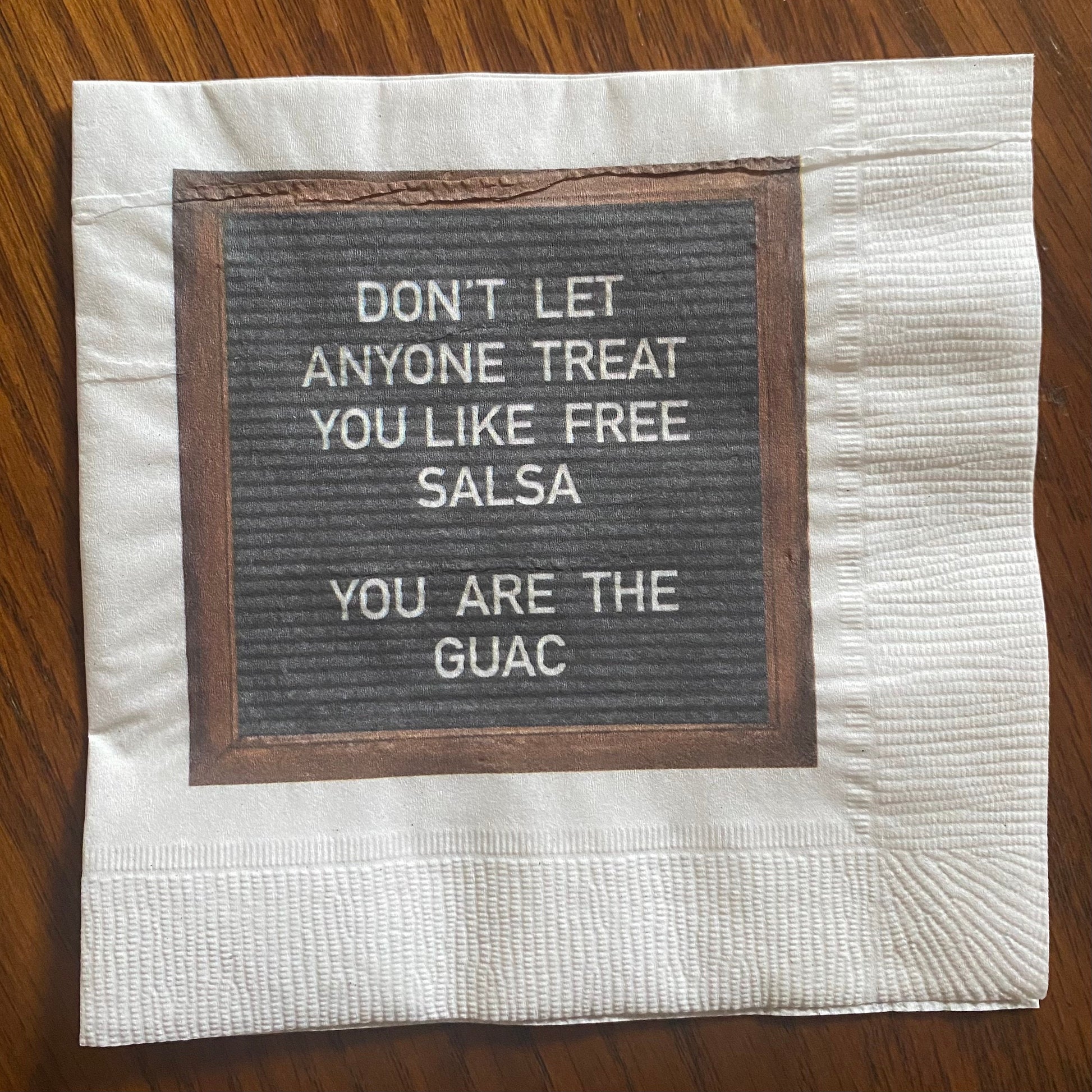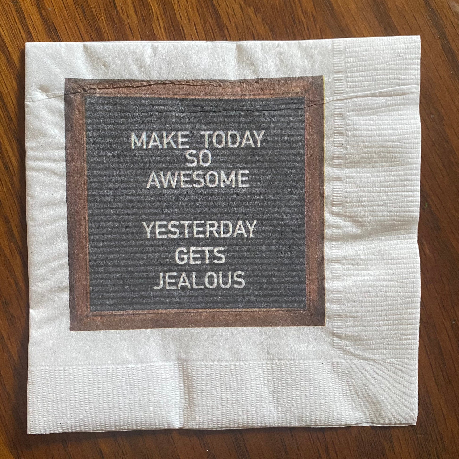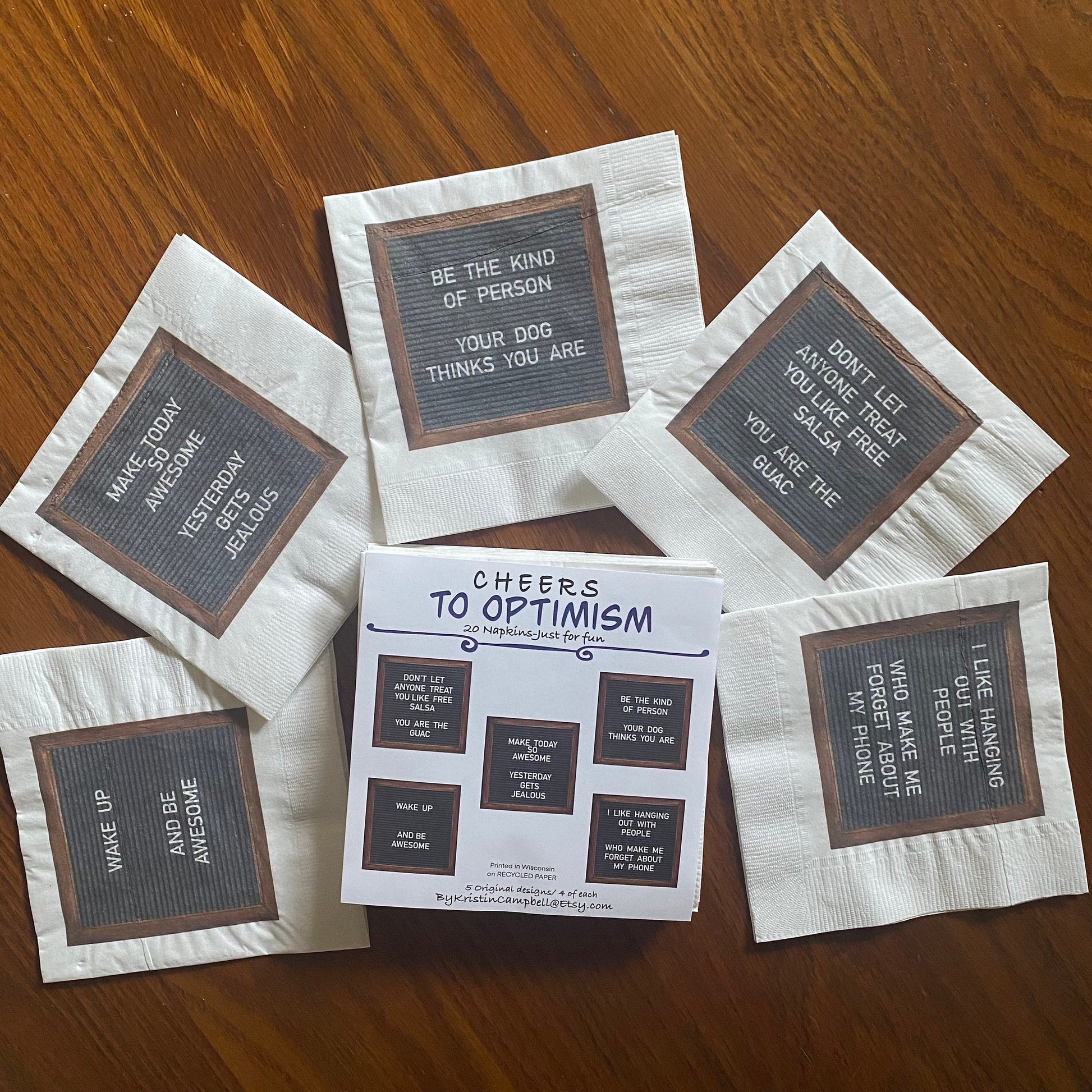 This fun collection of quotes is labeled CHEERS TO OPTIMISM, but they could apply to everyday life, a moment when someone needs a bit of encouragement or just to laugh at a social gathering. Each napkin set includes 20 napkins designed to look just like a felt message board. 5 different quotes are included in each set to keep guests entertained. Napkins are designed and printed in the US on recycled paper. Beverage napkins measure 3.5”x 3.5”. Check out my other designs and mix and match them for the perfect set.