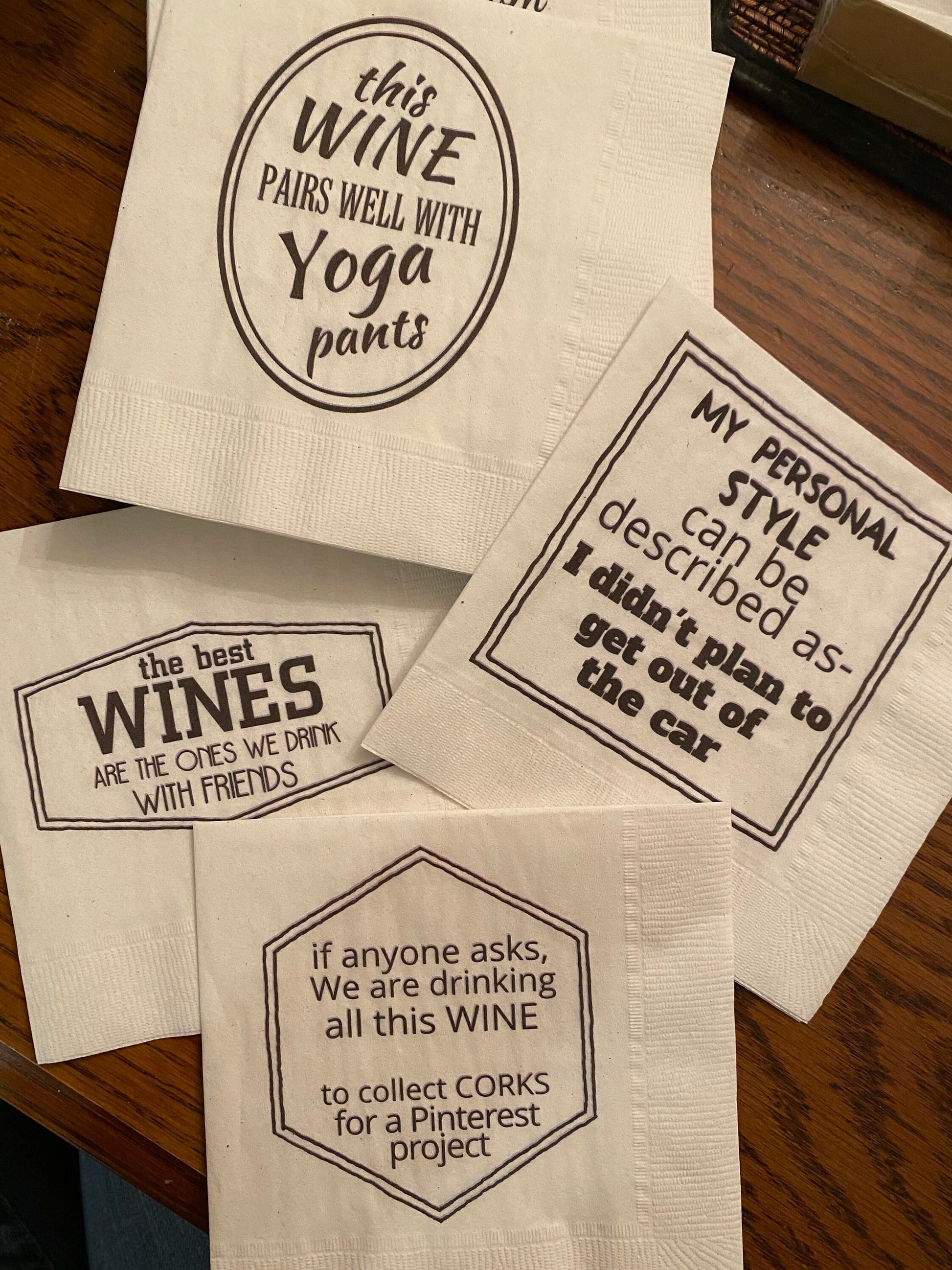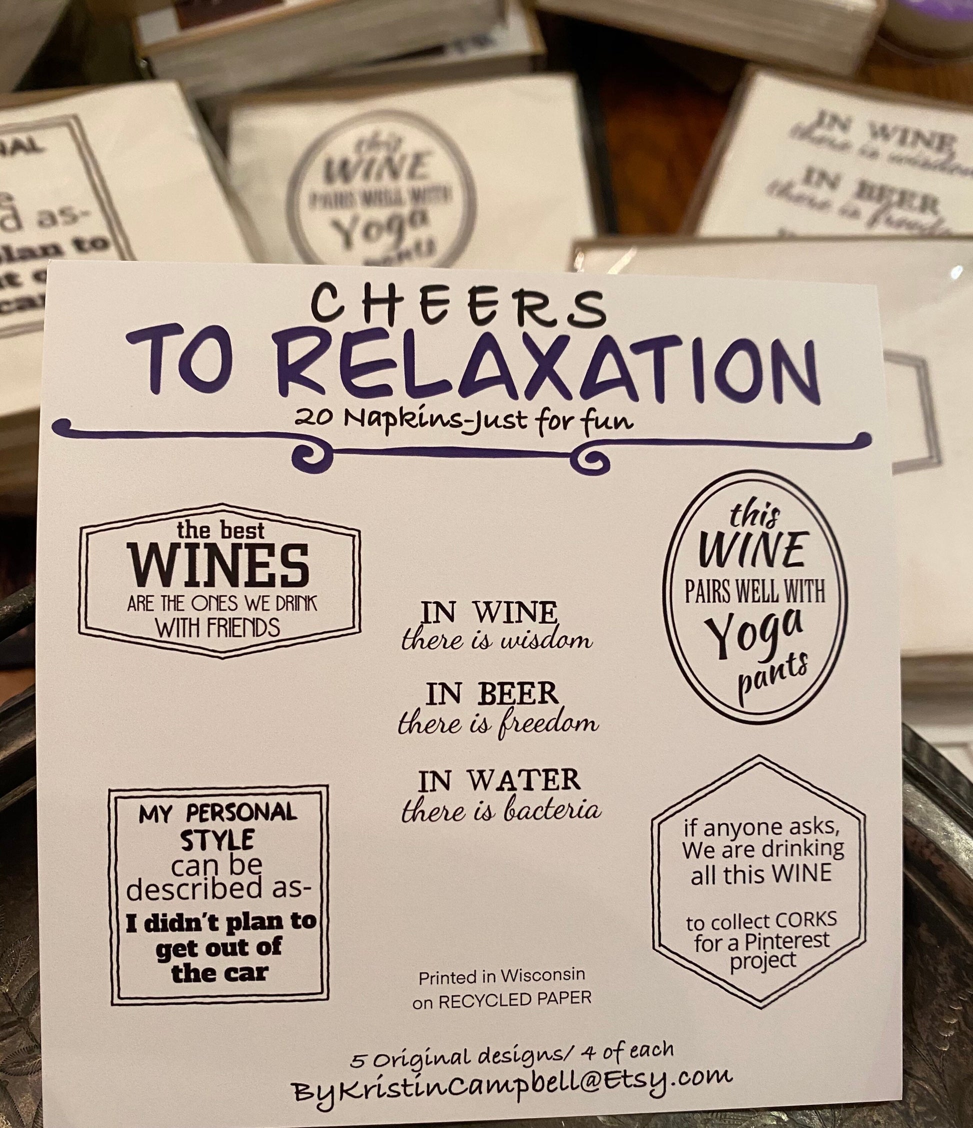 Each package contains 5 original just for fun designs/ 4 of each. Napkins are printed in Wisconsin on recycled paper.
