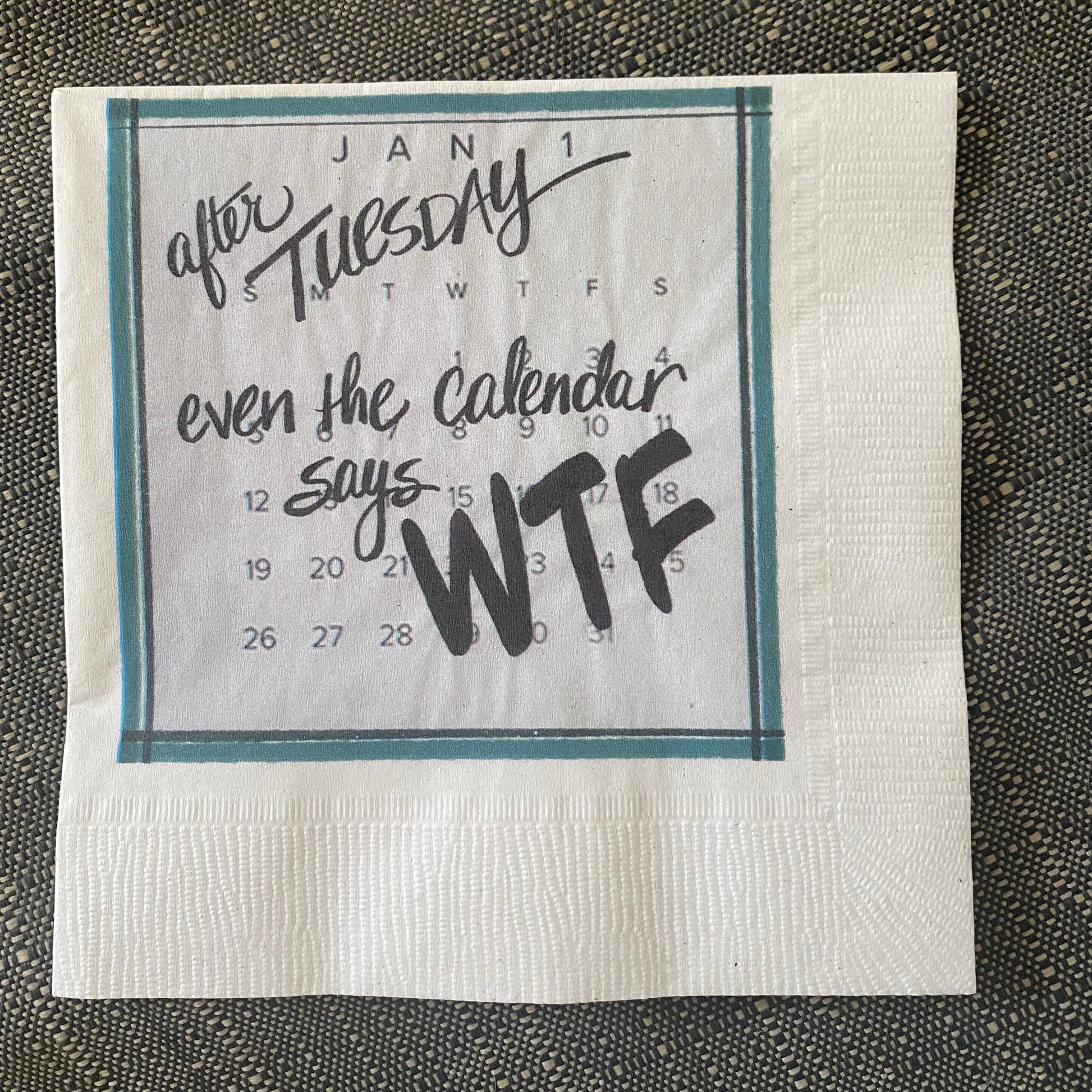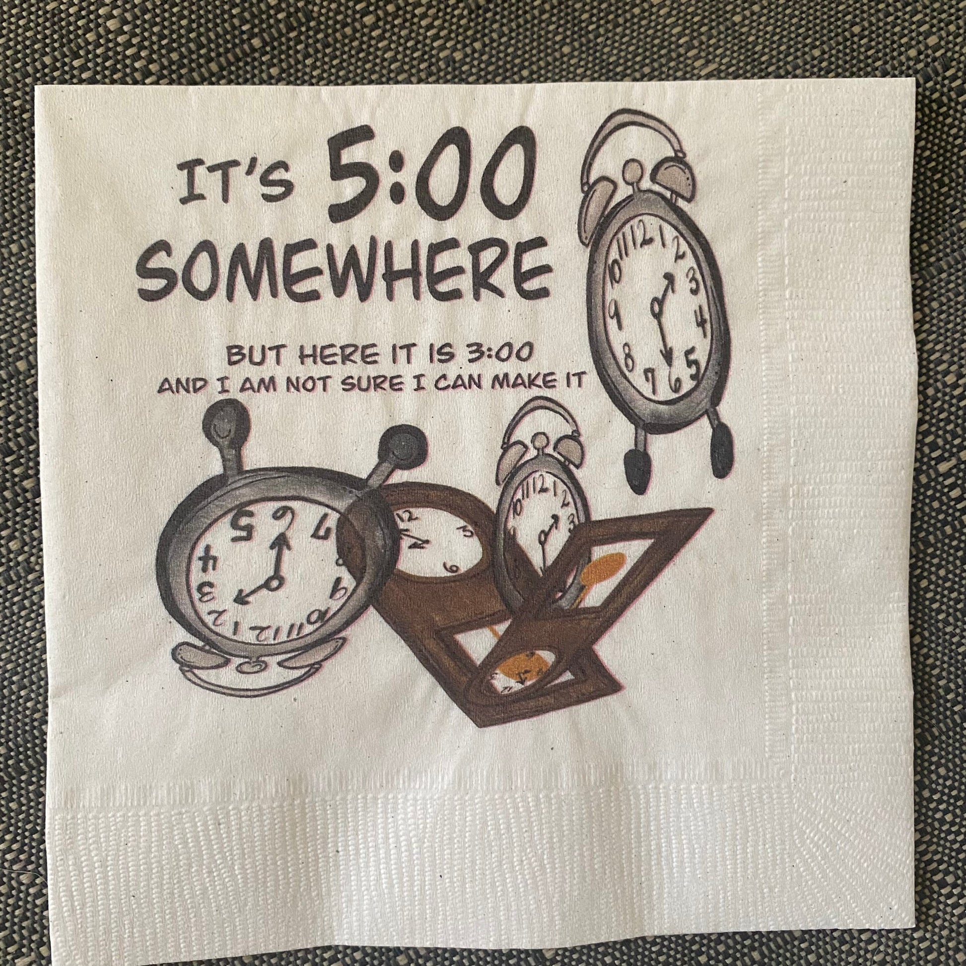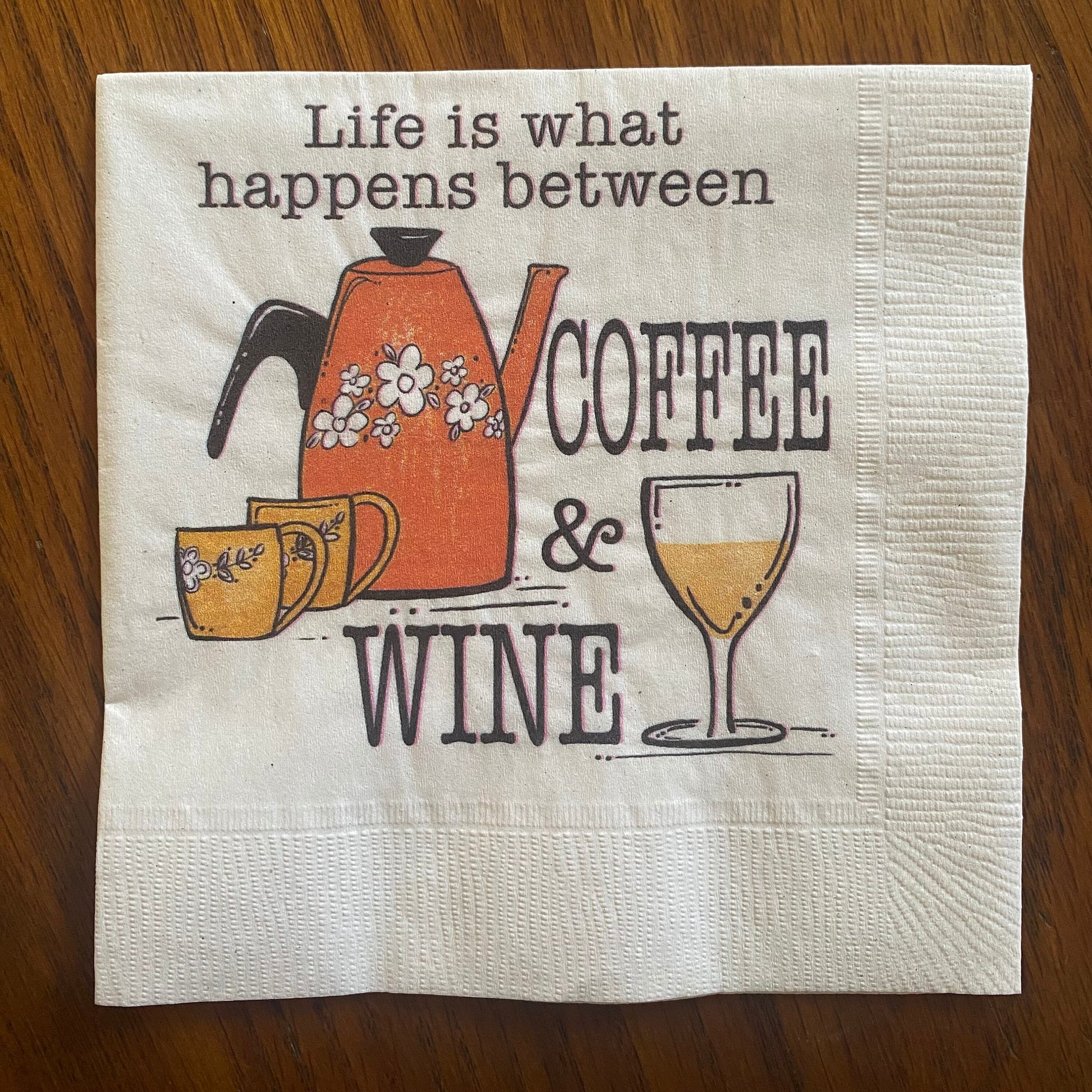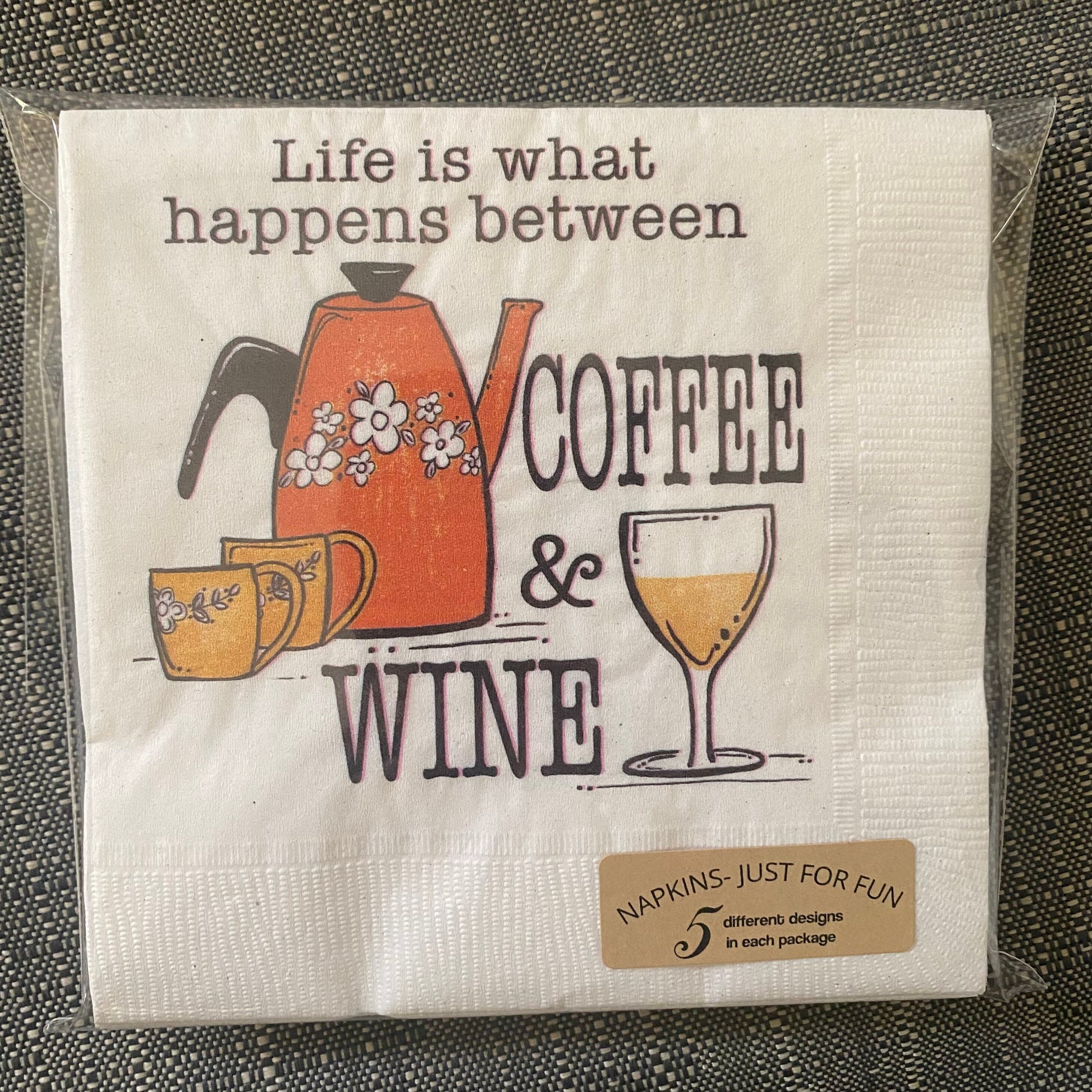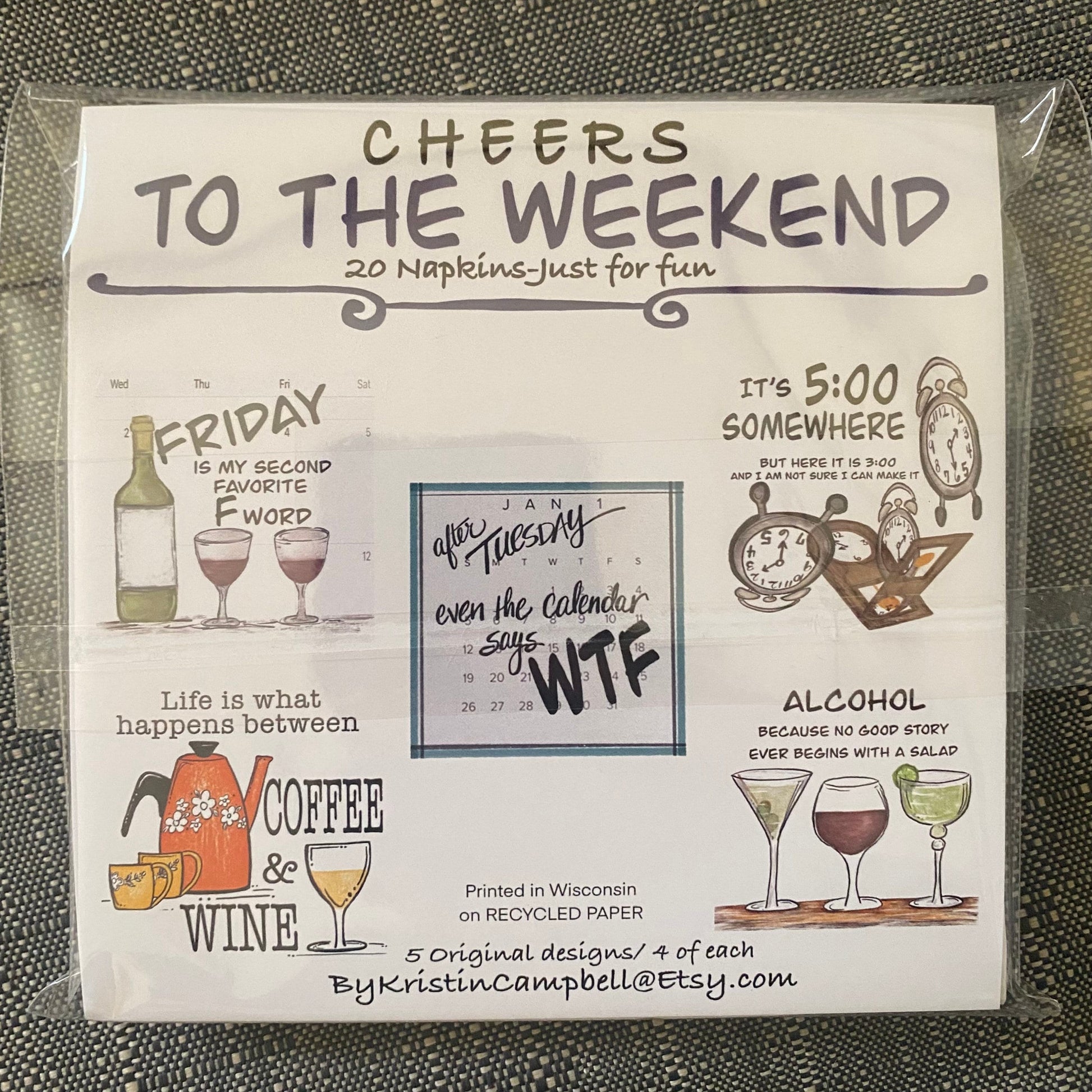 Add a bit of fun to your next gathering with this colorful set of napkins. Unlike most napkin packages this set includes 5 different napkin designs each with a funny quote about the weekend along with my original artwork. Napkins are printed in the US on recycled paper- Beverage napkin size 3.5”x 3.5”. A set of napkins comes individually packaged with a label on the back making it also an easy gift to add to any package or wine bag.