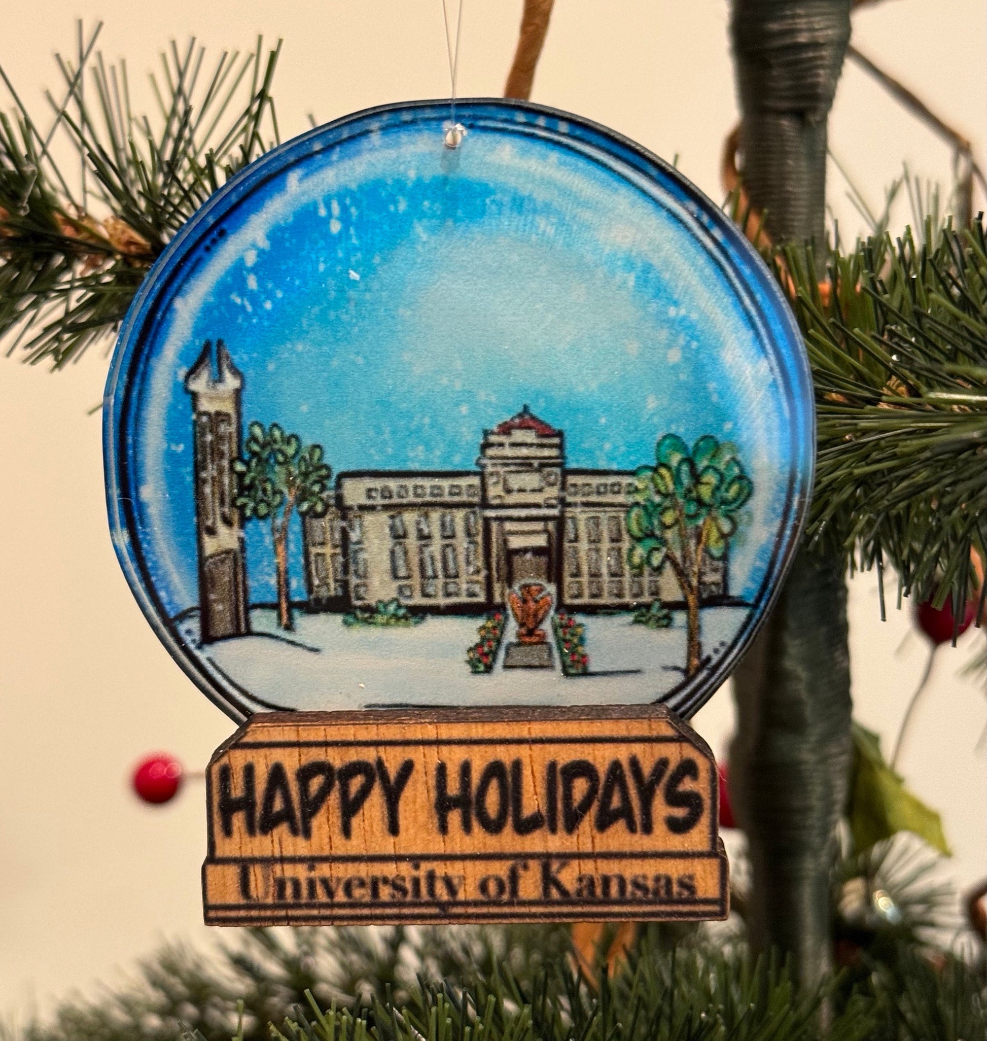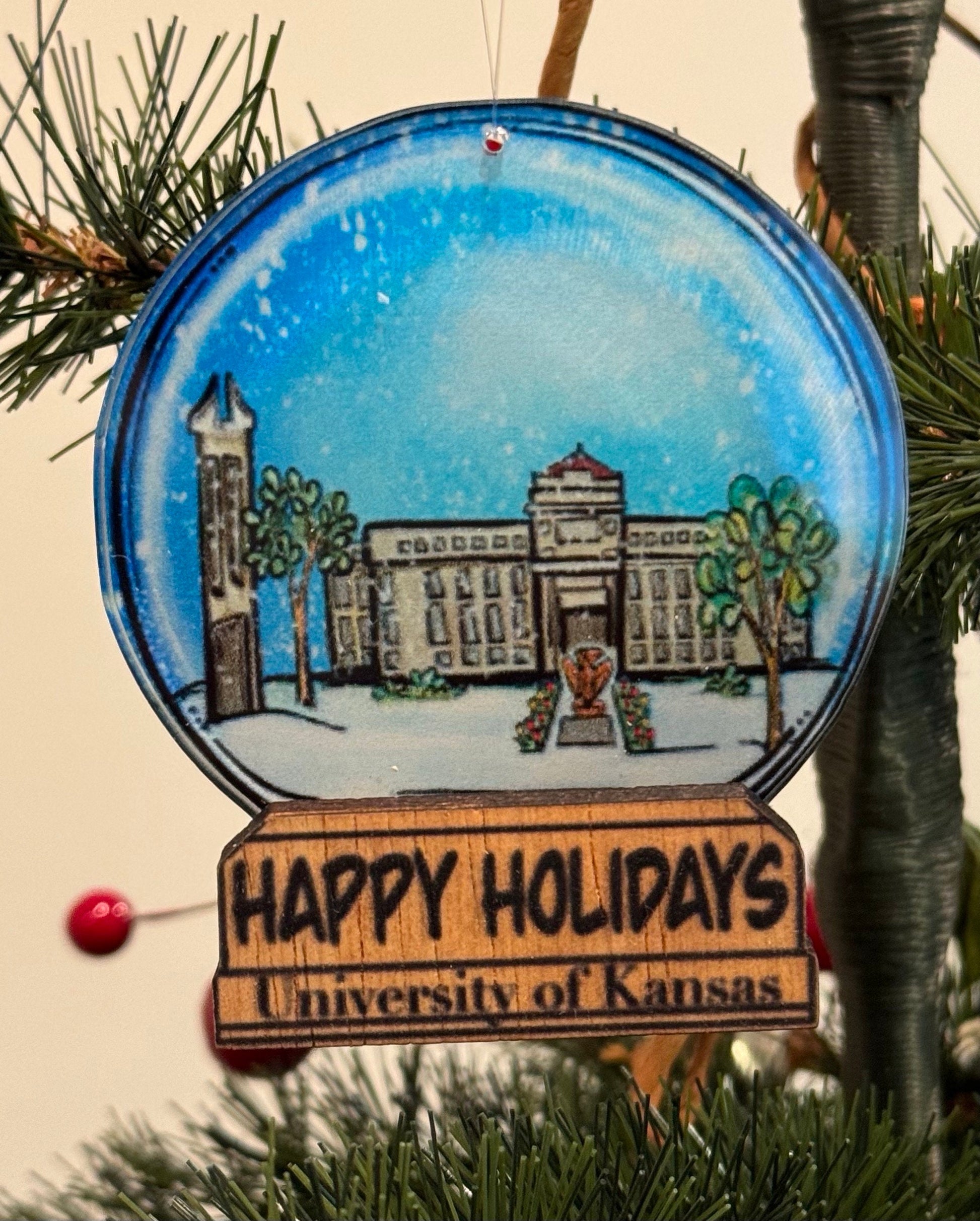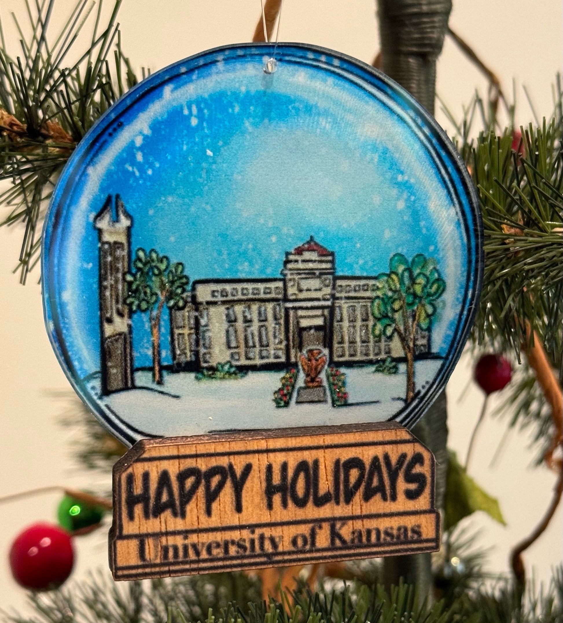 A fun keepsake from Kansas this beautiful ornament is designed to look exactly like a snow globe. The original watercolor artwork features the Campanile, and Strong Hall. The art has been professionally laser printed on a piece of acrylic so a bit of light will shine through on the tree. The base is a piece of wood with the words Happy Holidays- University of Kansas. A fun gift for those with ties to the University of Kansas or a nice keepsake for those who want to remember a visit to Lawrence. Check out the other University of Kansas Ornaments I have available. ROCK CHALK JAYHAWK