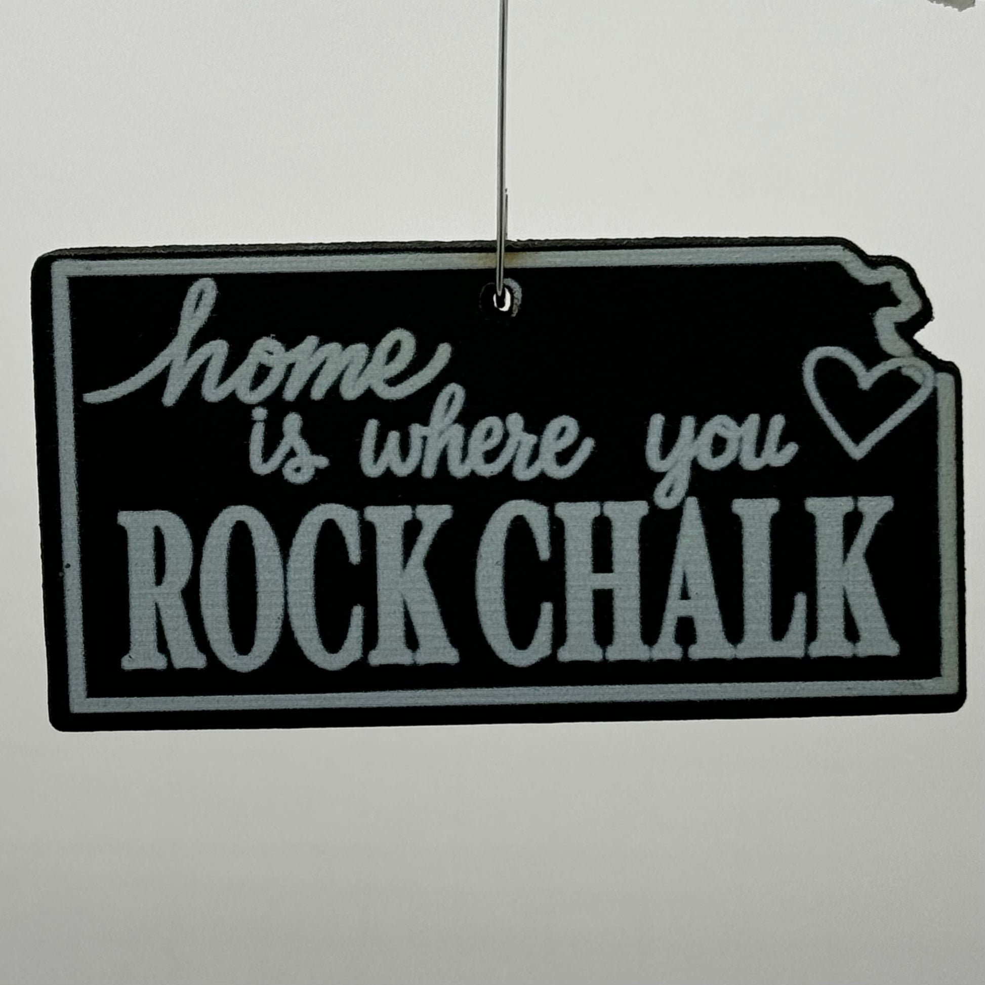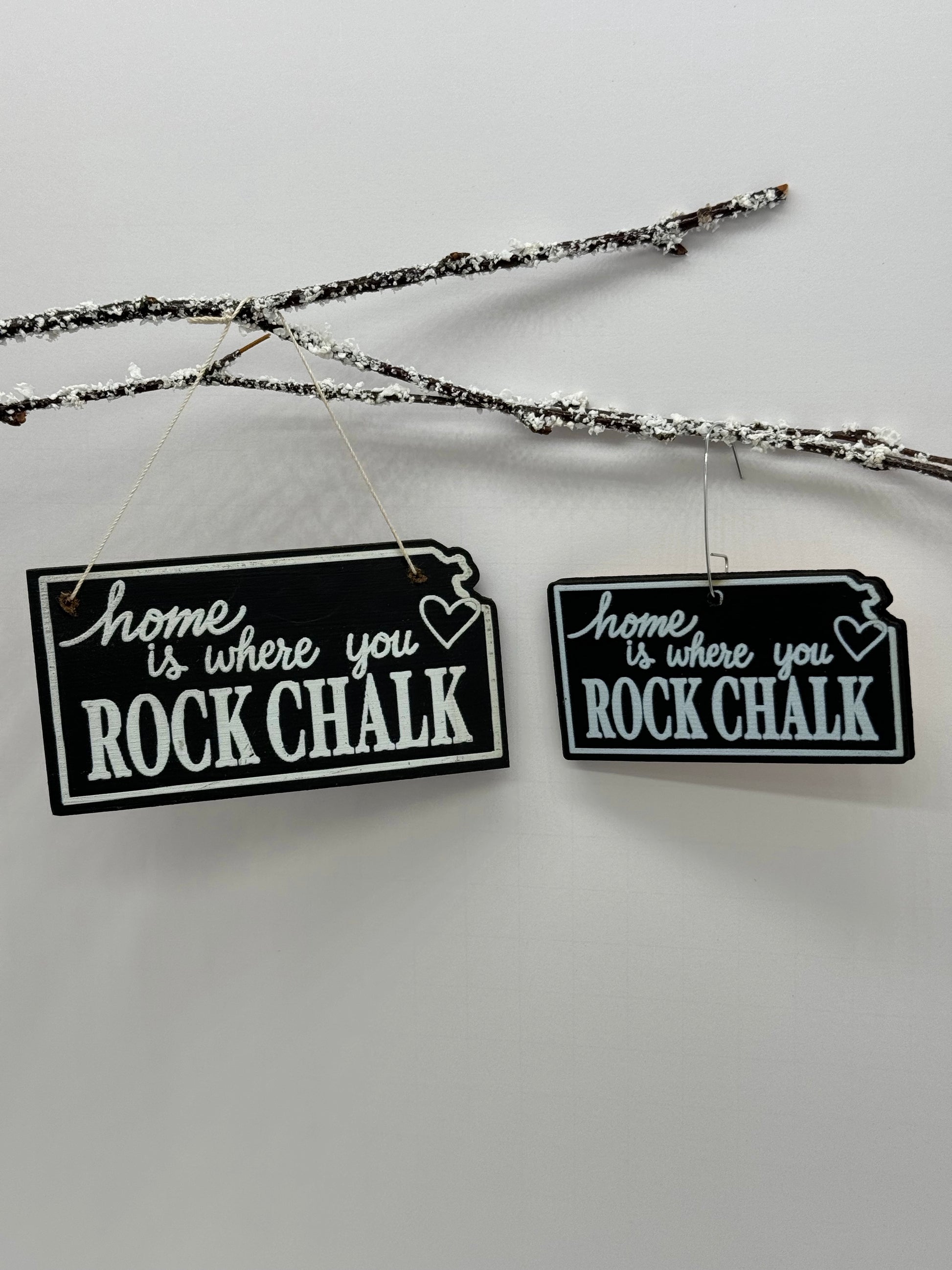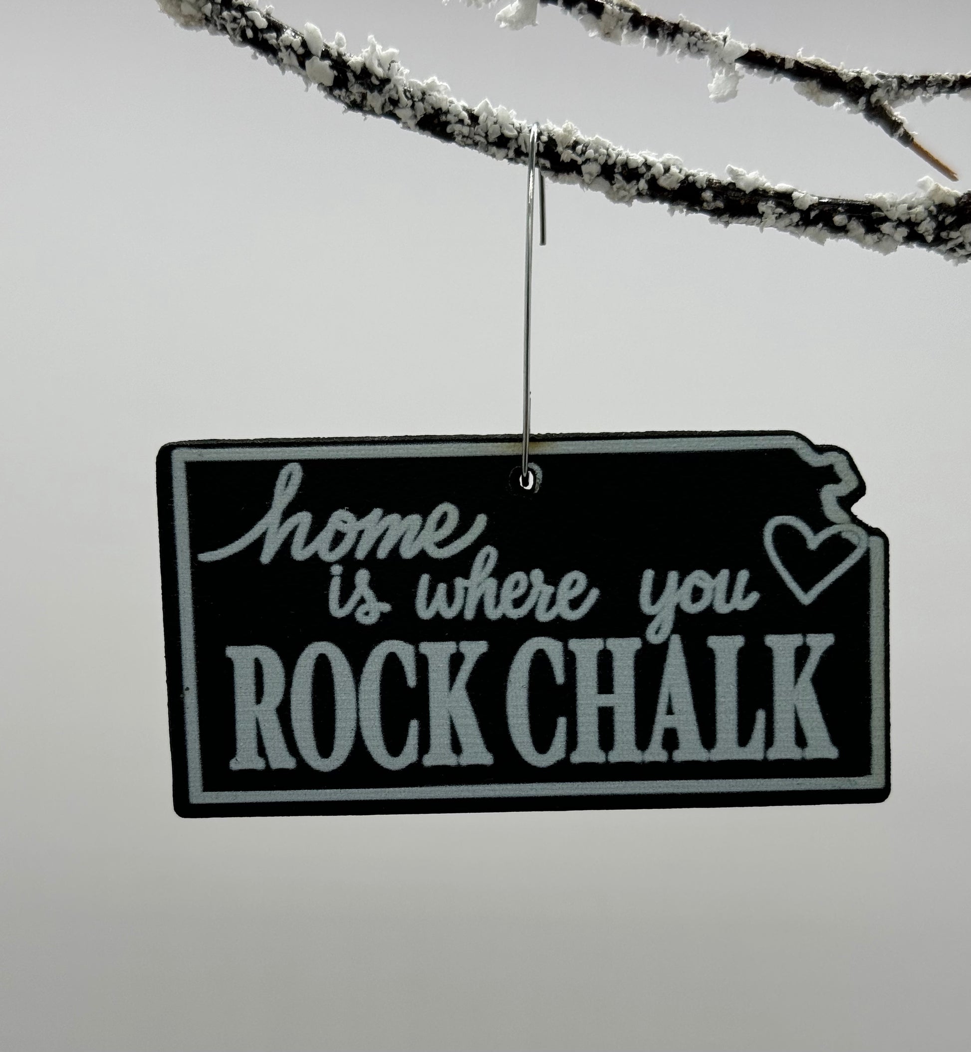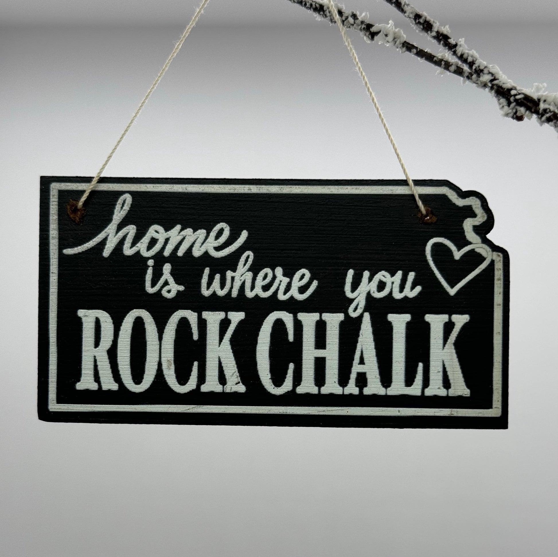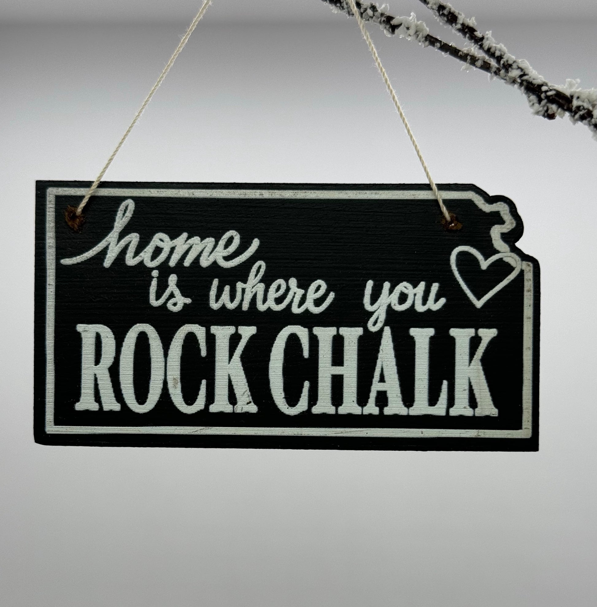 This ornament was designed to look just like an old-fashioned chalkboard. Ornaments are cut in the shape of Kansas and has been professionally printed with the words “home is where you ROCK CHALK” and a heart over Lawrence. A fun gift idea for Jayhawk fans near and far. This ornament design is available in two sizes. The large ornament is 4” across and the small ornament is 3” across. Choose the ornament that is just right for your tree.