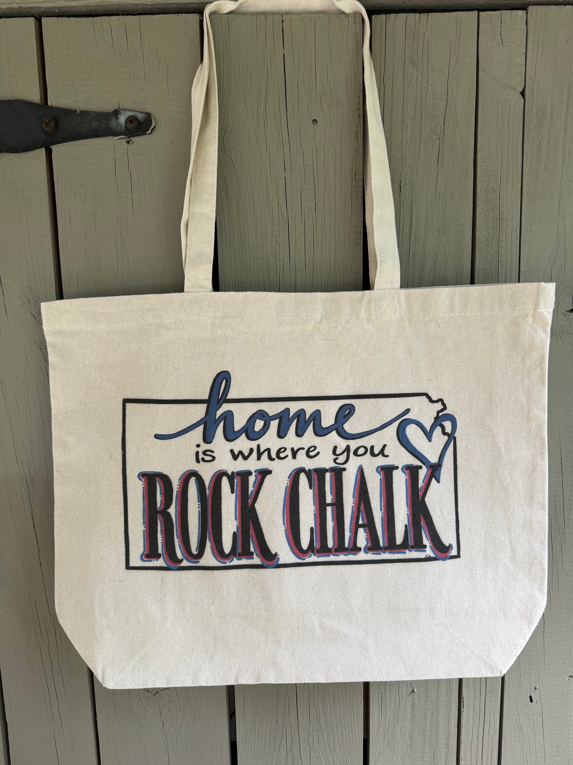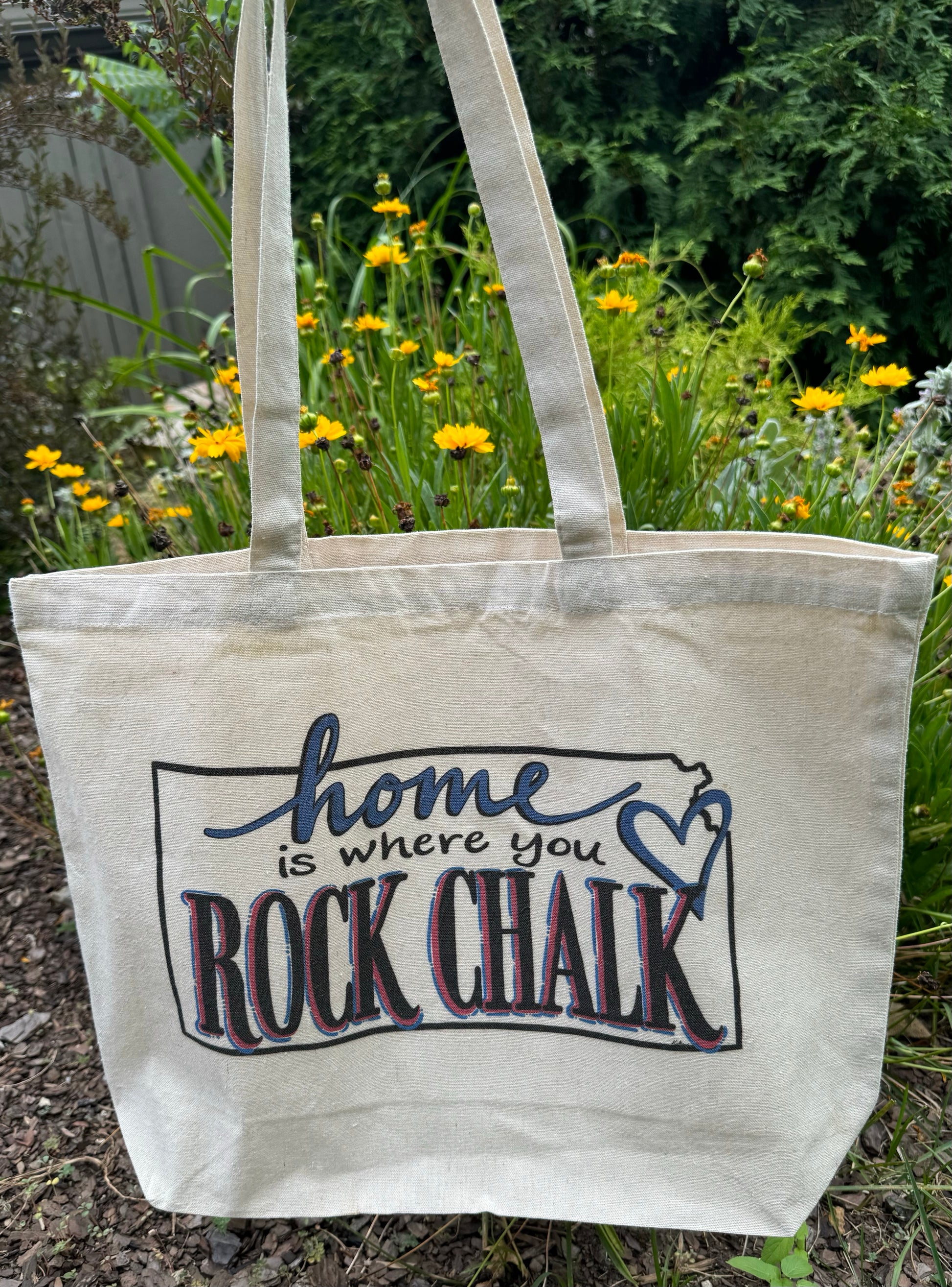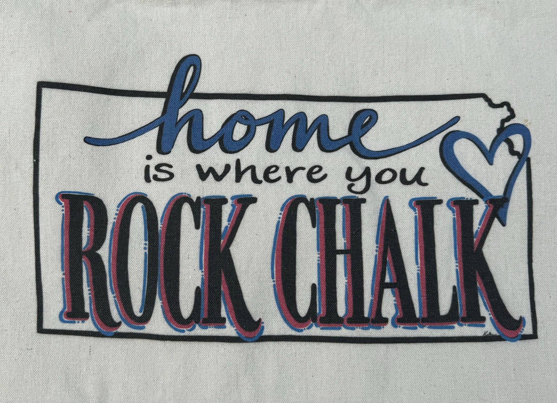 This heavy canvas tote bag features the outline of Kansas in black with the words “Home is Where You Rock Chalk” in color. A huge blue heart covers Lawrence and the surrounding area. Each tote has been professionally printed directly into the fabric. It will not fade or peel. The words “Home is Where you A fun gift option for Jayhawk fans near and far. The tote bag measures about 13” x 19” and has strong woven handles and a 3” gusset bottom.