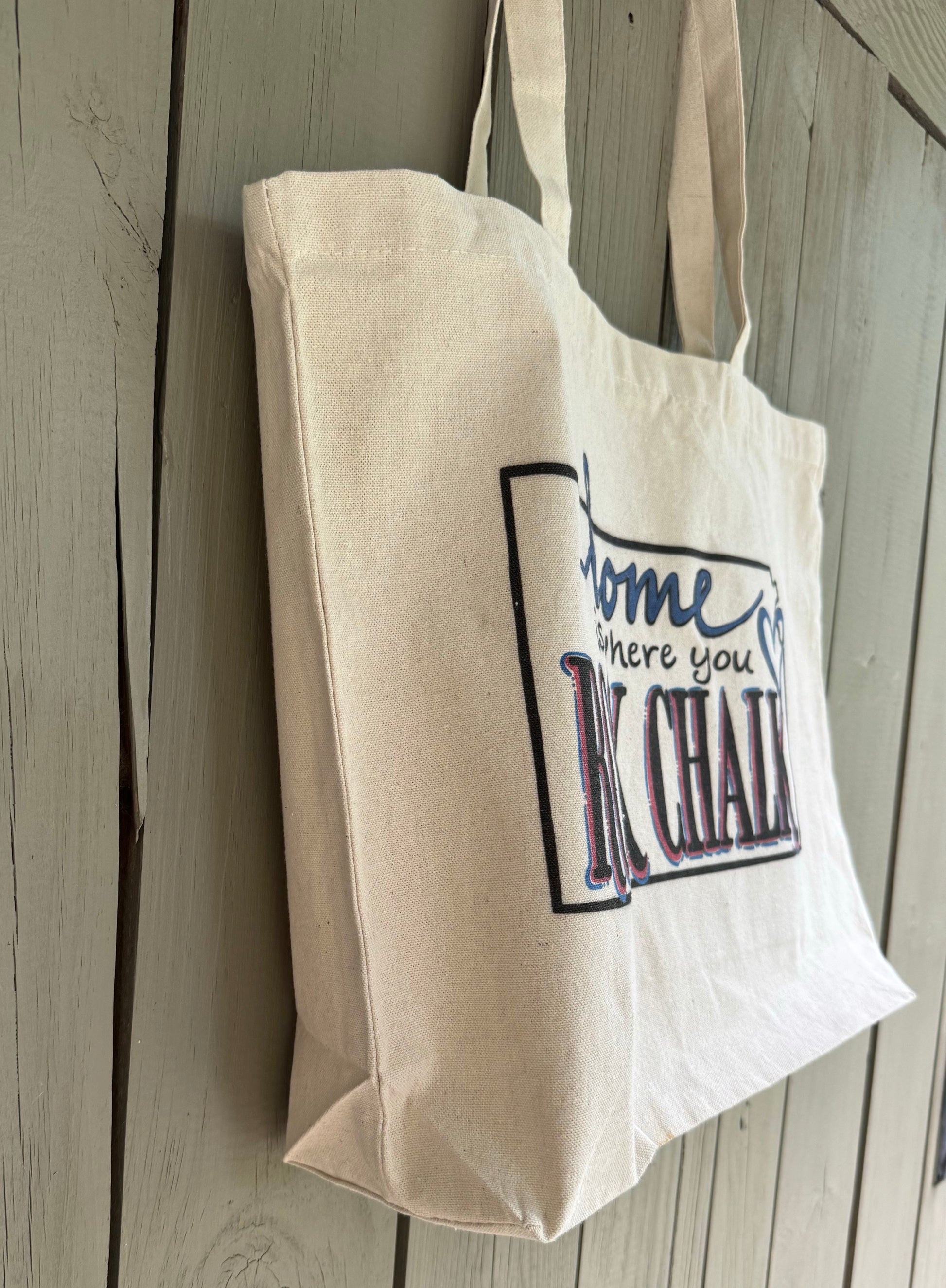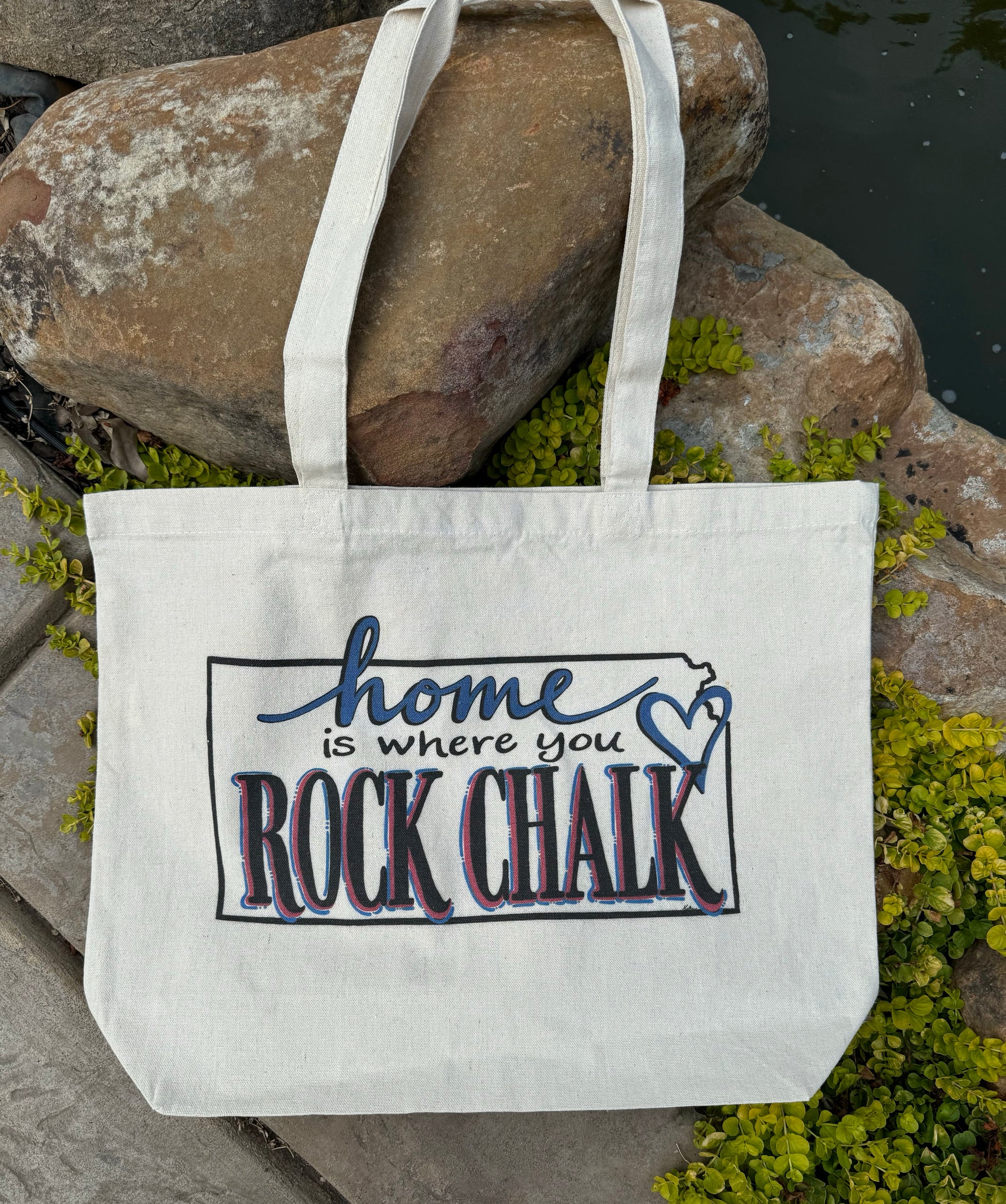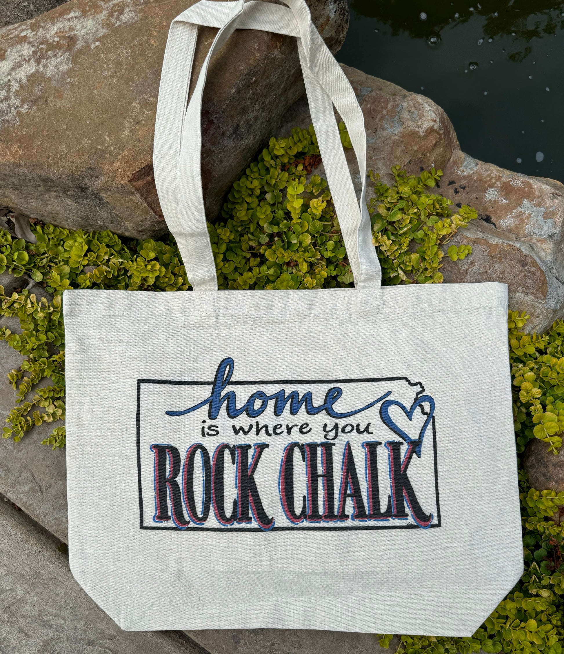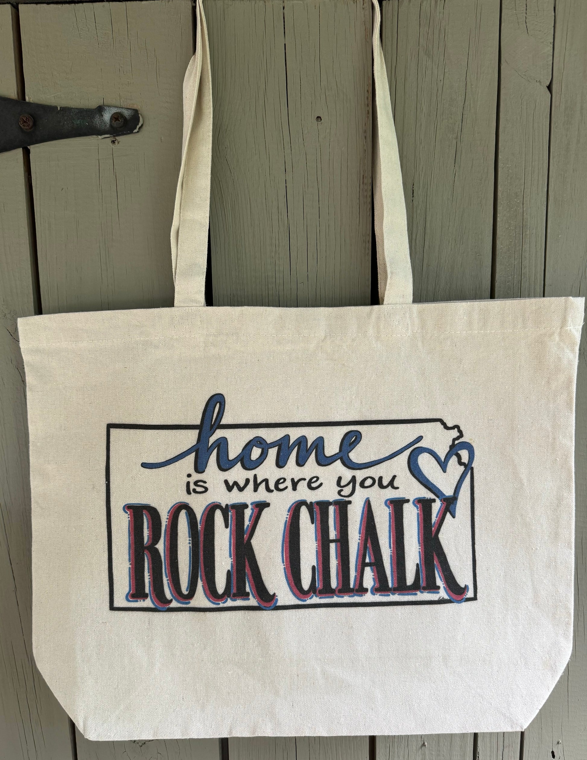 This heavy canvas tote bag features the outline of Kansas in black with the words “Home is Where You Rock Chalk” in color. A huge blue heart covers Lawrence and the surrounding area. Each tote has been professionally printed directly into the fabric. It will not fade or peel. The words “Home is Where you A fun gift option for Jayhawk fans near and far. The tote bag measures about 13” x 19” and has strong woven handles and a 3” gusset bottom.