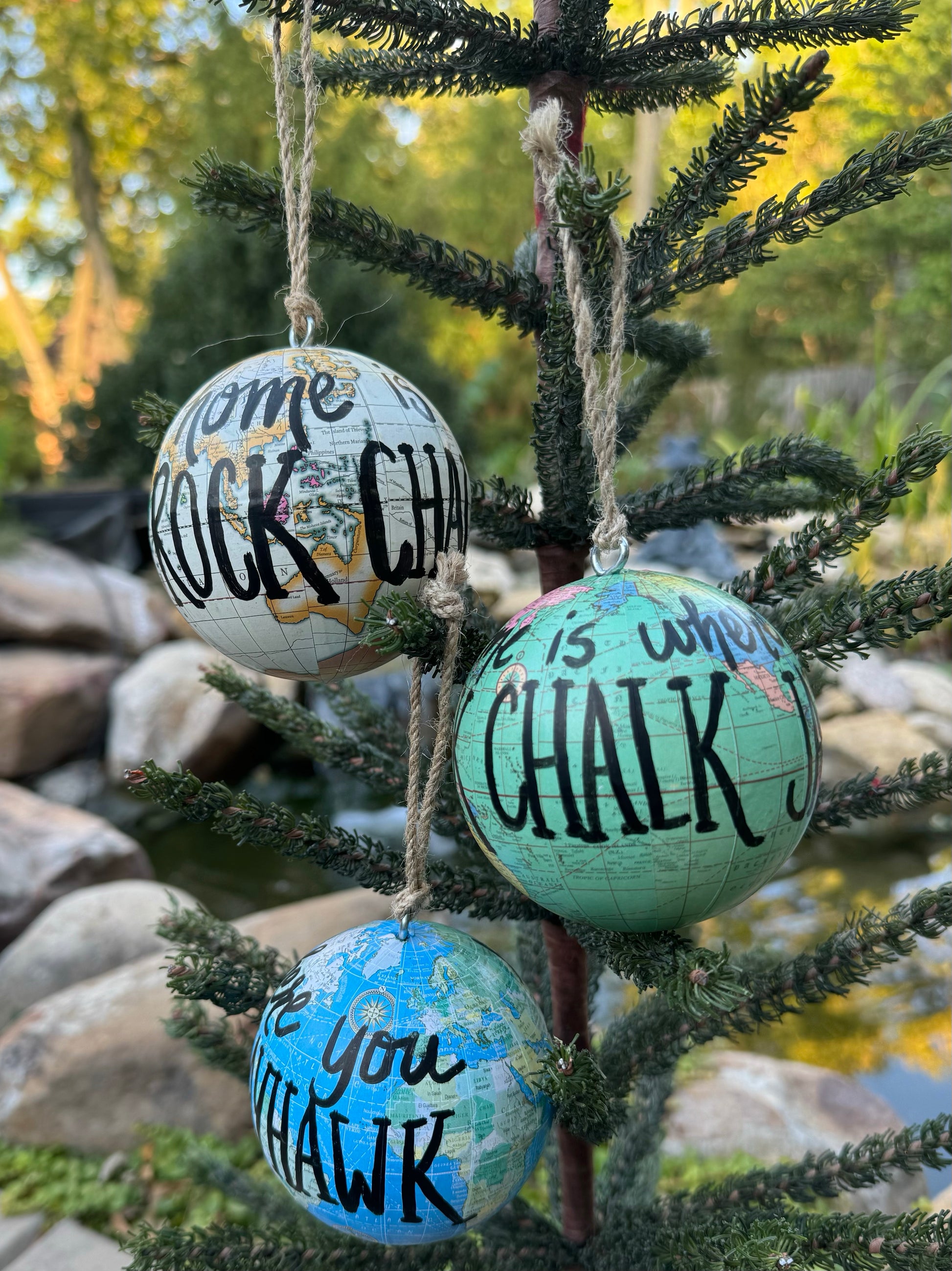 The paper mache map globe ornaments have been hand painted with the words “home is where you Rock Chalk Jayhawk”. Add this fun, colorful ornament to any tree with a little love for the Jayhawks. Ornaments come in assorted colors, tan, green and blue. If you prefer a specific color please leave a note. All ornaments are hand painted and there will be slight differences in lettering. Ornaments measure a little more than 3” in diameter and come with a natural jute hanger.