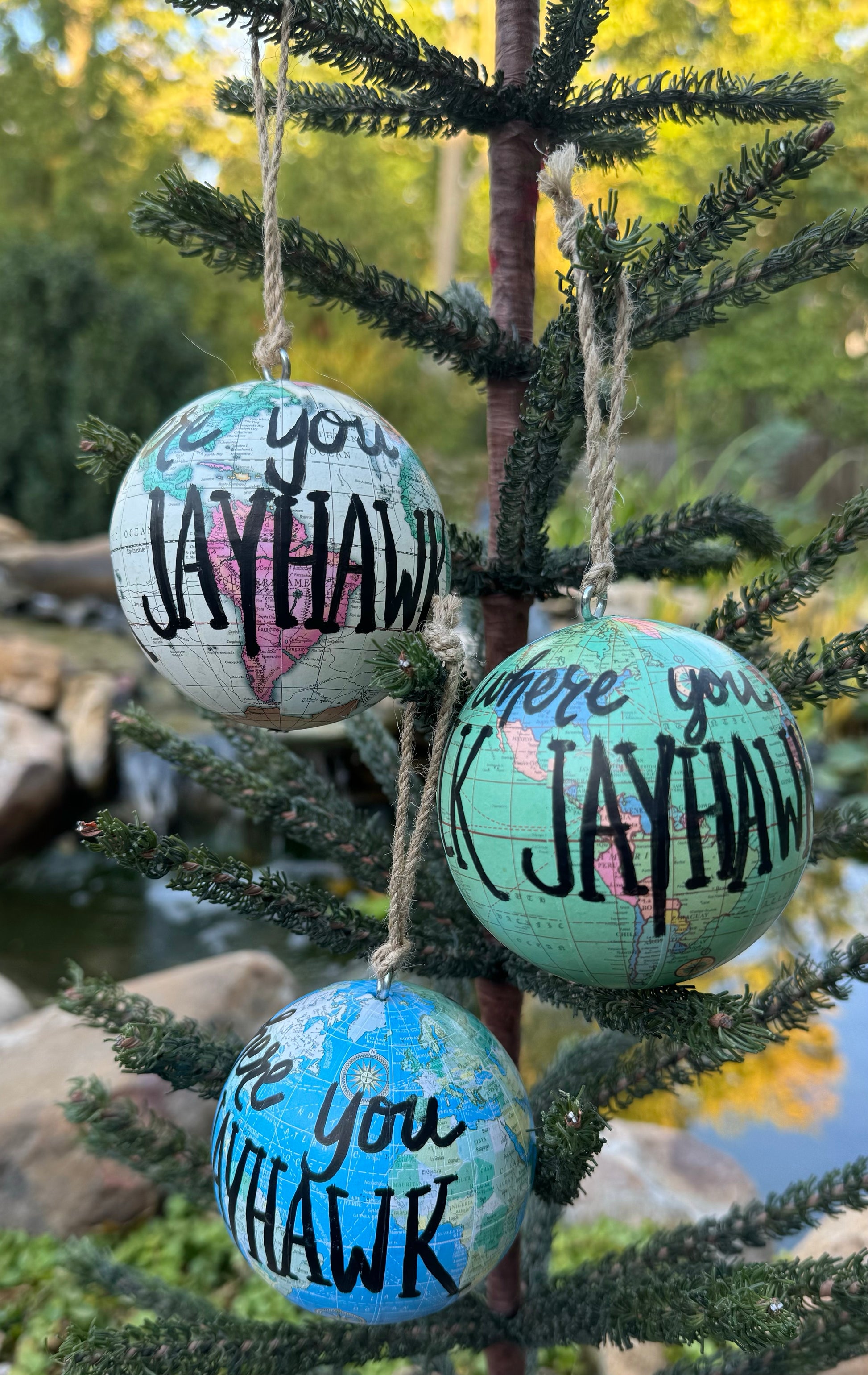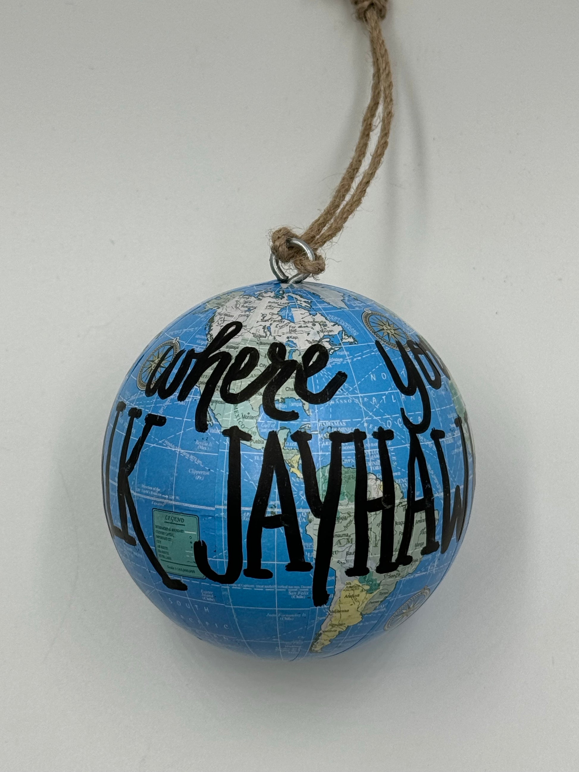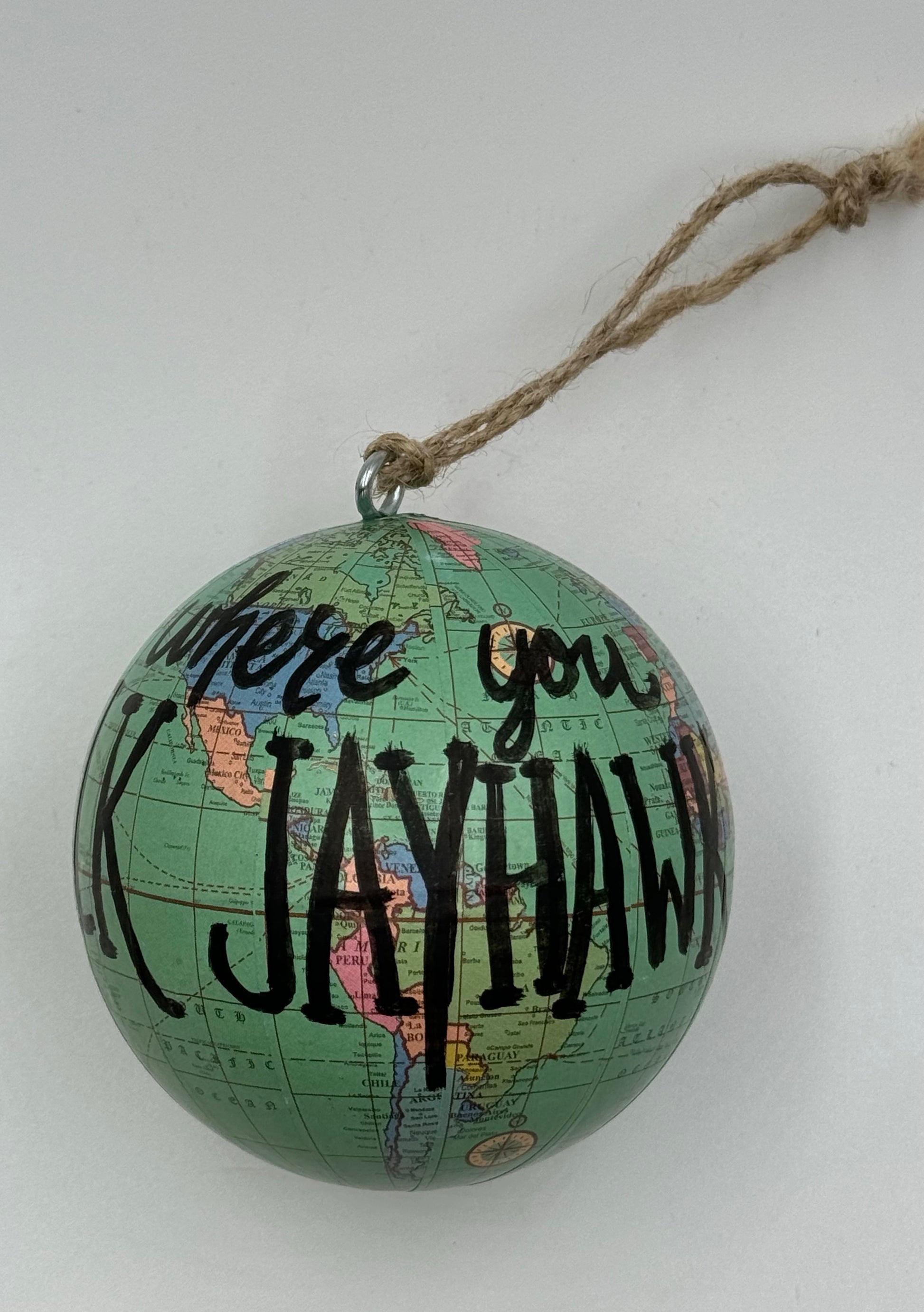 “Home is where you Rock Chalk Jayhawk” Map Globe Ornament