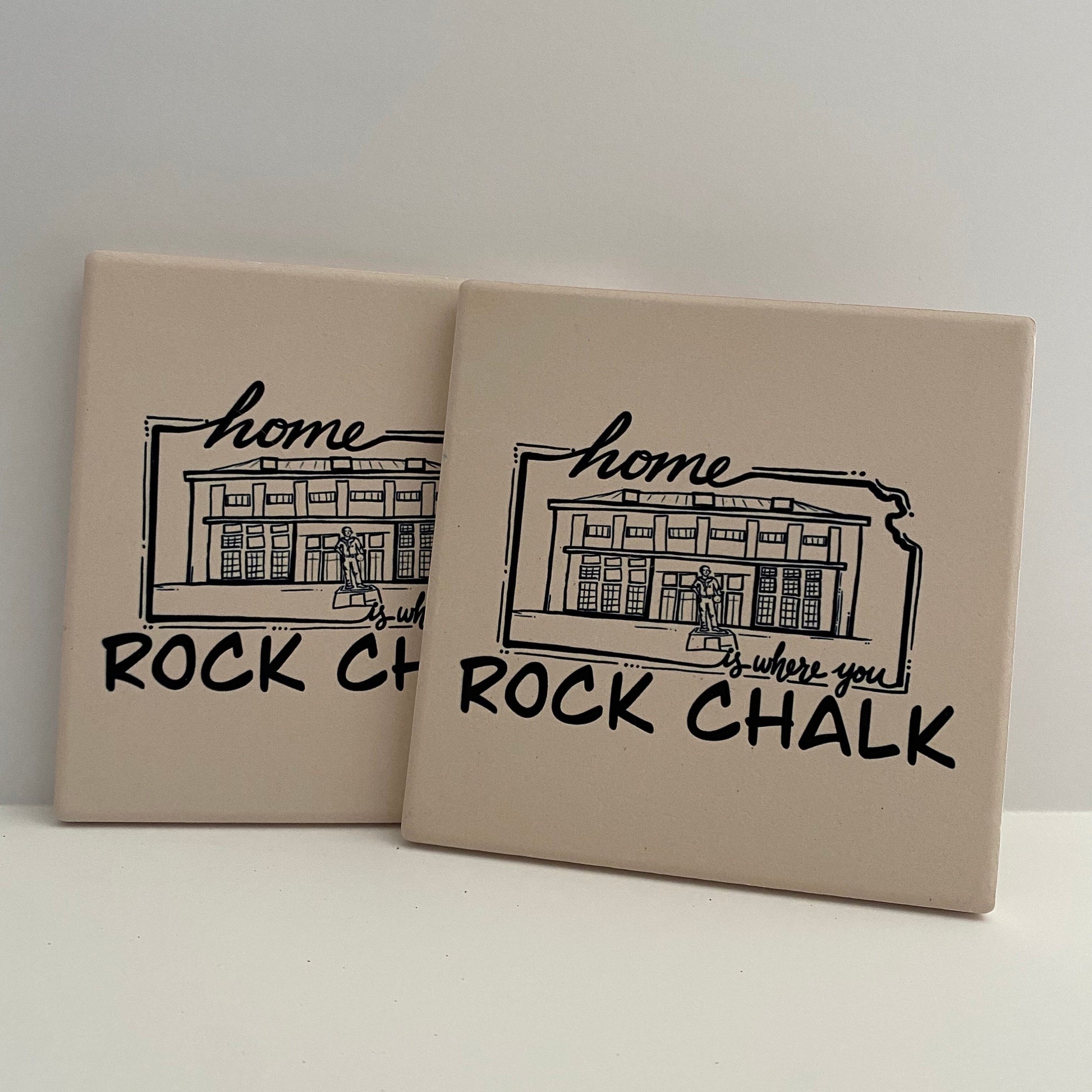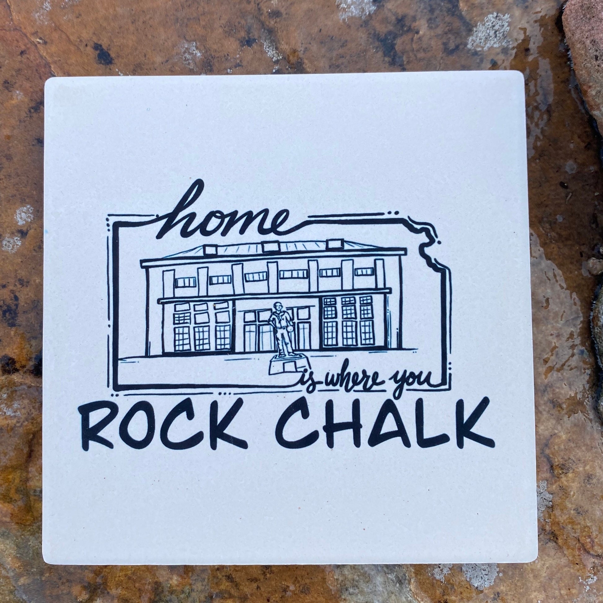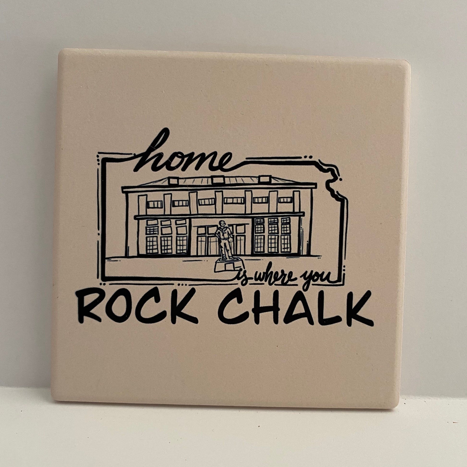 This absorbent stone coaster measures 4.25”x 4.25” and has a full cork back to protect surfaces. The artwork has been permanently sublimated directly into the stone and will not fade or scratch over time. The artwork features a simple outline of Kansas with the words “home is where you Rock Chalk” A sketch of Allen Fieldhouse fills the outline of the state. Simple and neutral this coaster can match any decor.