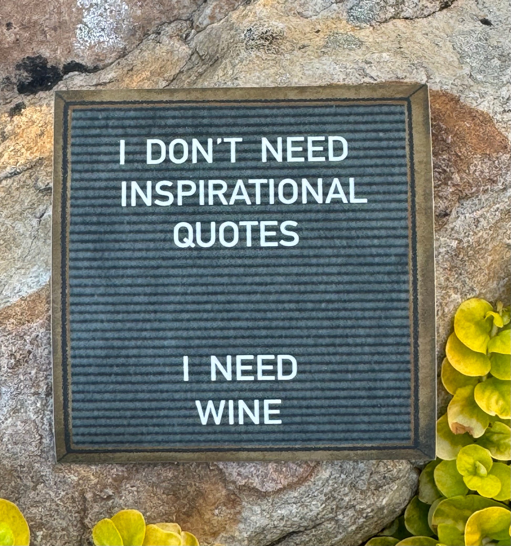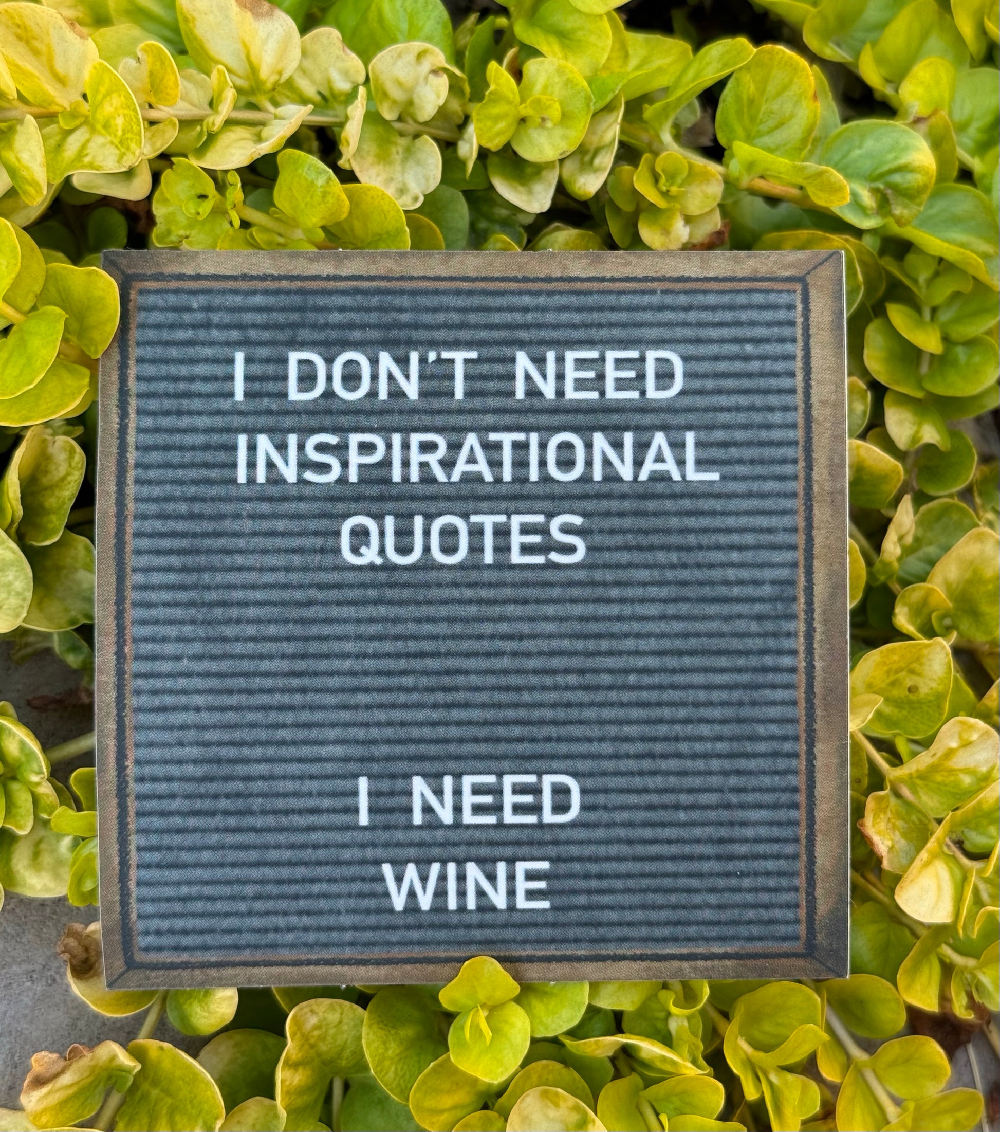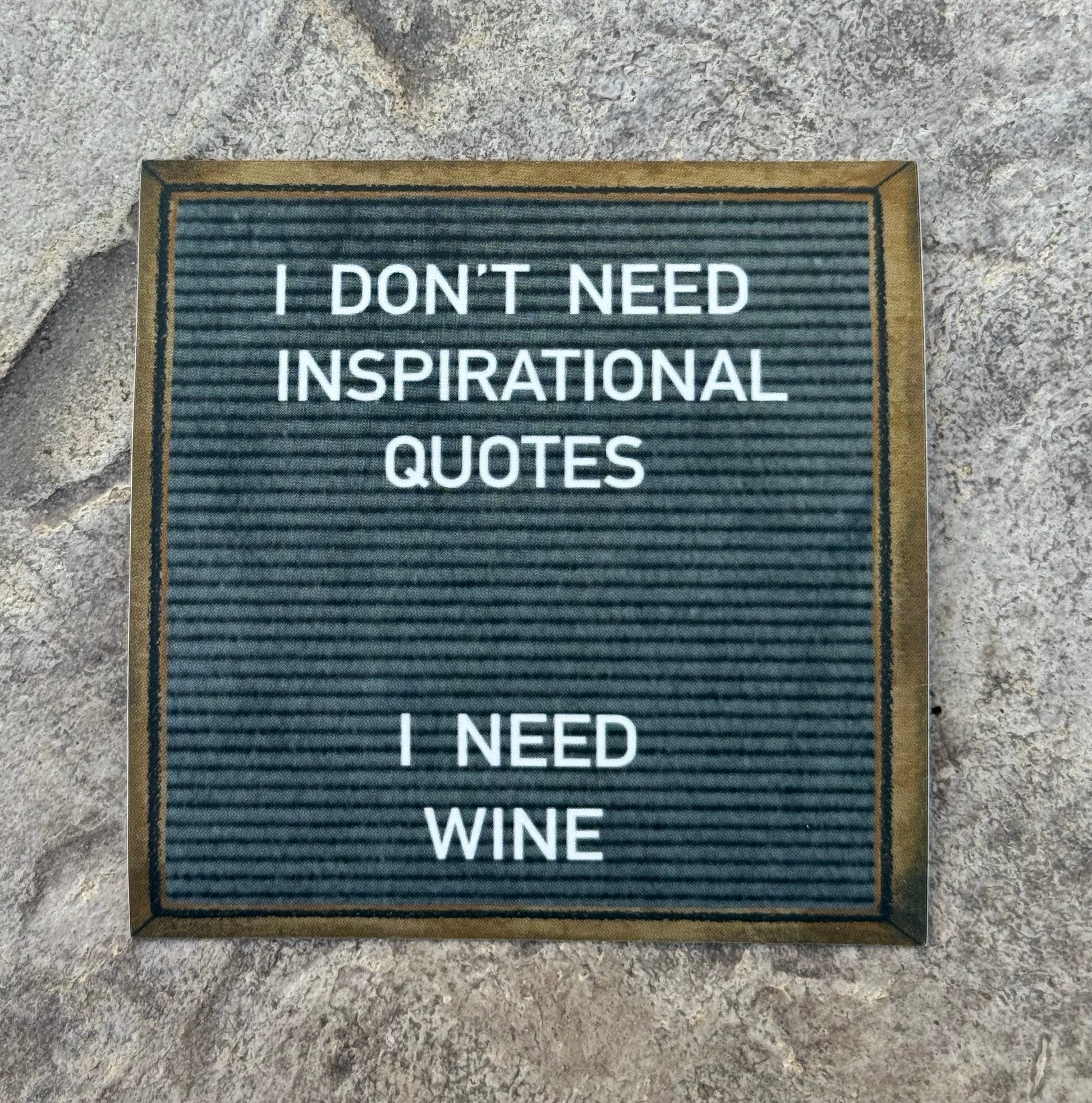 Designed to look just like a felt letter board this sticker has a wood frame around the felt center with the quote, "I DON'T NEED INSPIRATIONAL QUOTES- I NEED WINE." The sticker has a beautiful soft matte finish making it look just like a real felt board. Stickers measure 3"x 3" -Check out all of the other funny felt board stickers and coasters.