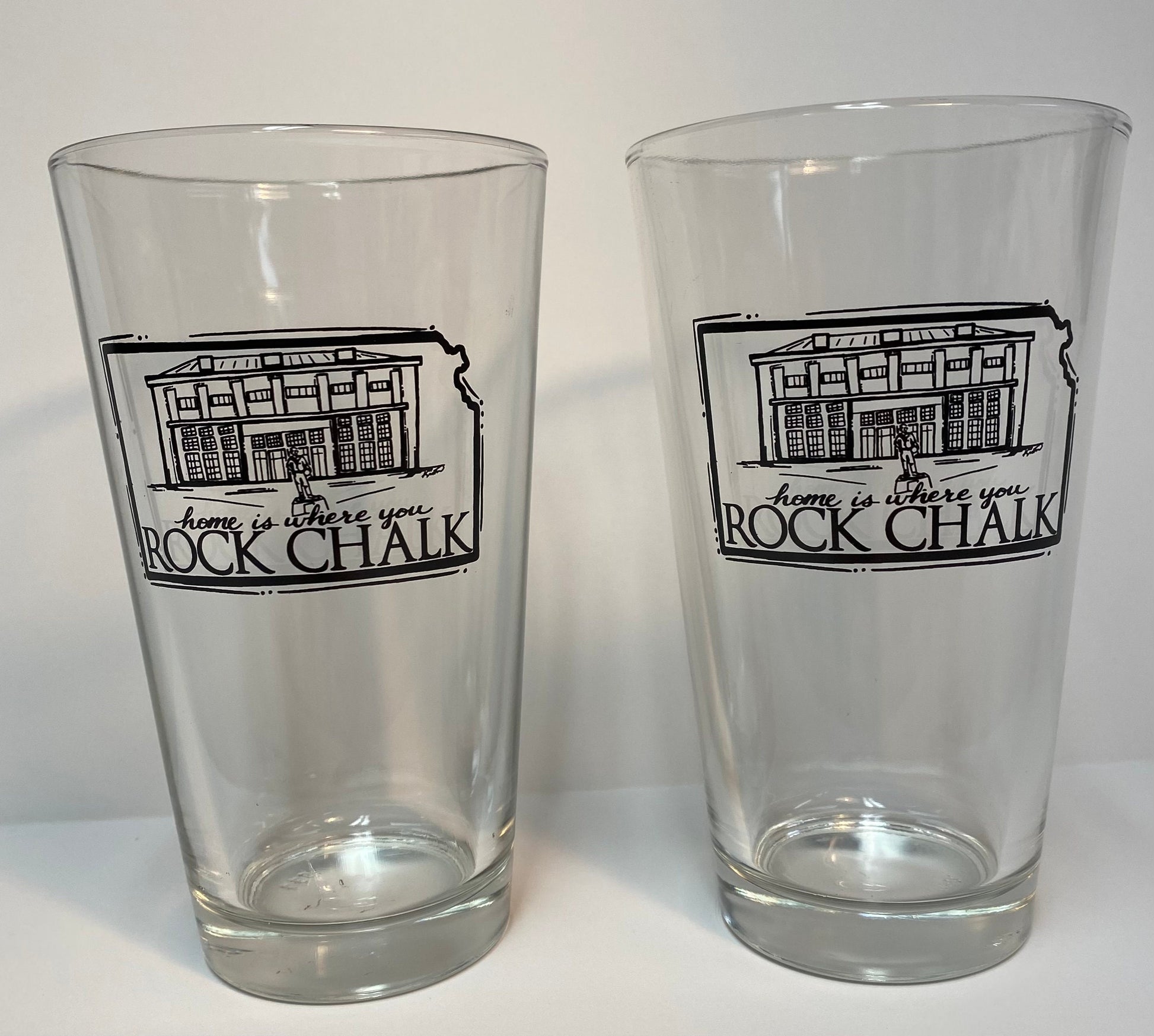 This classic pint glass has been professionally printed in Lawrence with my original sketch of the Fieldhouse surrounded by the state of Kansas. Add to your collection or give to another Jayhawk fan. Check out the other matching glasses to create a set of 4.