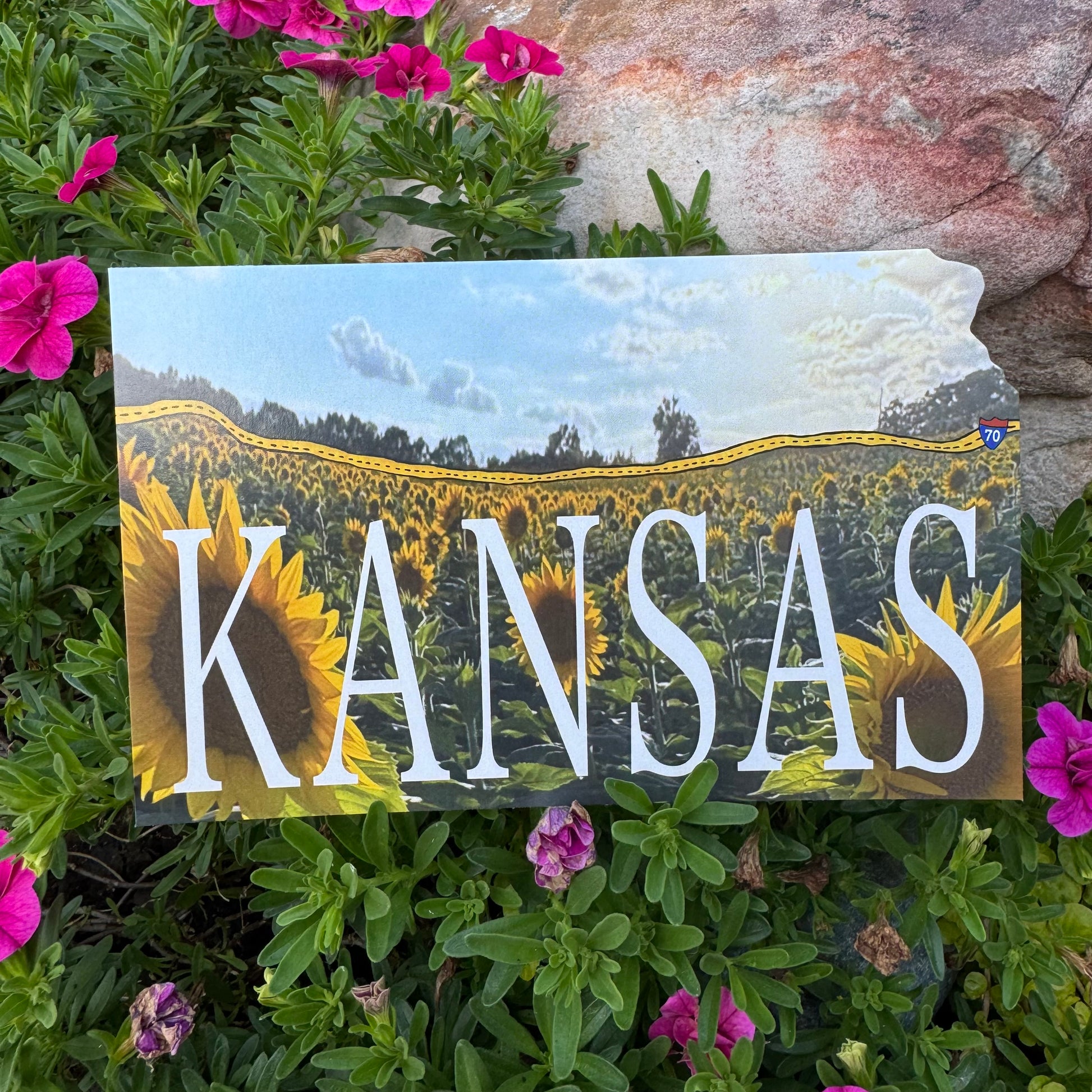 Traveling through Kansas? Share a little sunflower love with is fun die cut postcard. Cut in the shape of Kansas, this postcard features a photo of a Kansas sunflower field taken near Lawrence, Kansas. The horizon line matches the path I70 takes across the state. A whimsical drawing of the interstate adds a bit of fun if you are traveling through the state or just want to share a little note from Kansas.