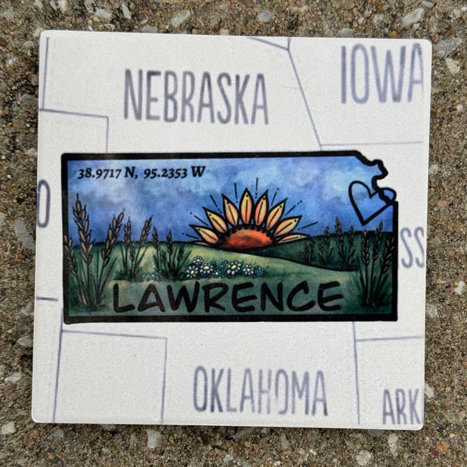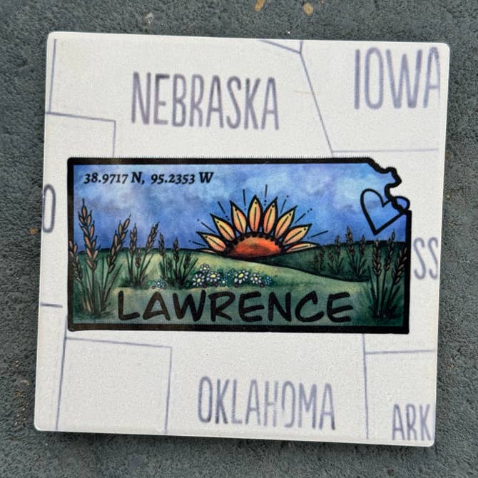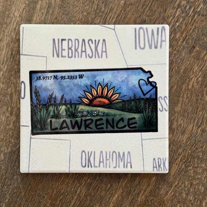 A watercolor painting of the State of Kansas with a whimsical sunflower sunset and fields of wheat and flowers has been permanently sublimated directly into this natural stone coaster. The absorbent stone measures 4.25”x 4.25” and has a full cork back to protect surfaces. The artwork features the state of Kansas in the center with hints of the surrounding states. This design features Lawrence, Kansas and its coordinates. Customize the coaster for your location. The stone has a soft matte, natural finish with neutral colors to match any decor- perfect for those with ties to Kansas for those just passing through. Mix and match this design with the other Kansas Map Coasters
