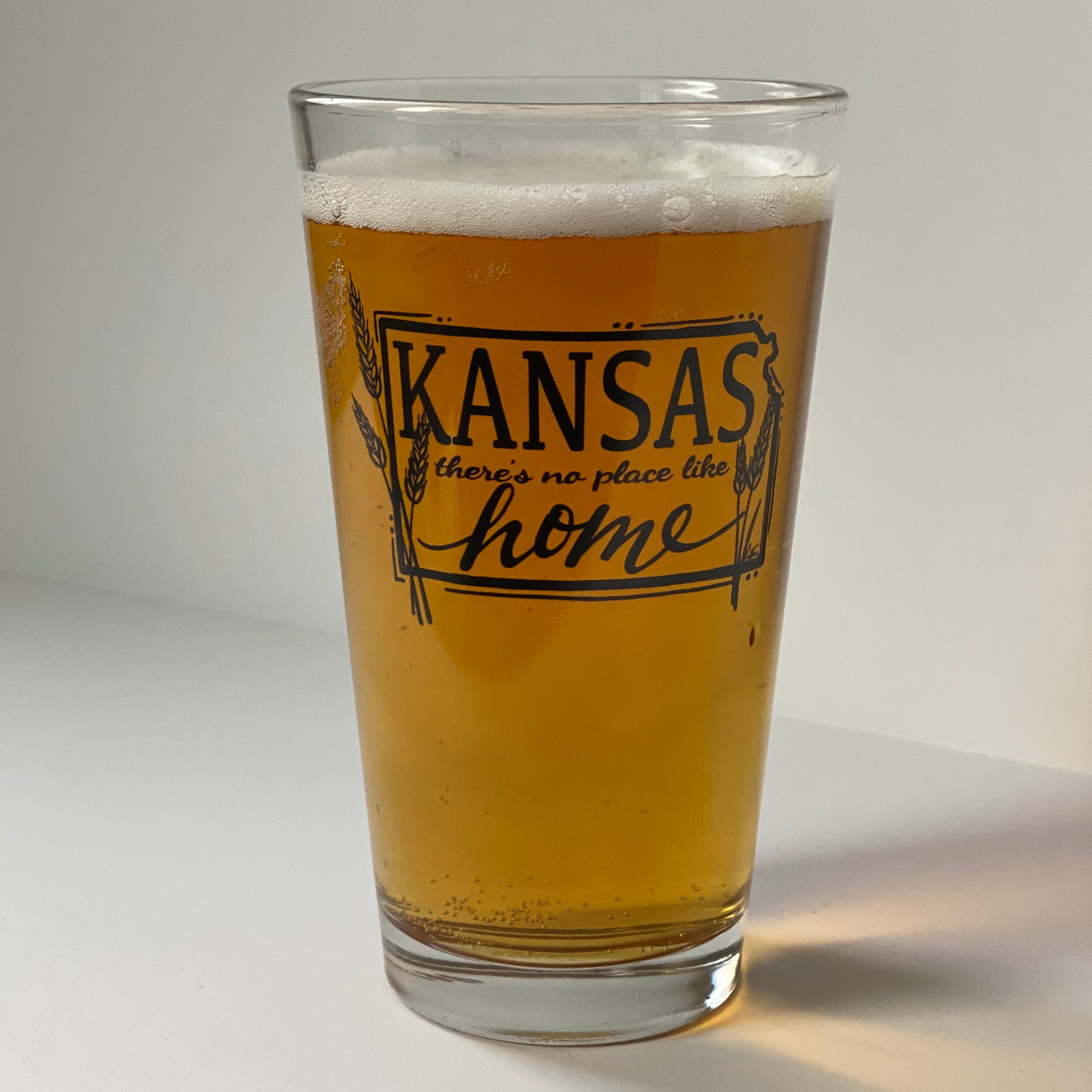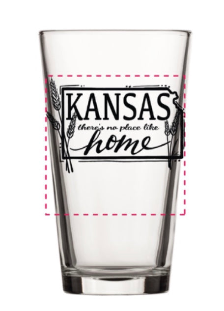 Add this 16 oz standard pint glass to your collection. A simple outline of Kansas with the words "Kansas will always be home" fills the inside of the state. Glasses are designed and screen printed right here in Lawrence, KS. Check out the other 3 Kansas designs available. Glasses come with a sticker on the bottom with product info and care instructions.