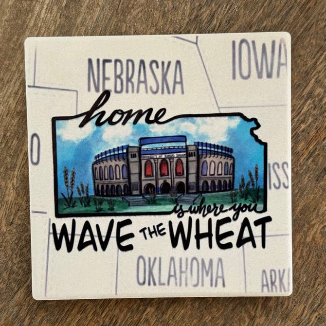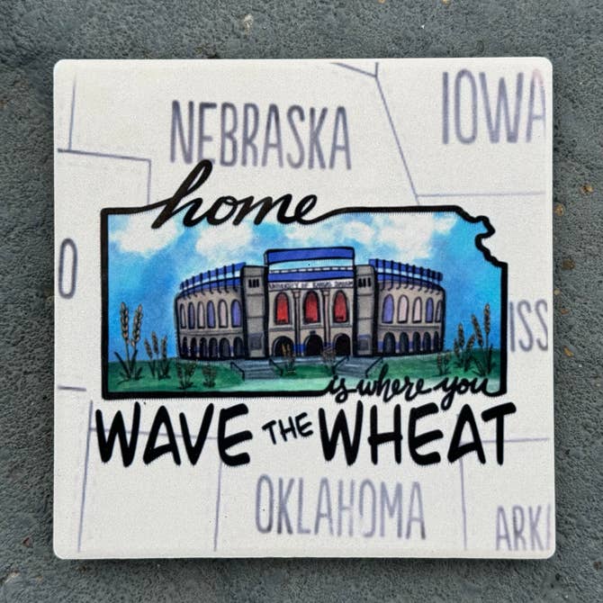 The words “Home is Where you Wave the Wheat” provide the outline for the state of Kansas with a watercolor painting of the University of Kansas Memorial Football Stadium in the center of the state. The artwork has been permanently sublimated directly into this natural stone coaster. The absorbent stone measures 4.25”x 4.25” and has a full cork back to protect surfaces. The artwork features the state of Kansas in the center with hints of the surrounding states. The stone has a soft matte, natural finish with neutral colors to match any decor- perfect for those with ties to the University of Kansas or for those you just love the Jayhawks. Mix and match this design with the other Kansas Map Coasters including one with Allen Fieldhouse