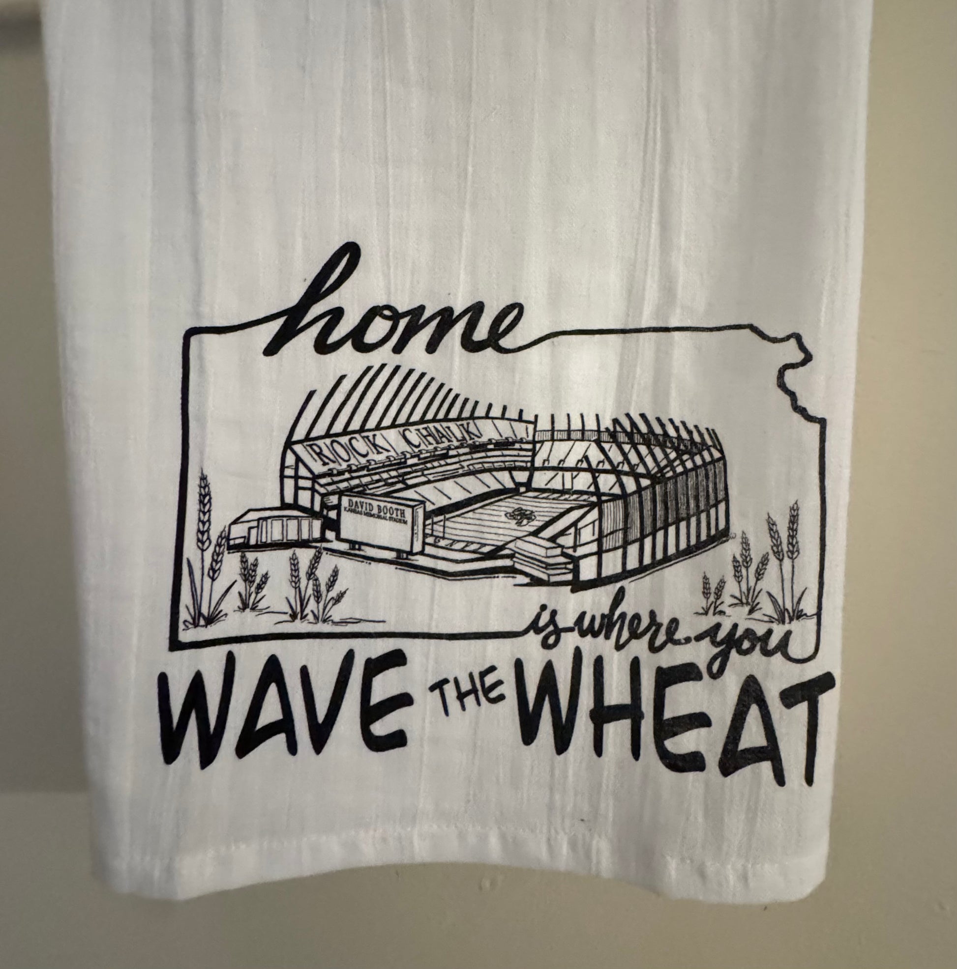 This simple towel is perfect for those who love Kansas Football. The artwork features the all new David Booth Kansas Memorial Football Stadium with the words “Home is where you Wave the Wheat”. Towels have a beautiful herringbone weave which keeps them looking nice wash after wash- not like your typical flour sack towel. Towels measure 27”x27”. My original artwork has been professionally screen printed right here in Lawrence, KS. Image is about 10” wide. A perfect gift for someone cheering on the Jayhawks or just for fun.