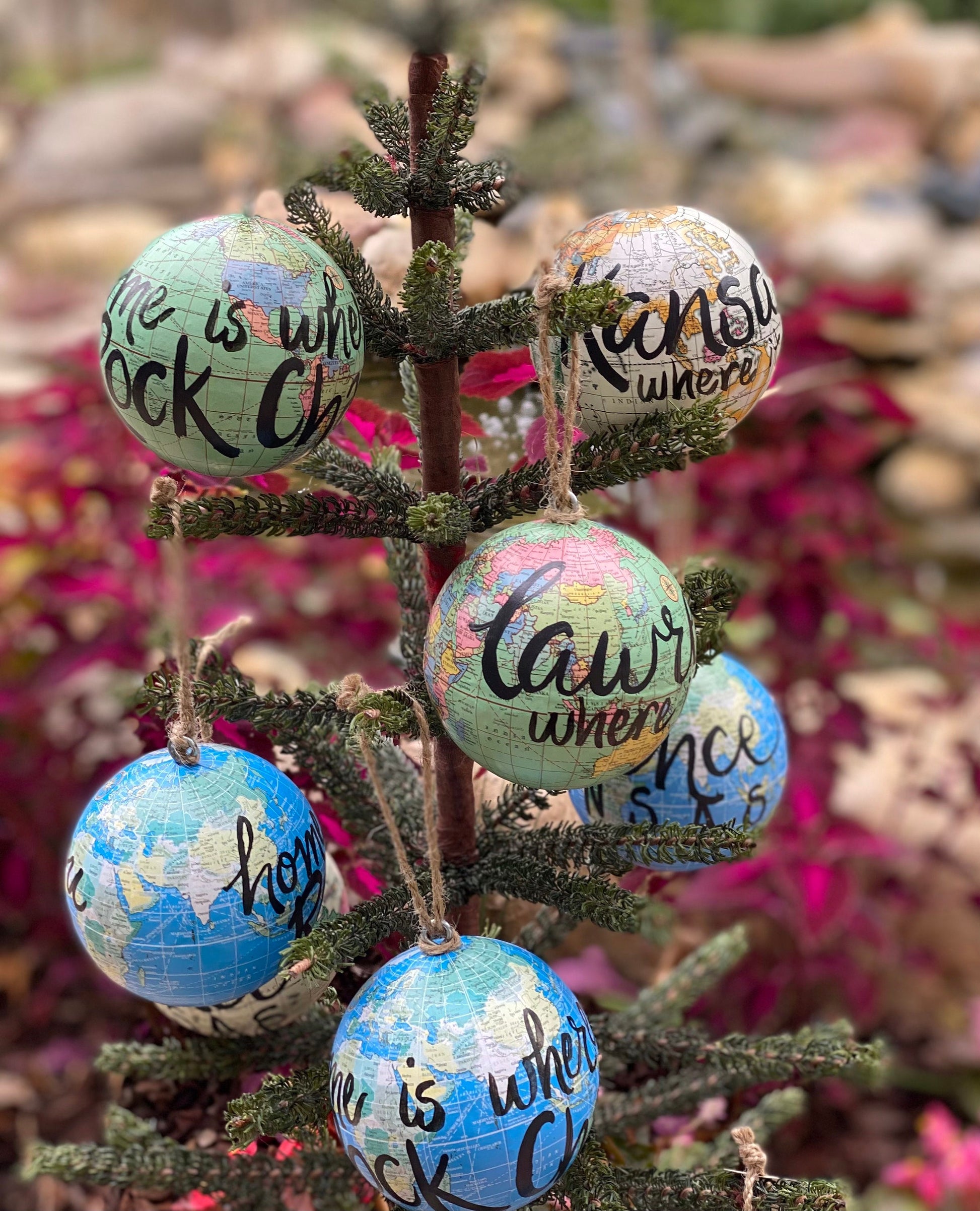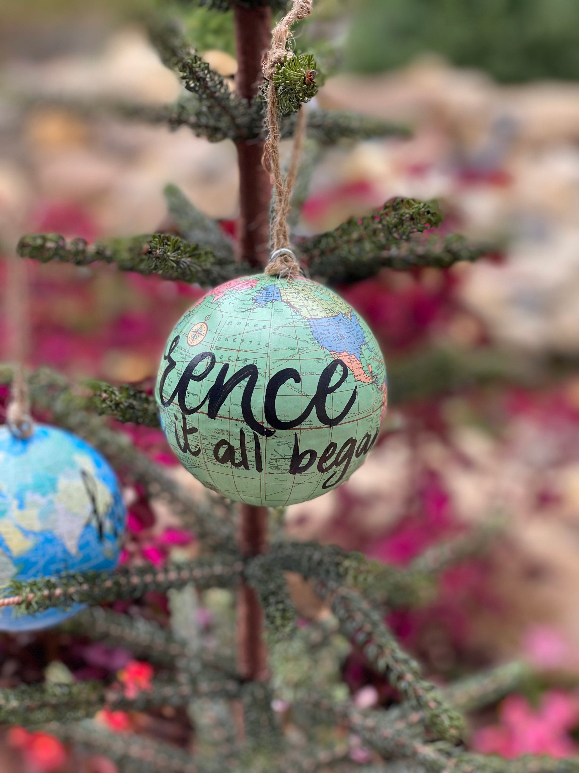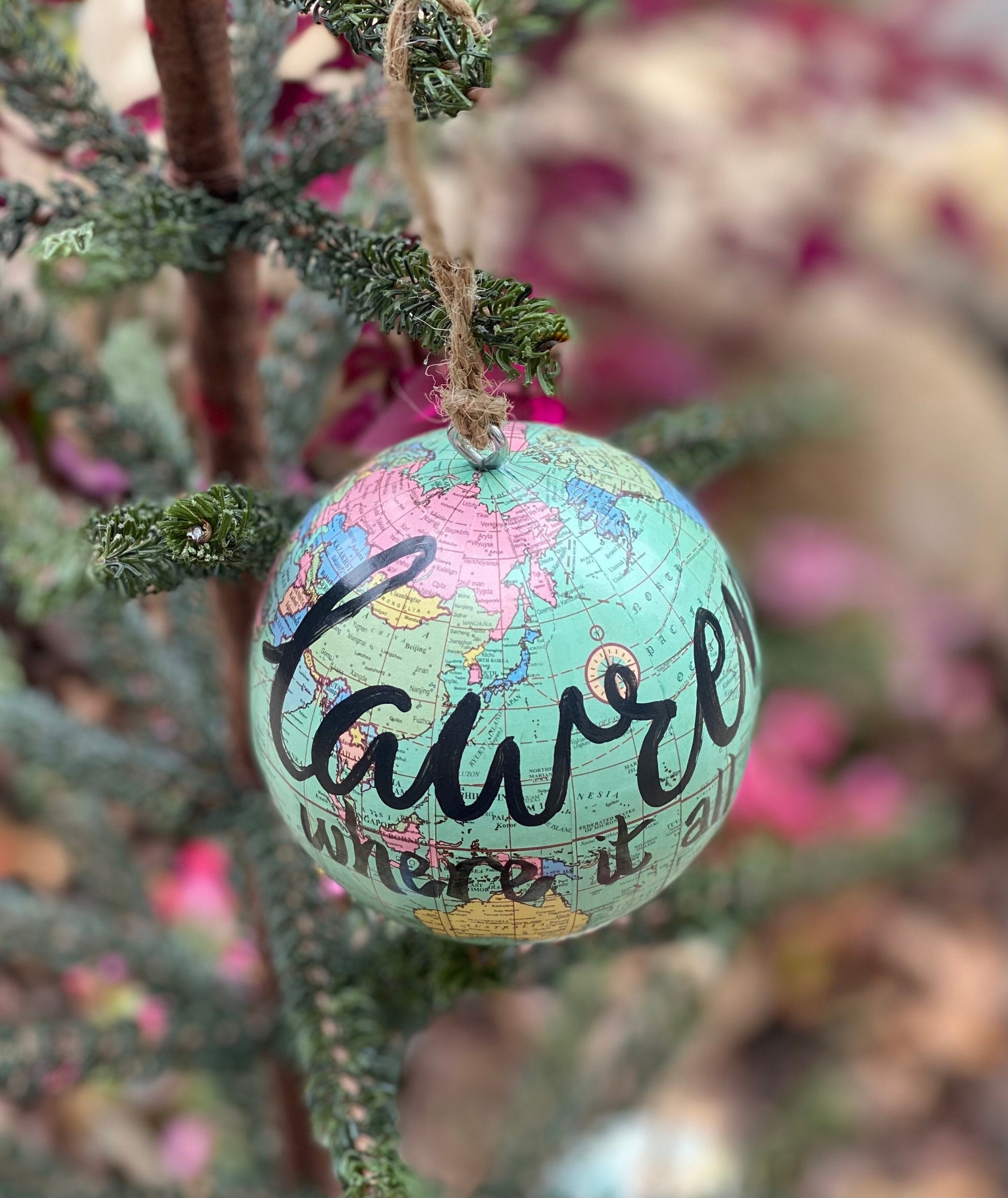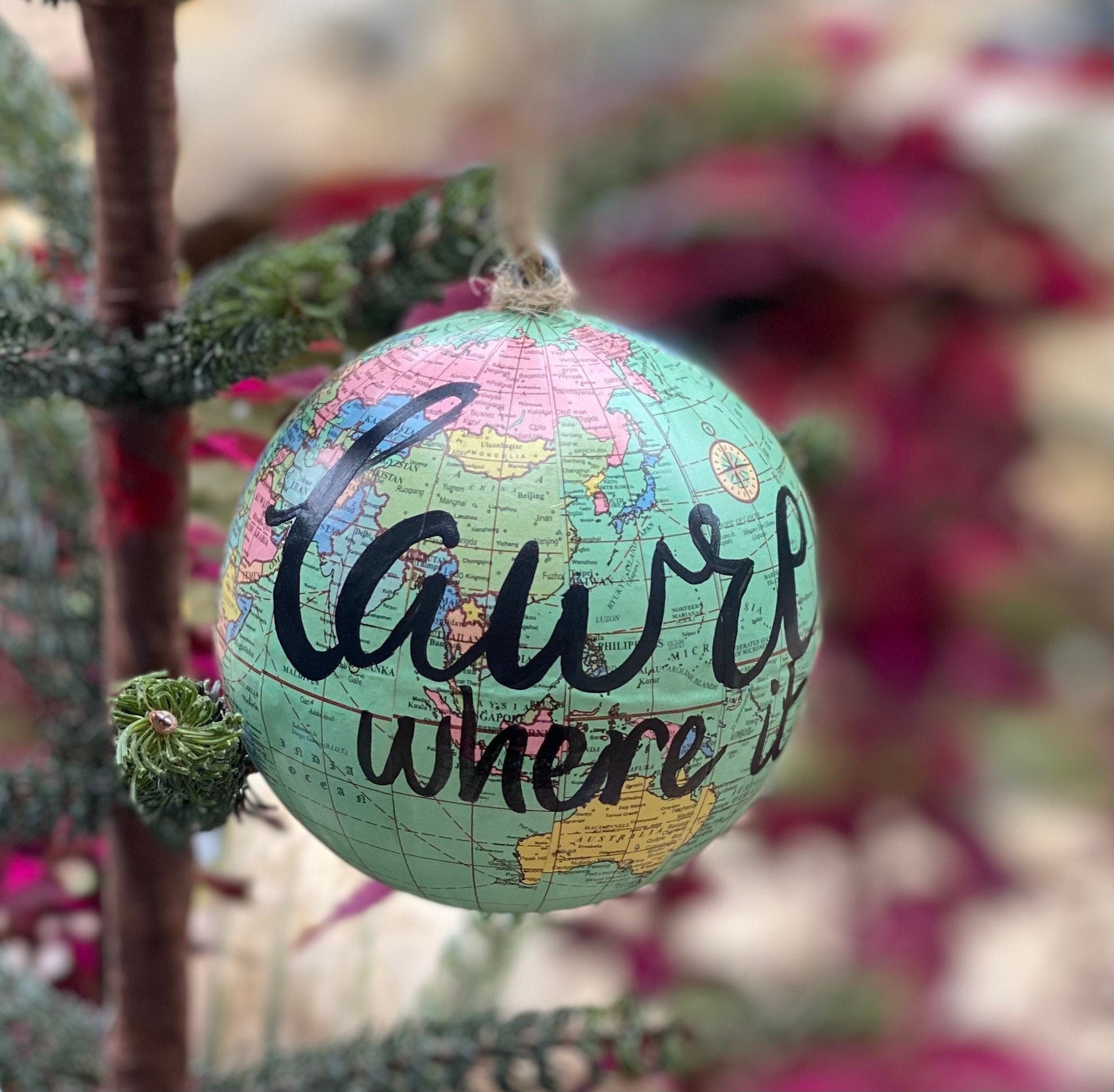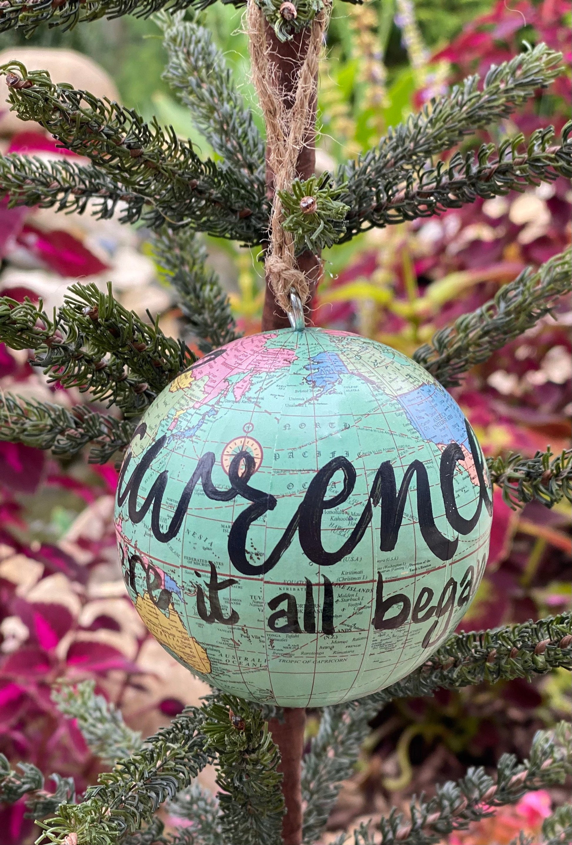 This globe ornament has been hand painted with the word “Lawrence” wrapped around the middle and the words “where it all began…” painted just below. The paper ornament measures around 4” in diameter and comes in blue, green and tan. I free hand paint all of the lettering so each globe will very slightly. A fun ornament for those who met in Lawrence, Kansas. Start a couple off with an ornament for their wedding, or for those celebrating anniversaries. Add a note to your purchase letting me know which color globe you prefer.