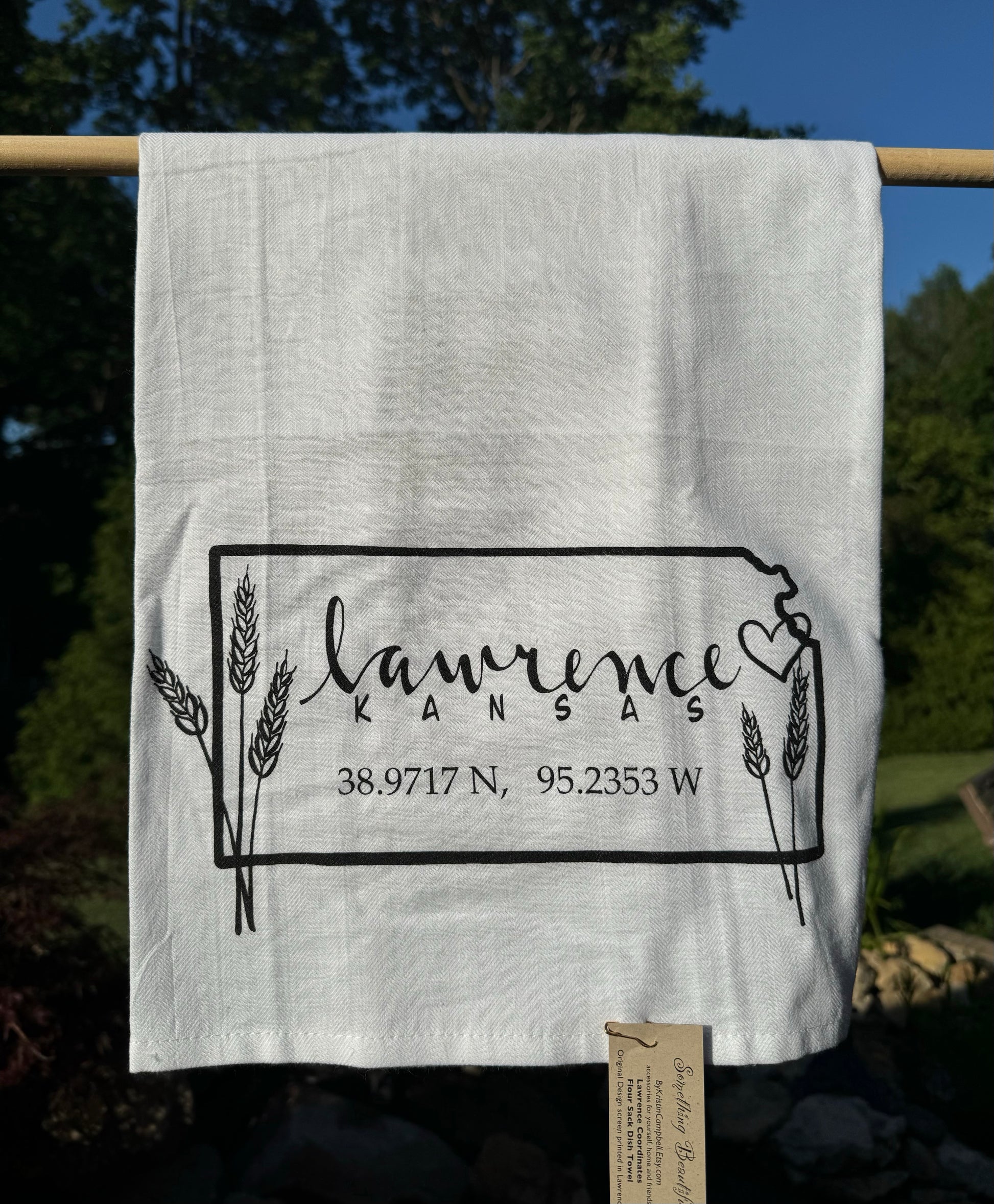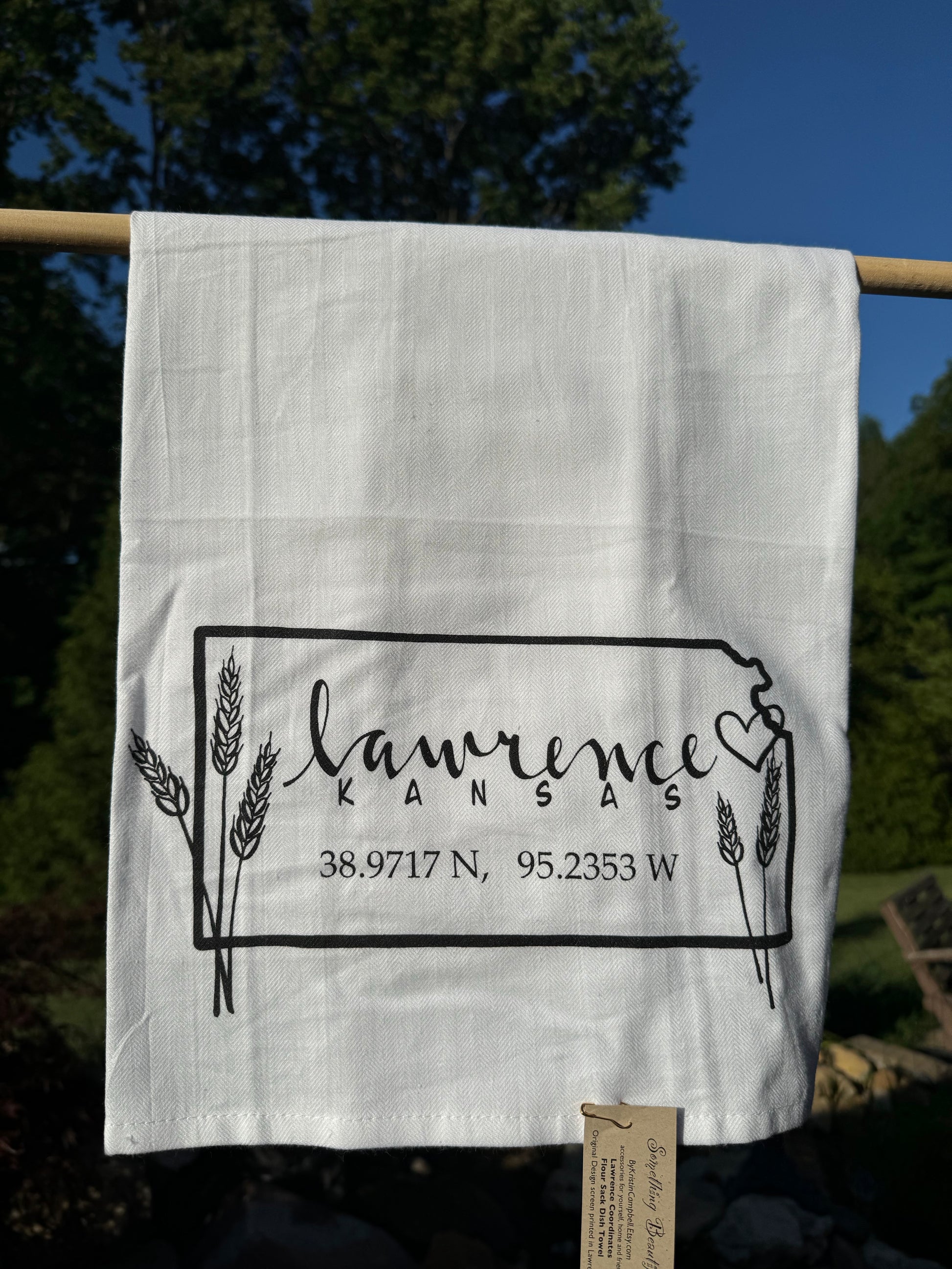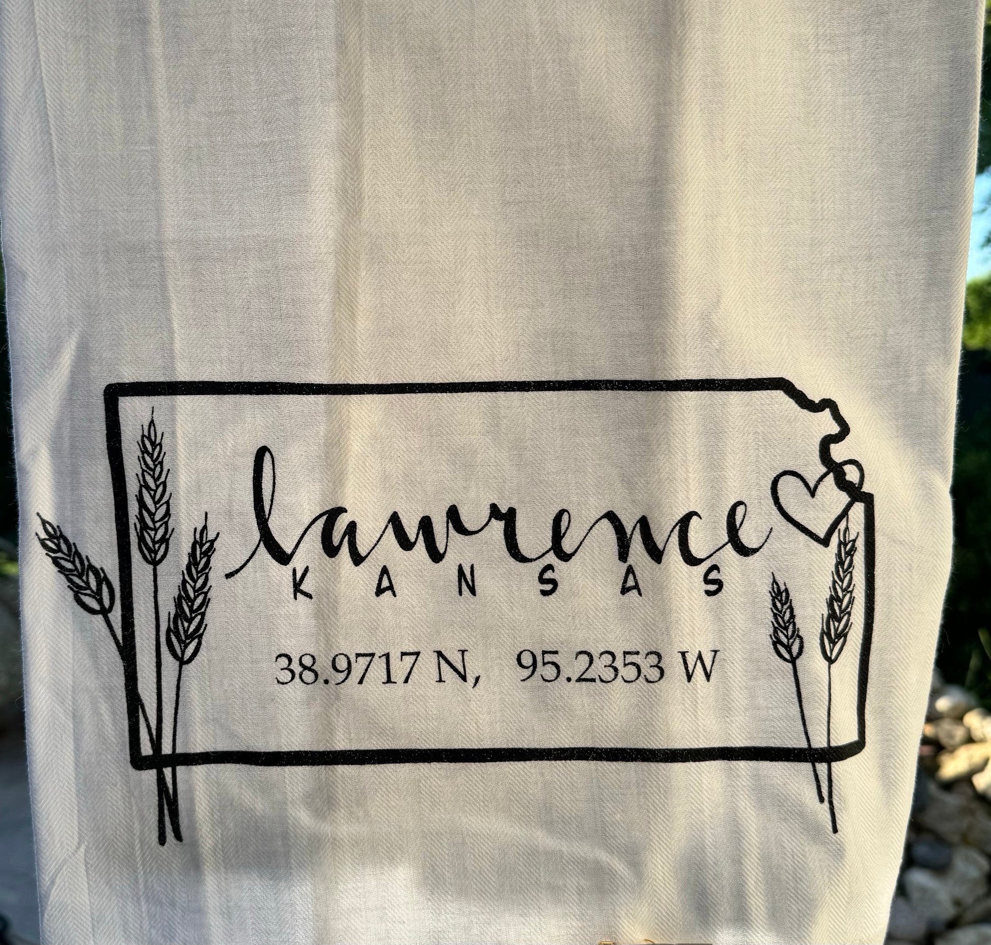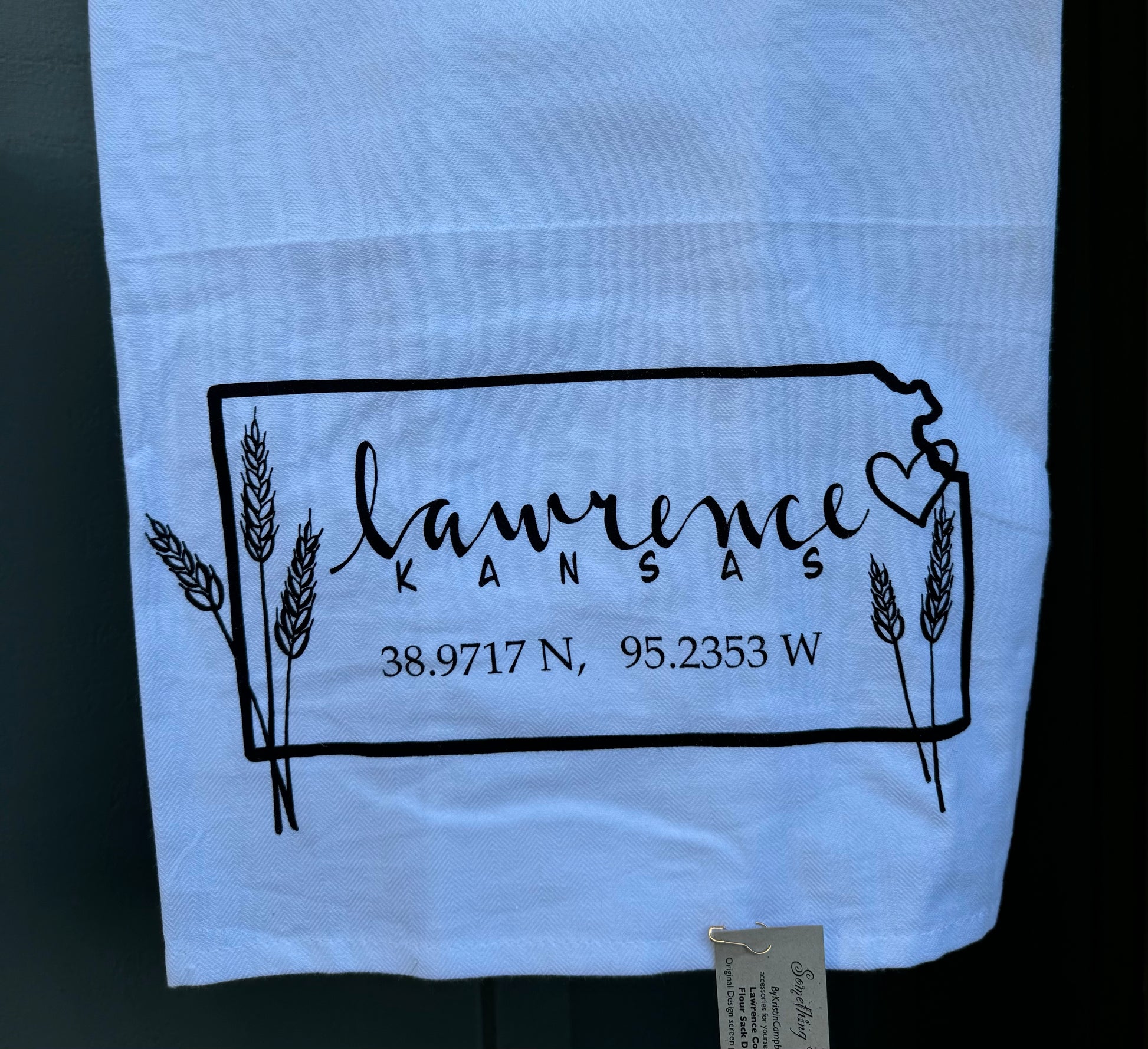 This simple Kansas Towel has the coordinates for Lawrence, Kansas and a touch of wheat around the edges. The artwork has been professionally screen printed on a beautiful herringbone weave, flour sack towel. Towel measures 27" x 27" and washes nicely year after year