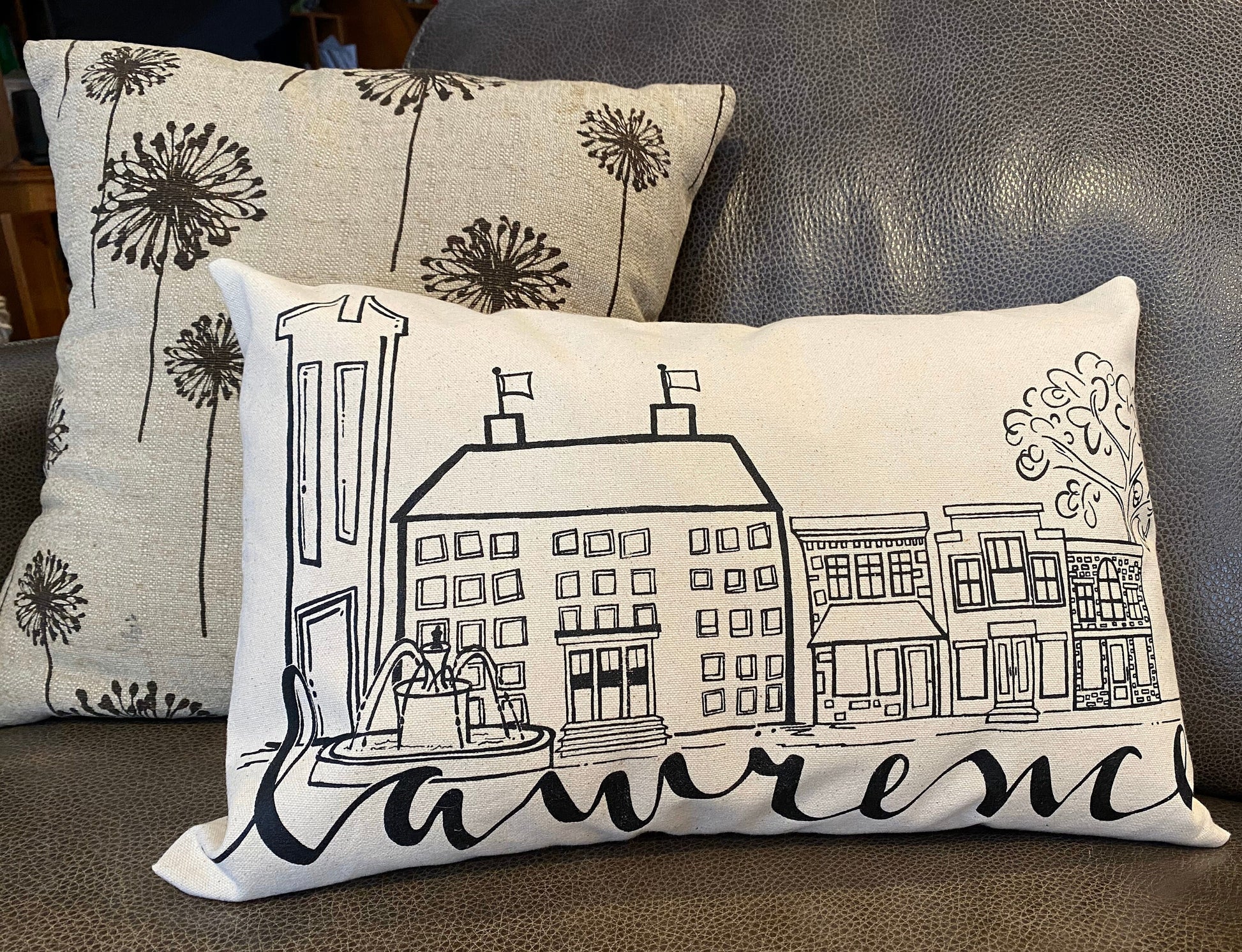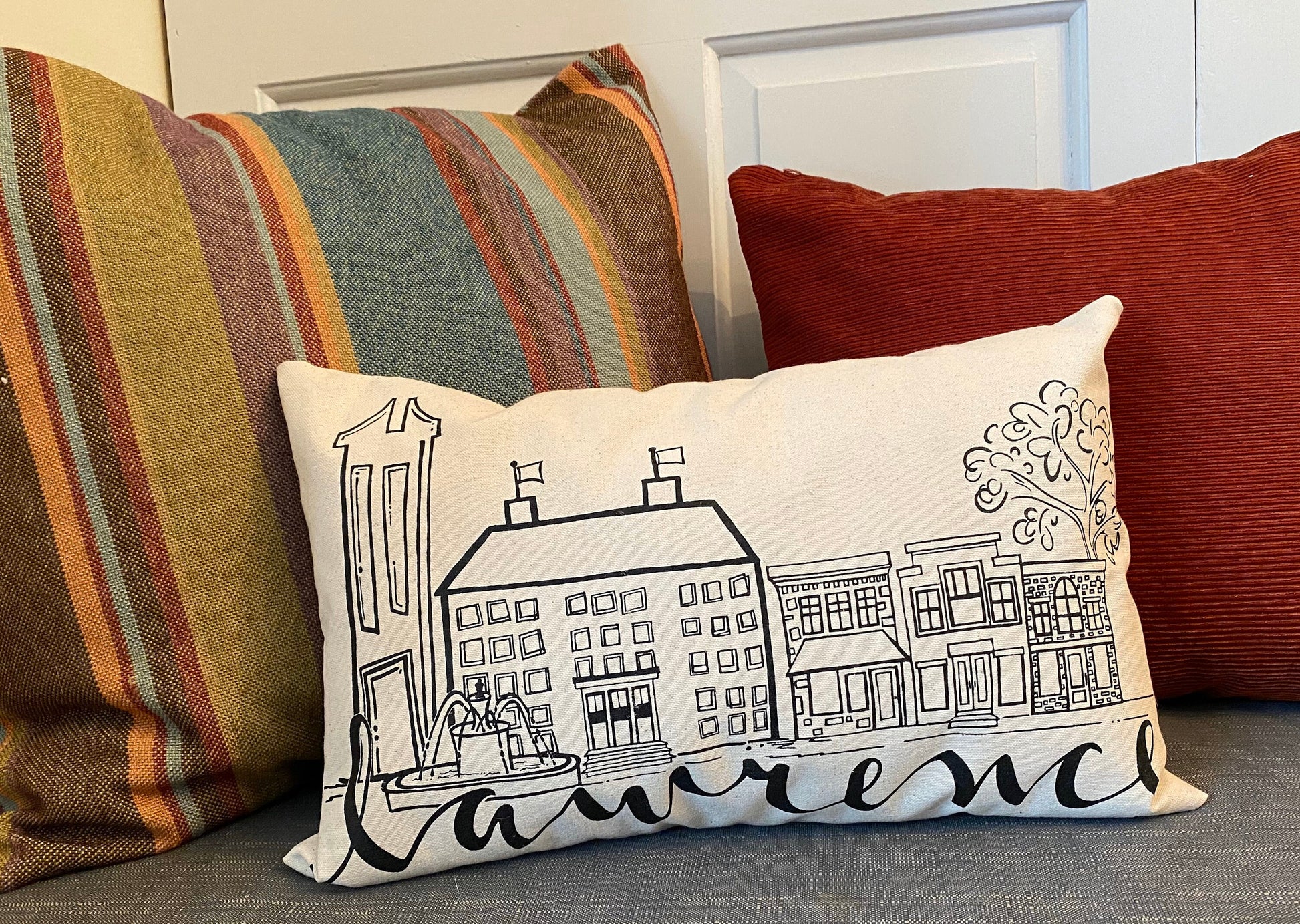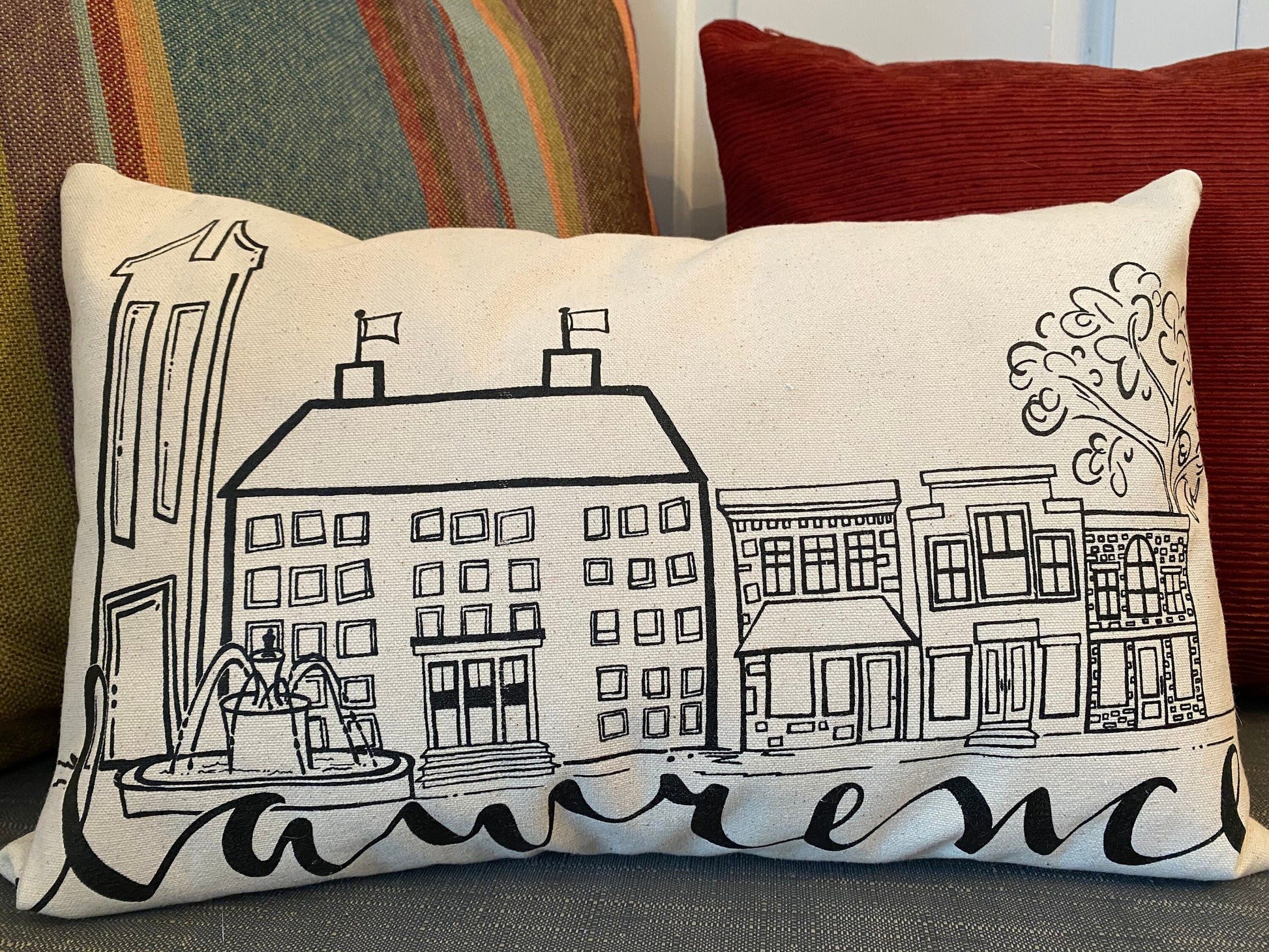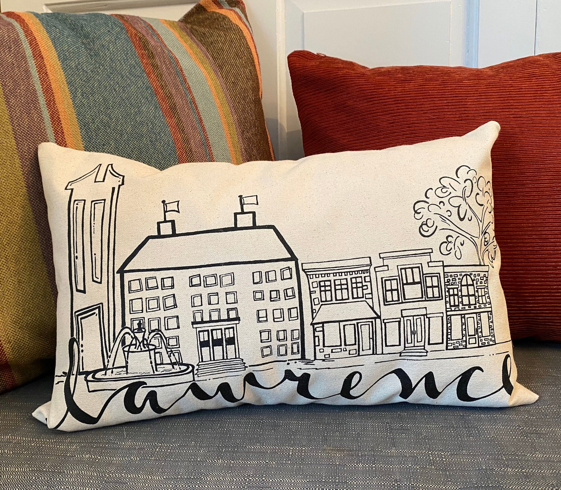 My original sketch has been professionally screen printed on canvas for the front of the pillow. The back is a coordinating fabric. It has an envelope closure and includes the faux down insert. The pillow measures 12"x18". A fun gift for someone moving to Lawrence or just to brighten your home with a bit of Lawrence love. The simple design will match any decor. Pillows come with a tag pinned to the corner with product info.