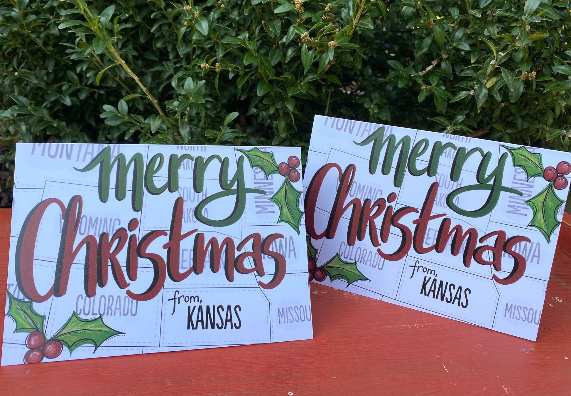 This elegant holiday card has a simple grey outline map of the Midwest in the background with the focus on Kansas.