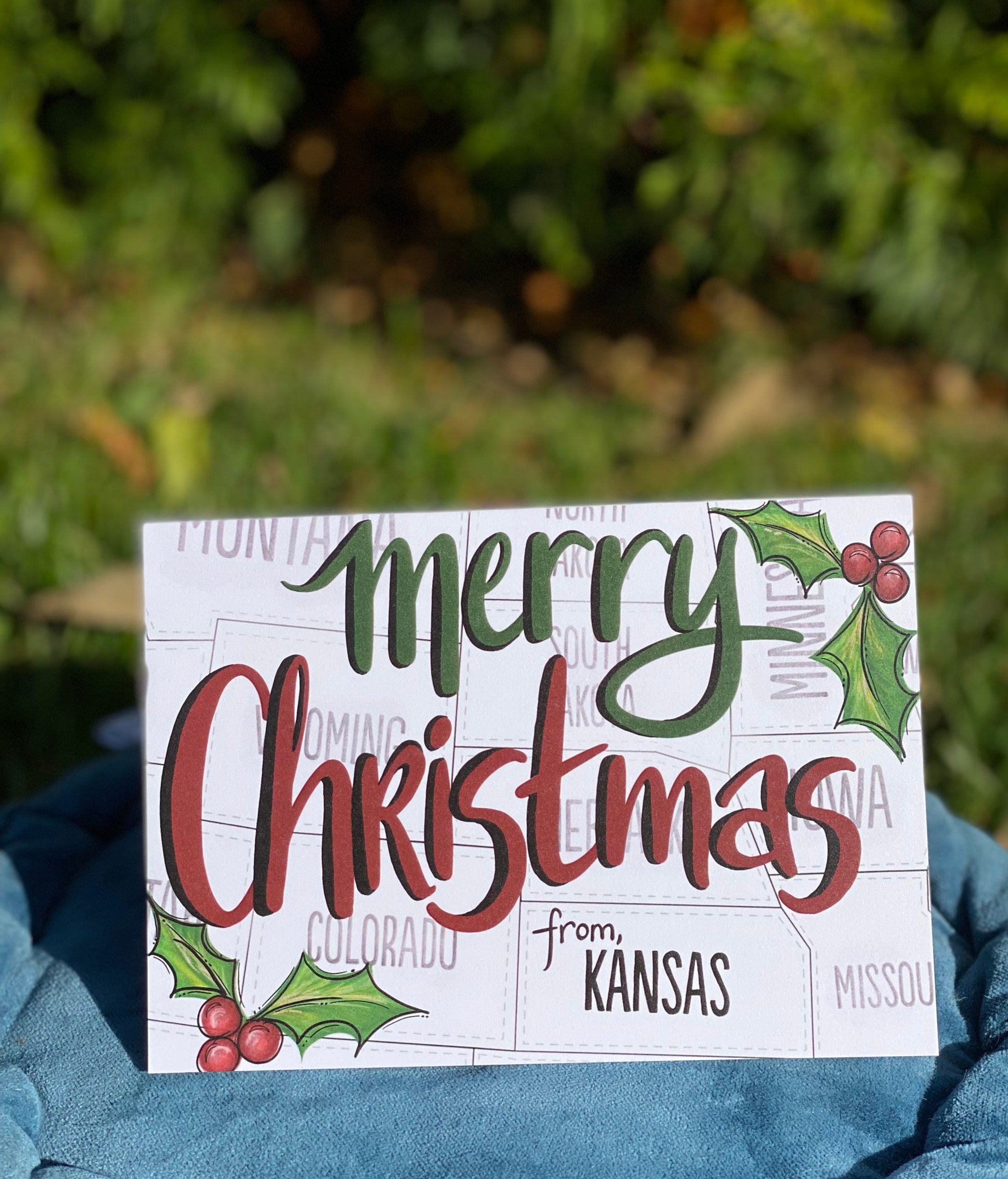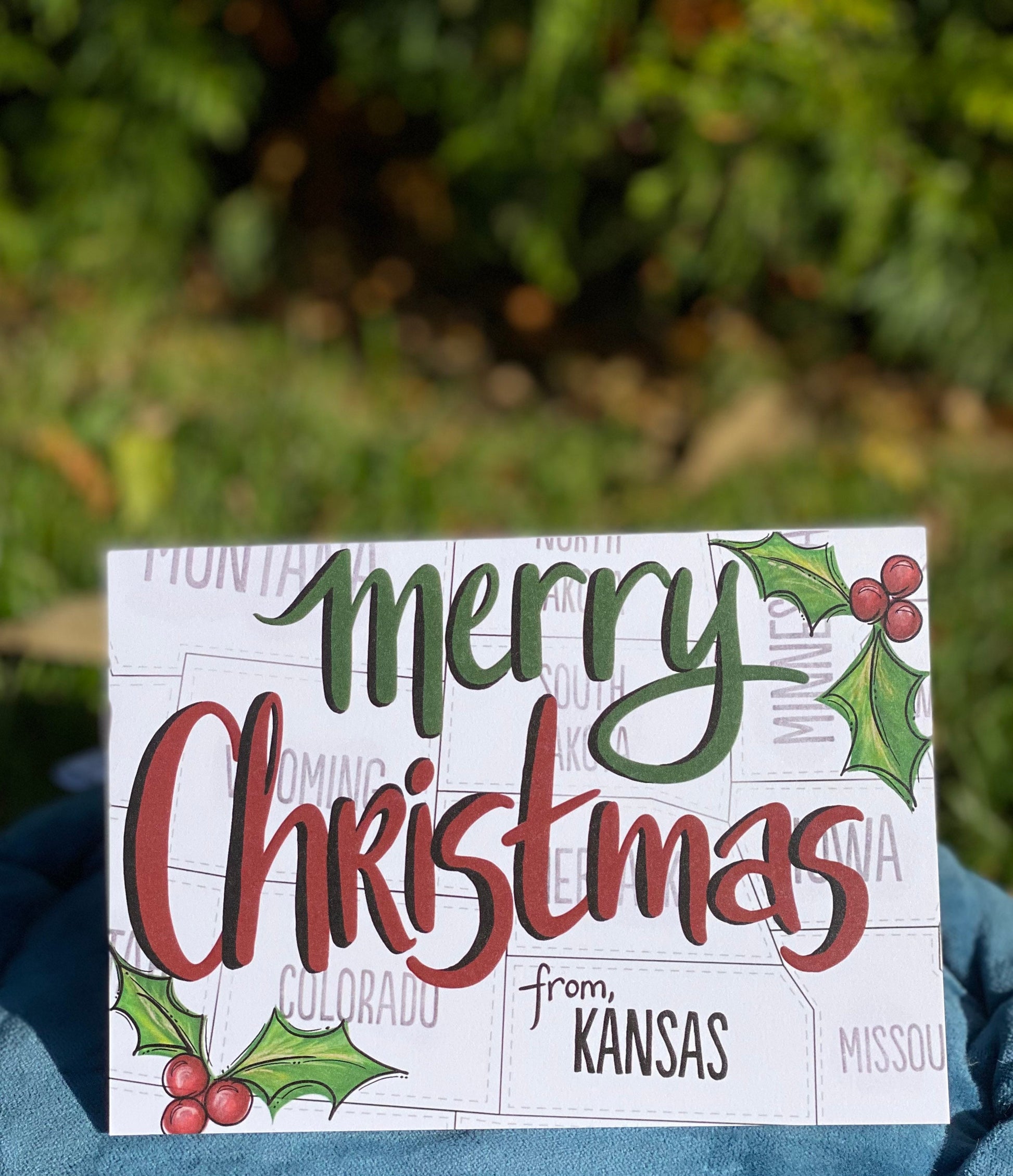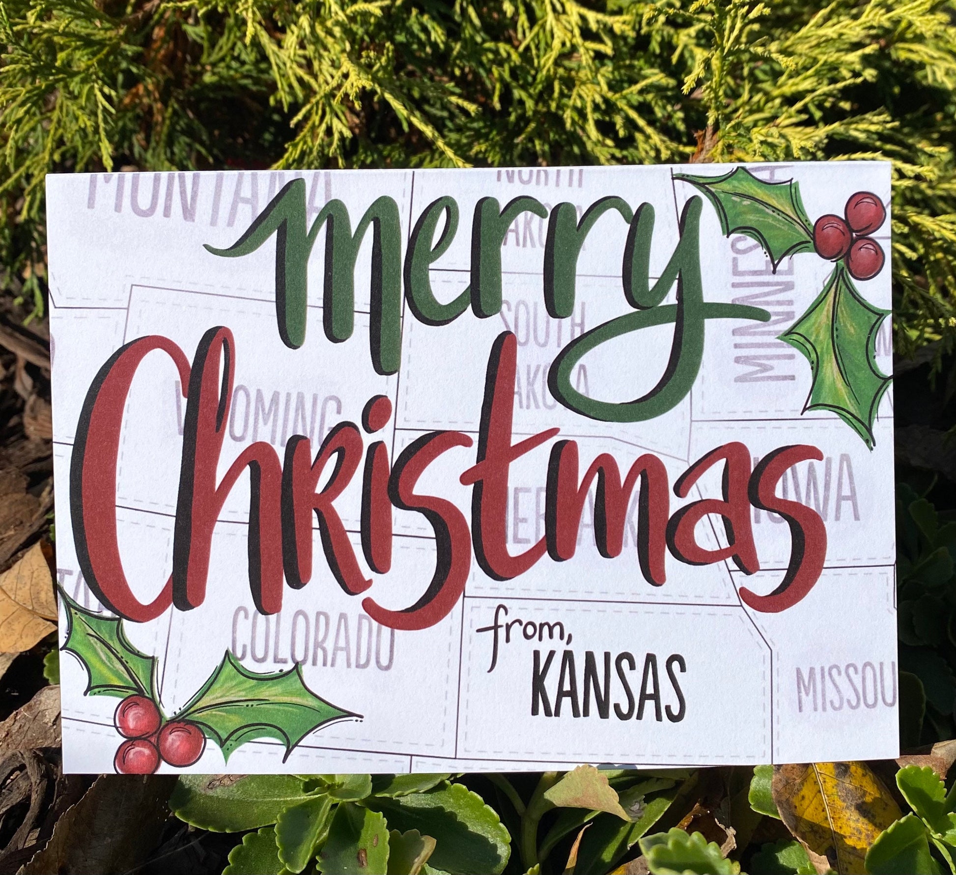 I have hand lettered the words Merry Christmas and added some holly for the season. Wish everyone on your list a Merry Christmas from Kansas.