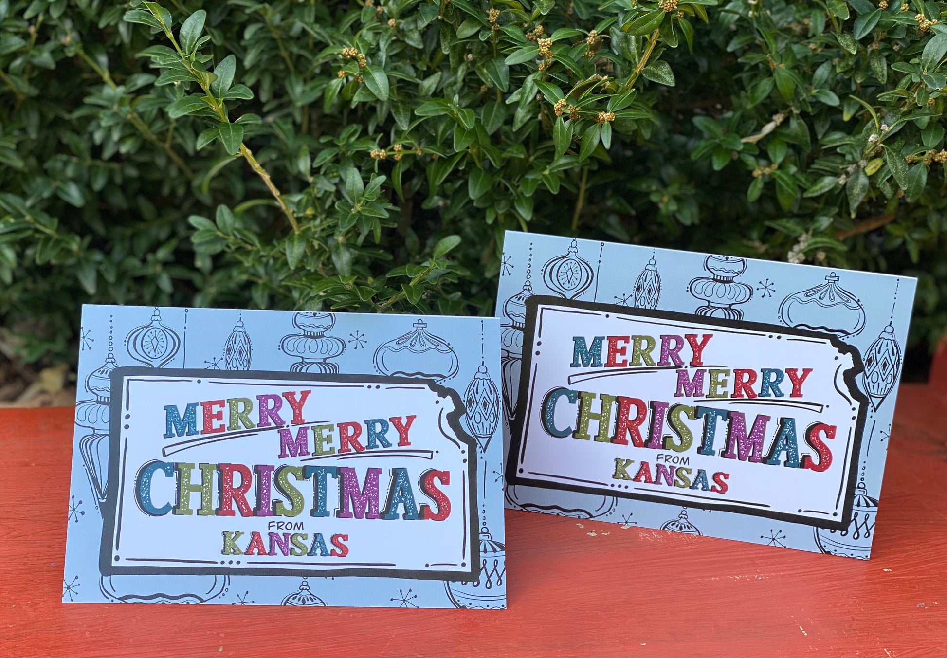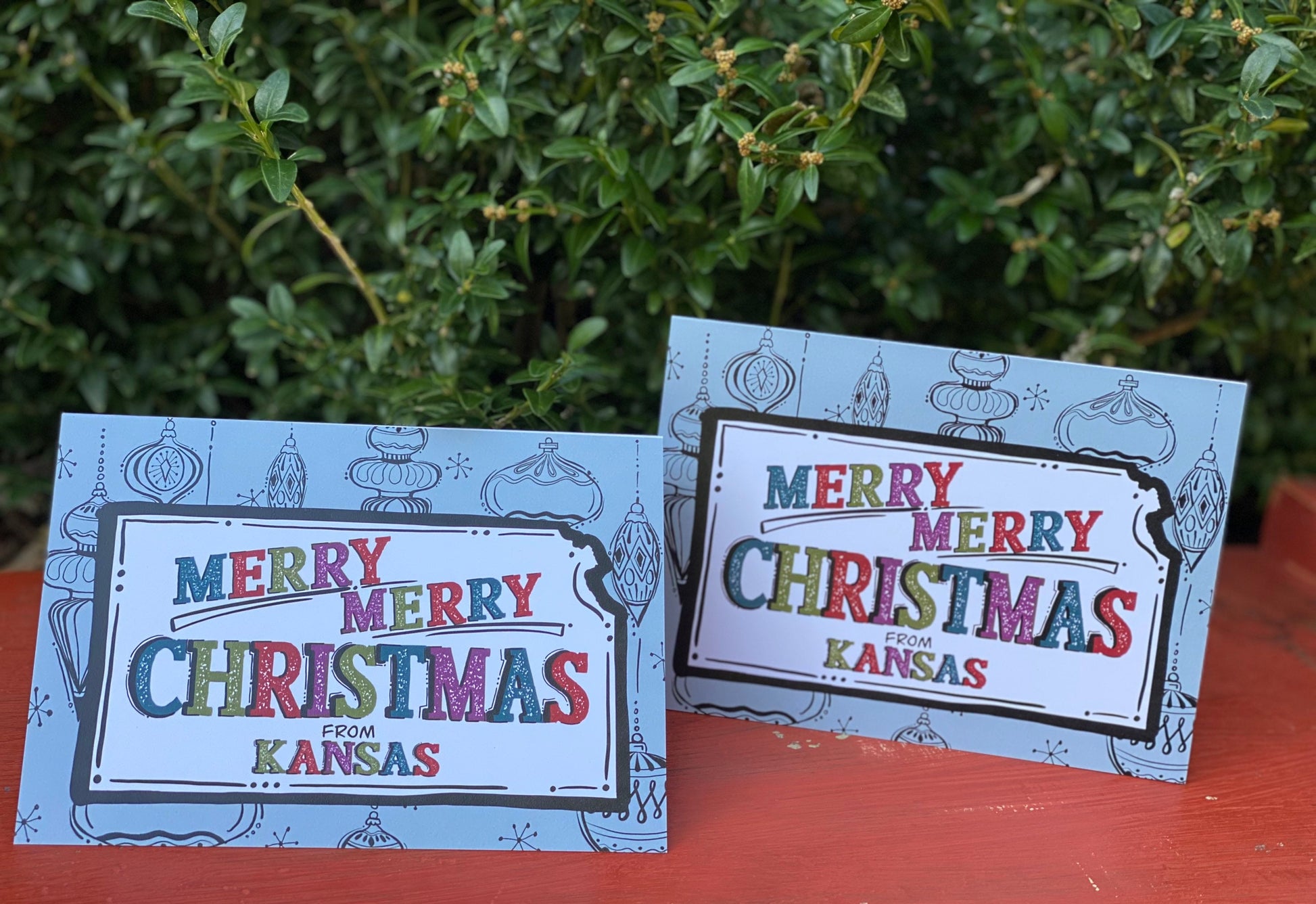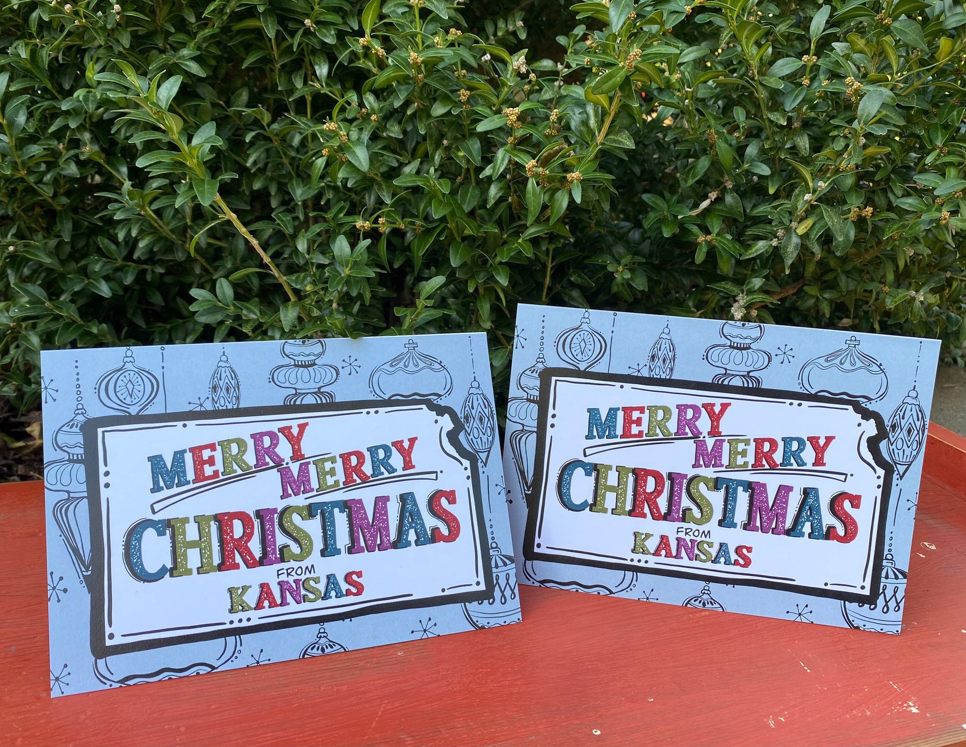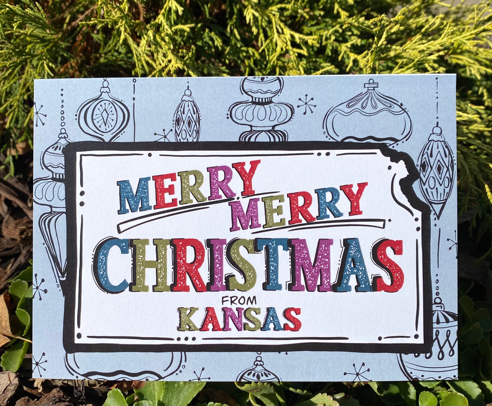 Add a little midcentury modern flare to your holiday cards this year. I sketched some of my favorite “old ornament” styles for the background on the card and then switched the focus to the state of Kansas. Inside the state, colorful lettering wishing a merry Christmas from Kansas. Card is blank inside and comes with a brown craft paper envelope
