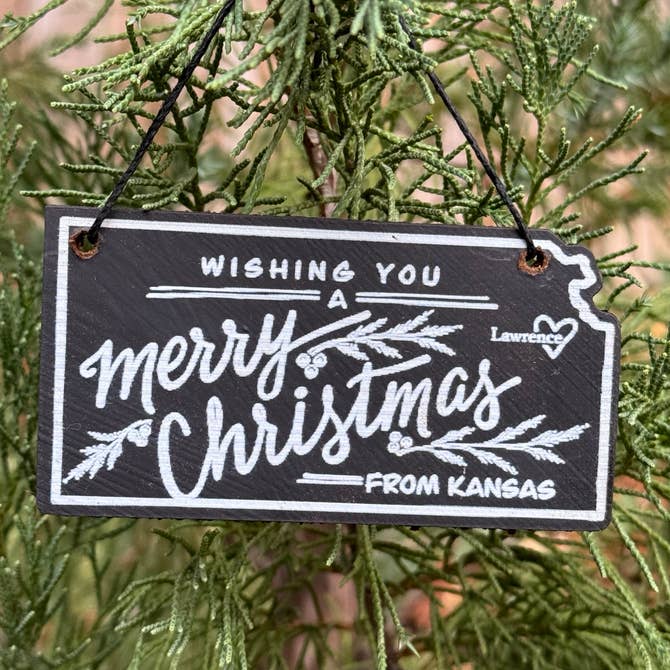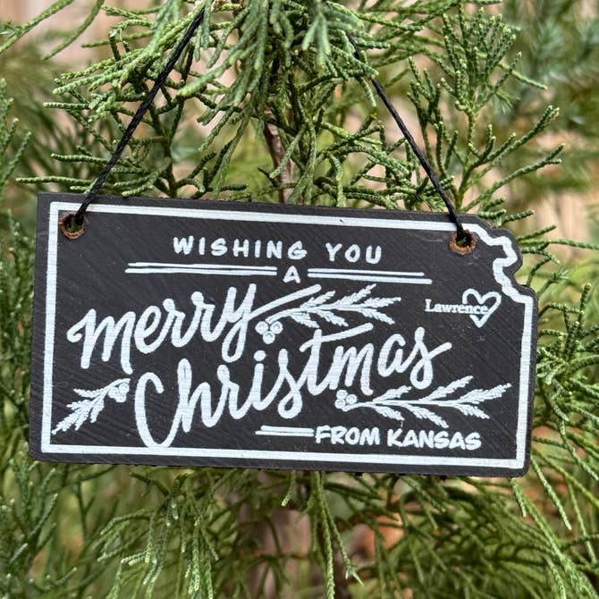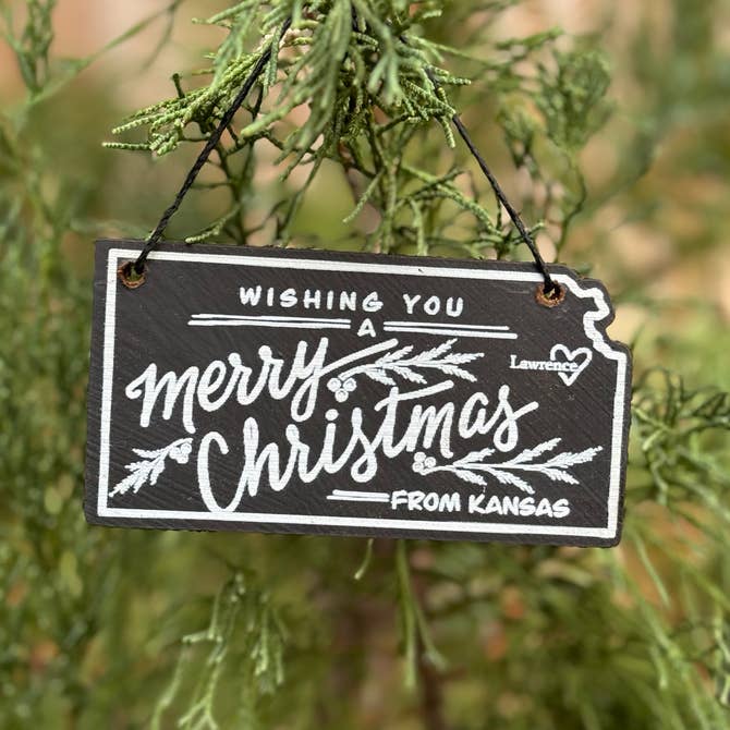 Designed to look just like an old-fashioned chalkboard, this wood ornament is perfect for those with a connection to Kansas or for those traveling through. The ornament is cut in the shape of Kansas and measures 4”x 2”. It comes with an informational hang tag on the back and a simple black cord hanger. This design has the words “wishing you a Merry Christmas from Kansas” with sketches of pine boughs and berries. A fun little gift from Kansas