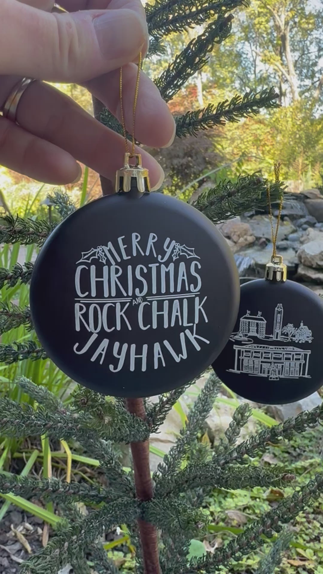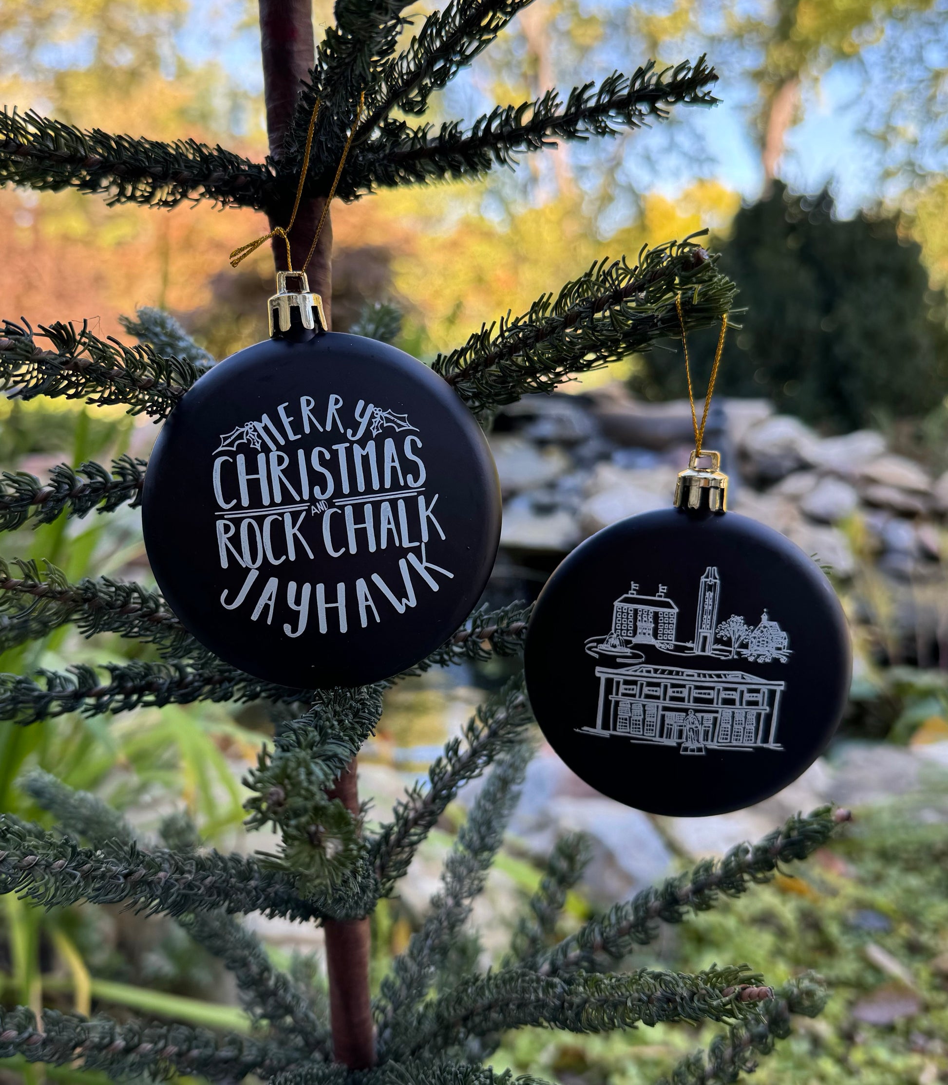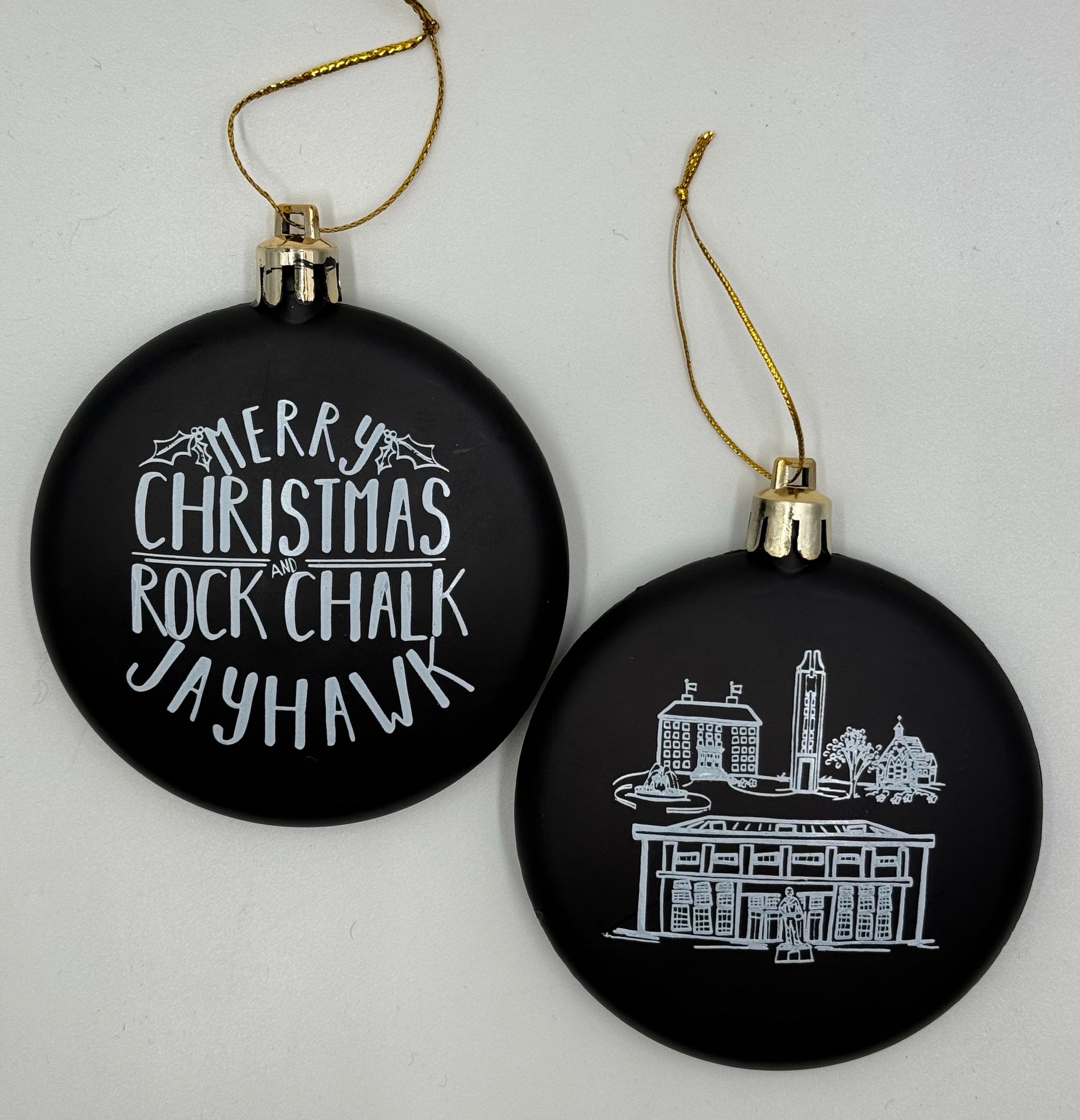 This simple, classic holiday ornament is a great way to share your Jayhawk love. The ornament has a beautiful matte black finish with white artwork giving it the look of an old school chalkboard. One side of the ornament has the words “Merry Christmas & Rock Chalk Jayhawk.” The other side features a sketch of Allen Fieldhouse with the Campanile and Fraser in the background. The ornament measures about 3” across, is shatterproof and comes with a gold thread hanger.