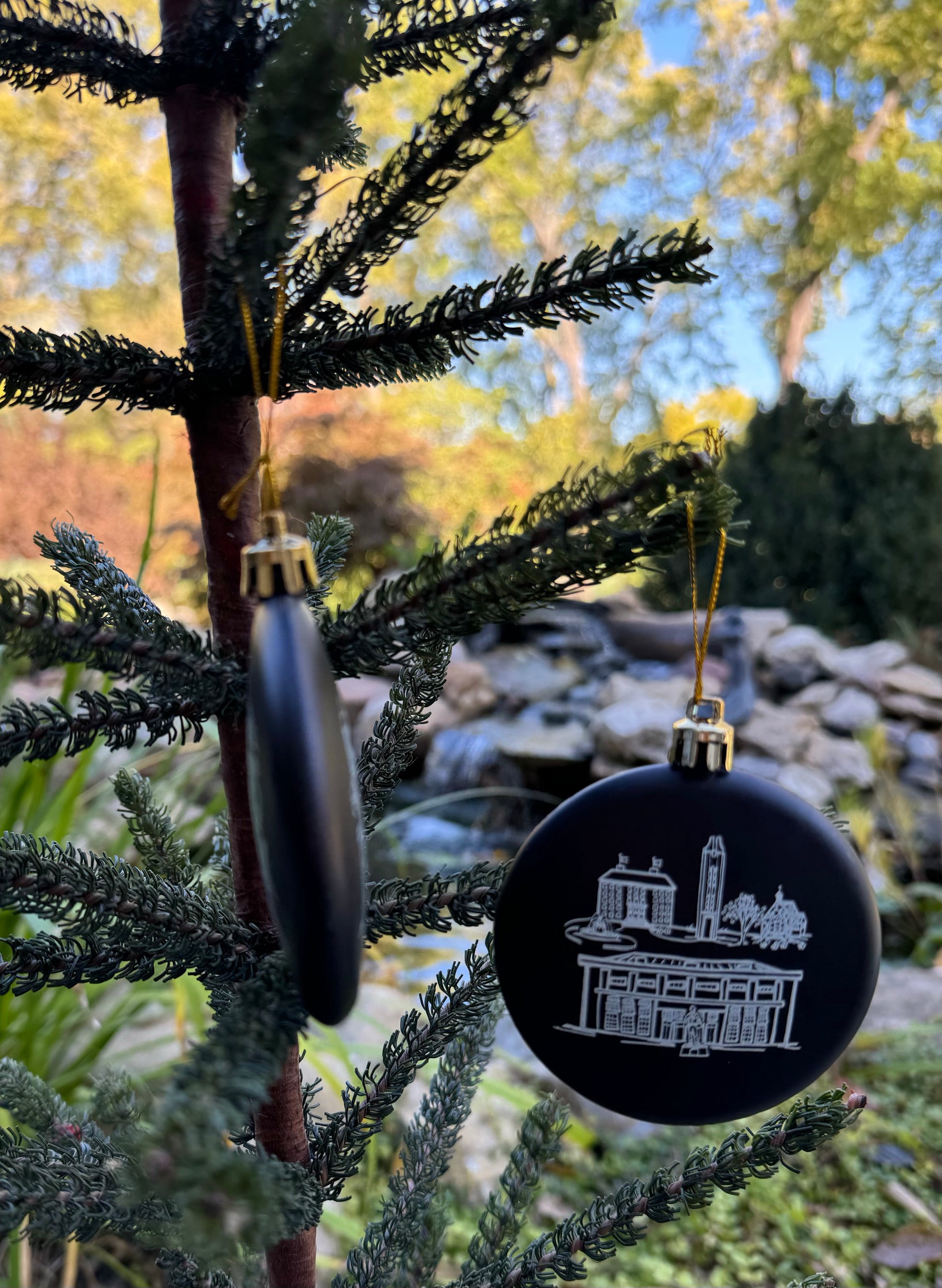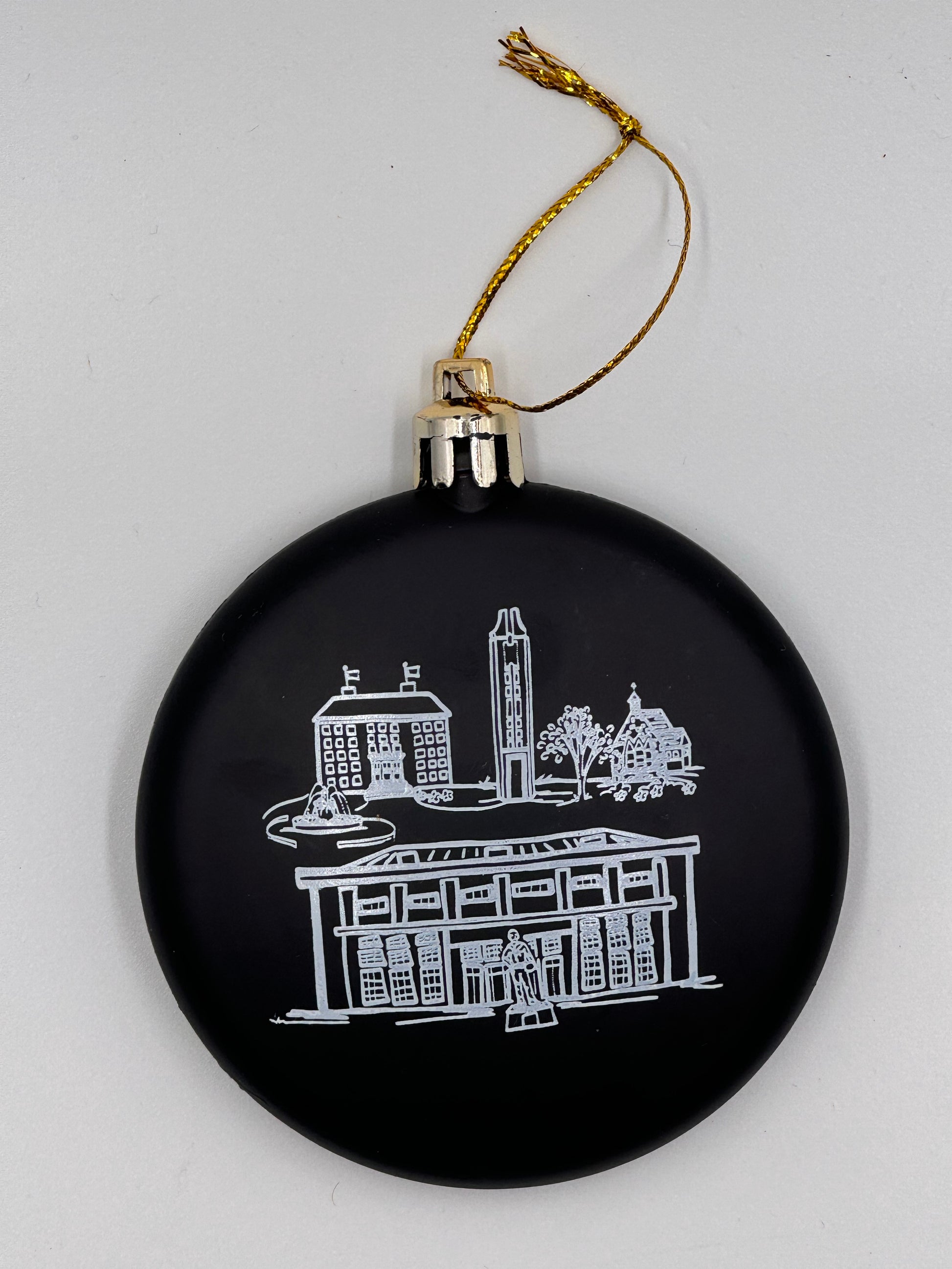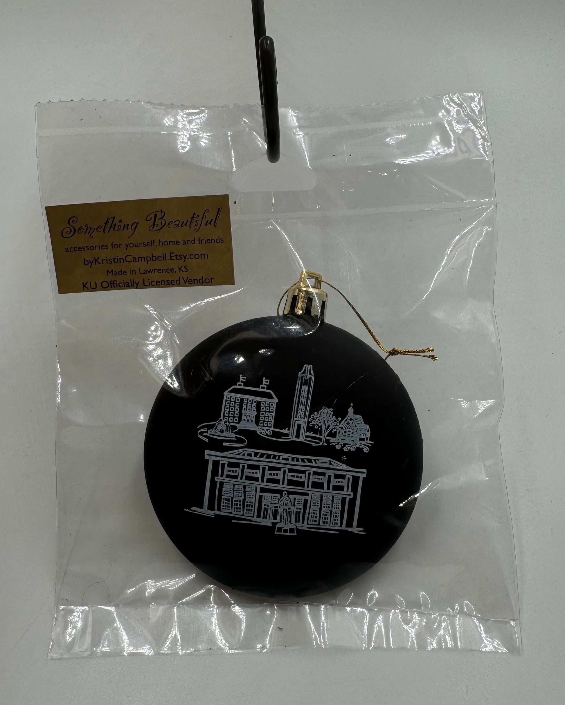 This simple, classic holiday ornament is a great way to share your Jayhawk love. The ornament has a beautiful matte black finish with white artwork giving it the look of an old school chalkboard. One side of the ornament has the words “Merry Christmas & Rock Chalk Jayhawk.” The other side features a sketch of Allen Fieldhouse with the Campanile and Fraser in the background. The ornament measures about 3” across, is shatterproof and comes with a gold thread hanger.