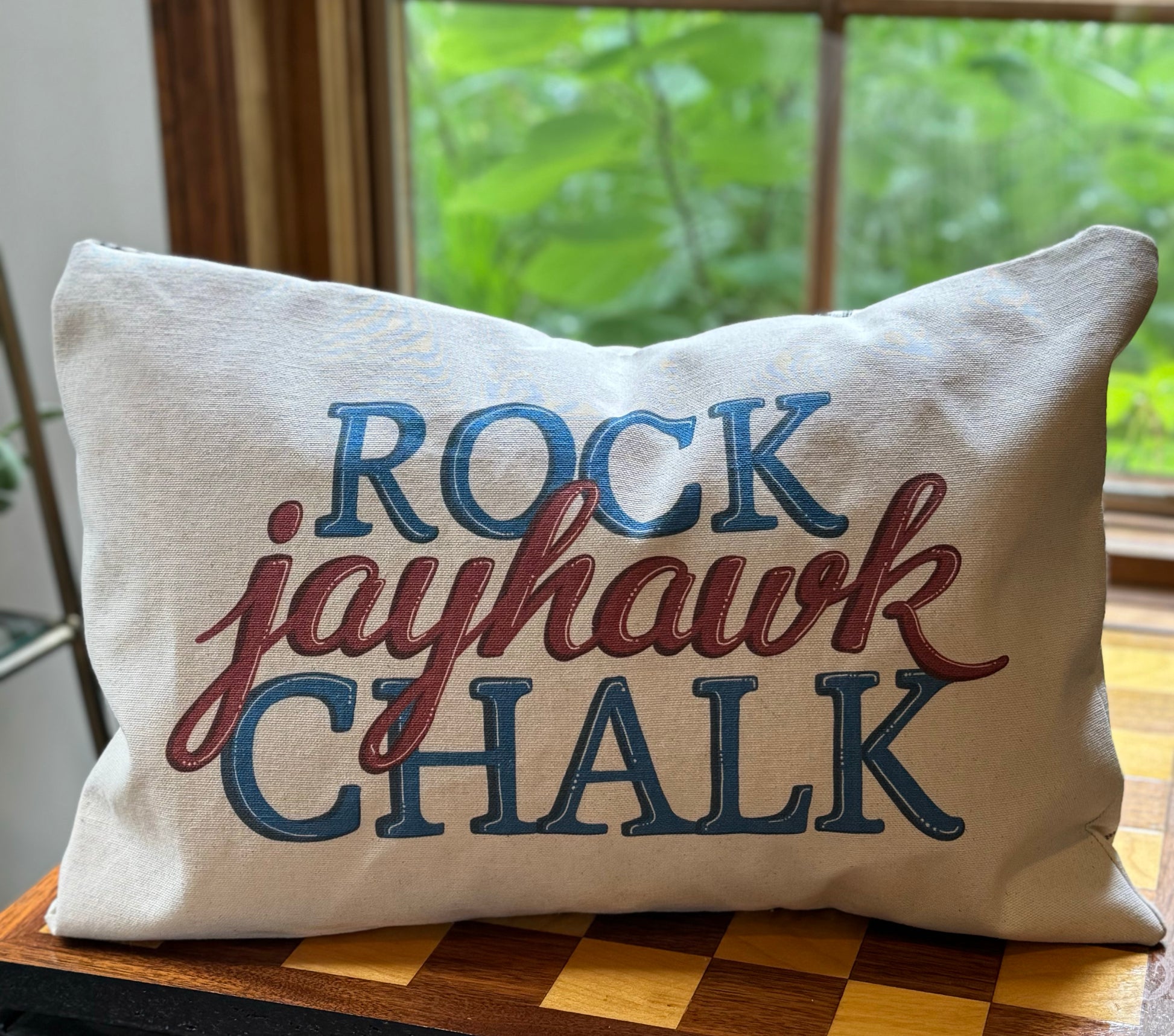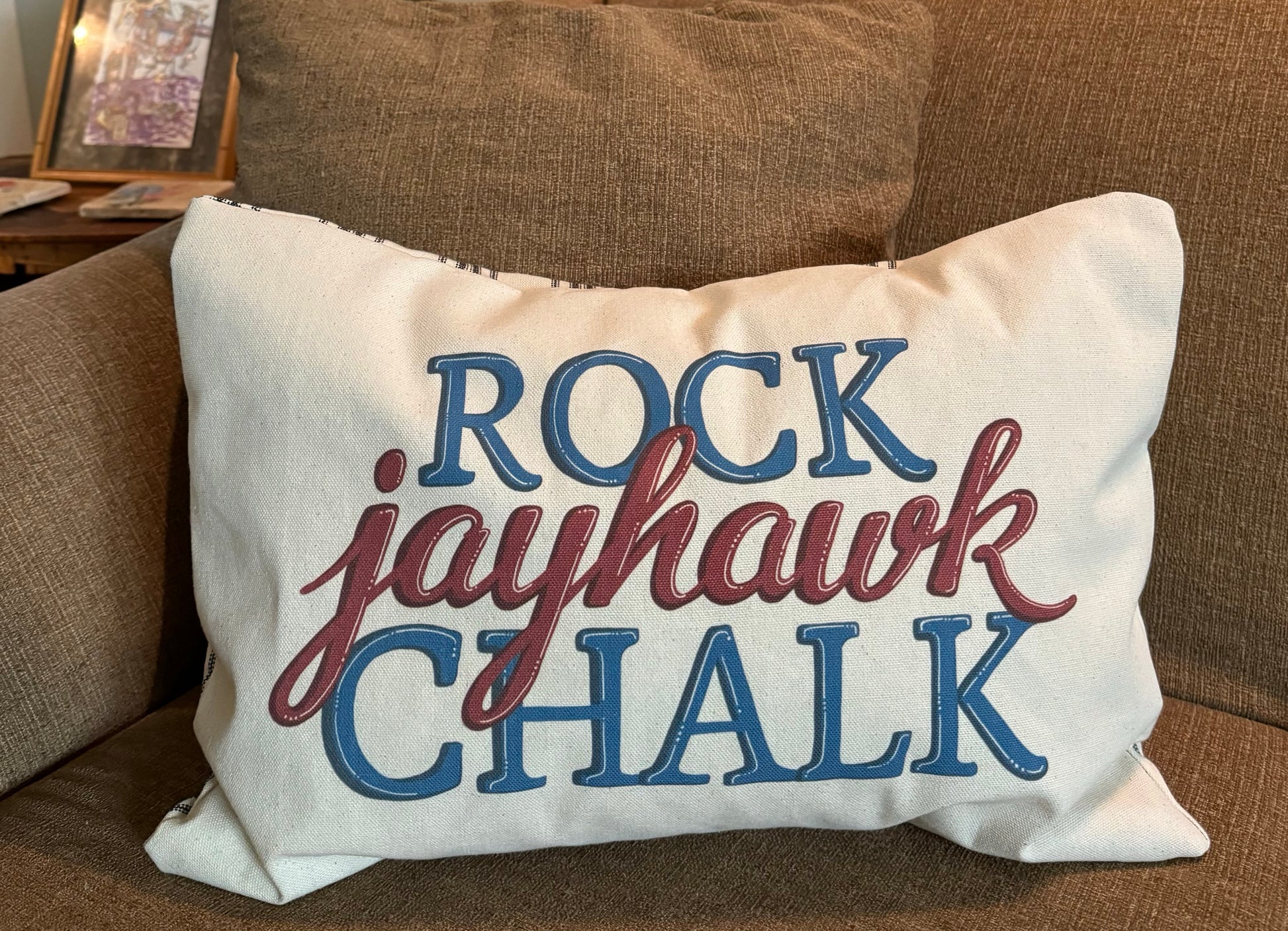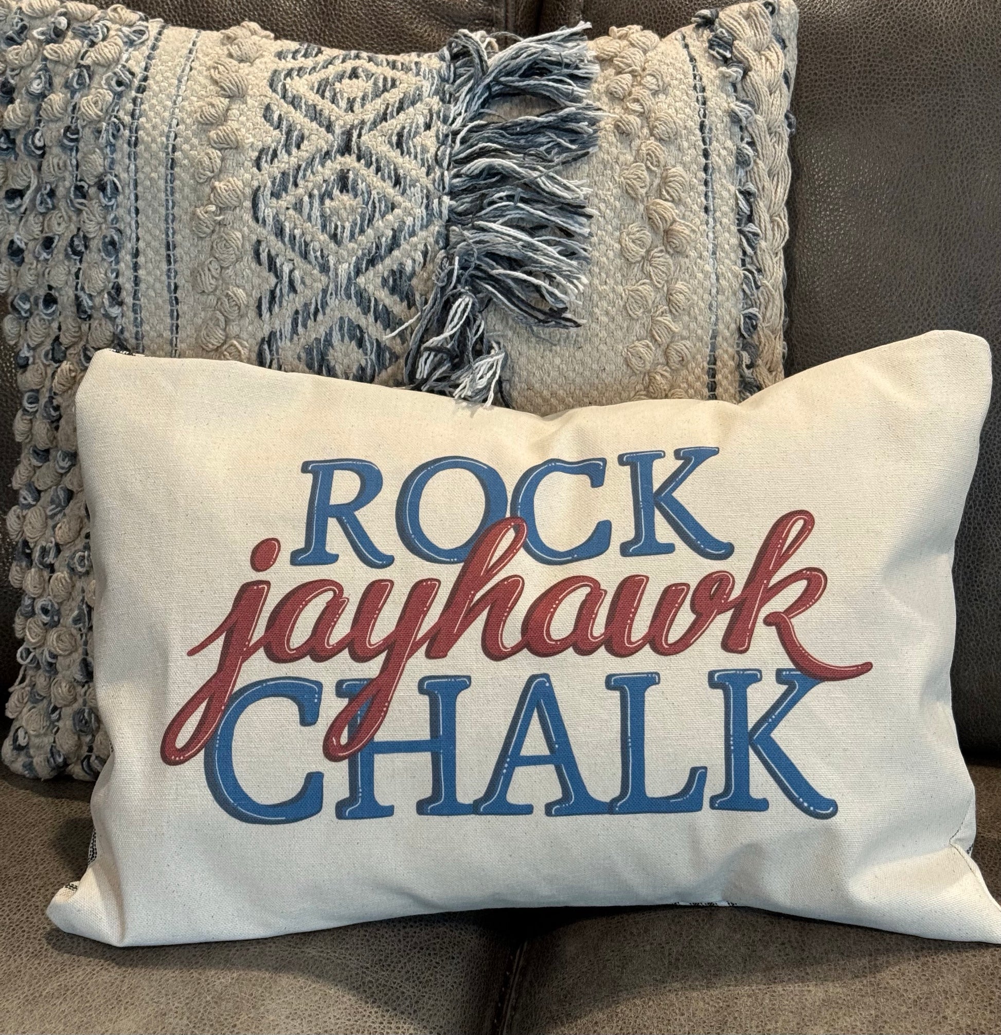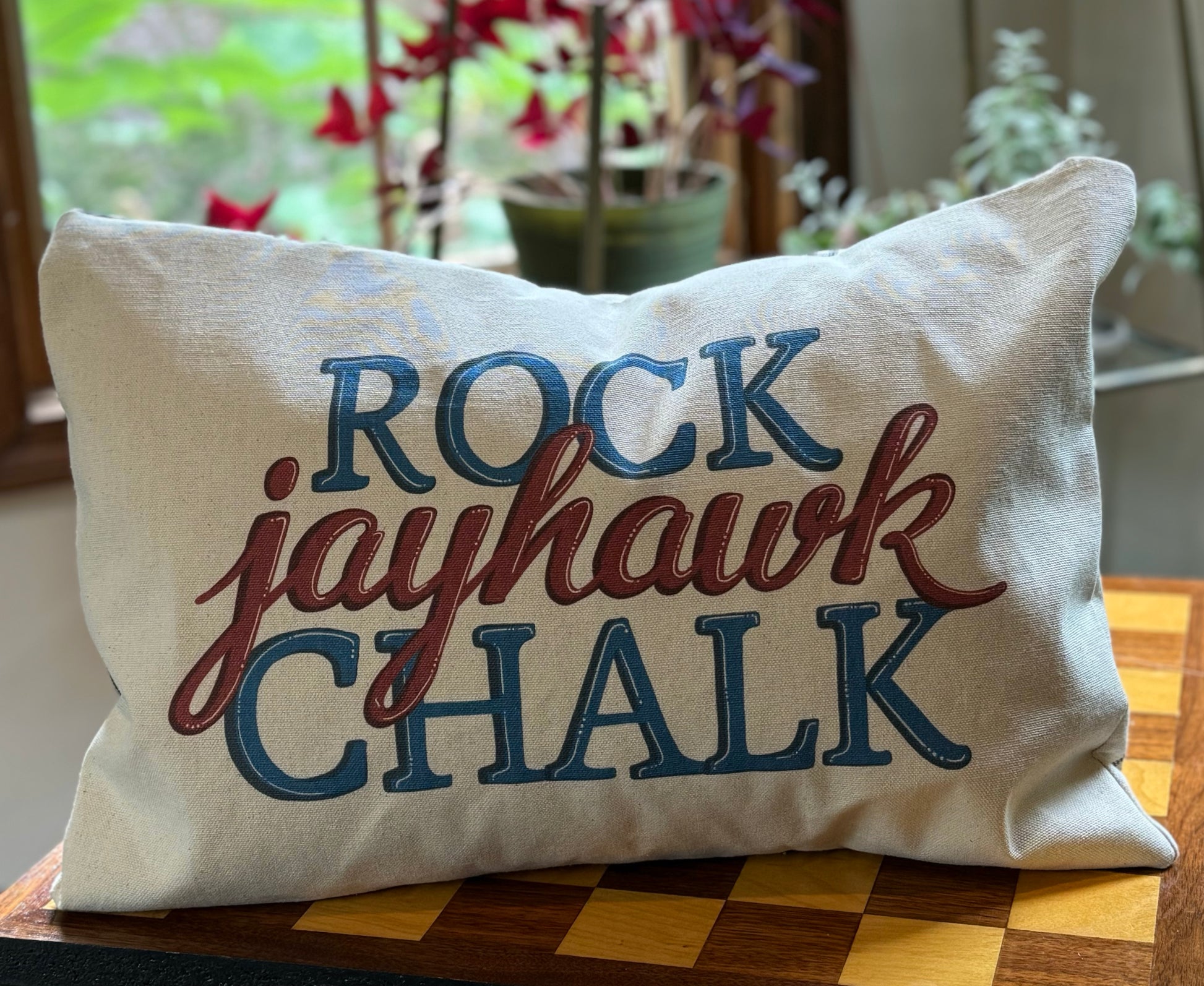 Add this simple Jayhawk pillow to any decor. Professionally printed on natural canvas the words ROCK CHALK JAYHAWK have an old school feel and color palette. The pillow measures 12”x 18” and comes with a faux down insert. The size and shape of the pillow is a nice compliment to typical larger sofa pillows. The back of the pillow has a simple envelope fold closure.