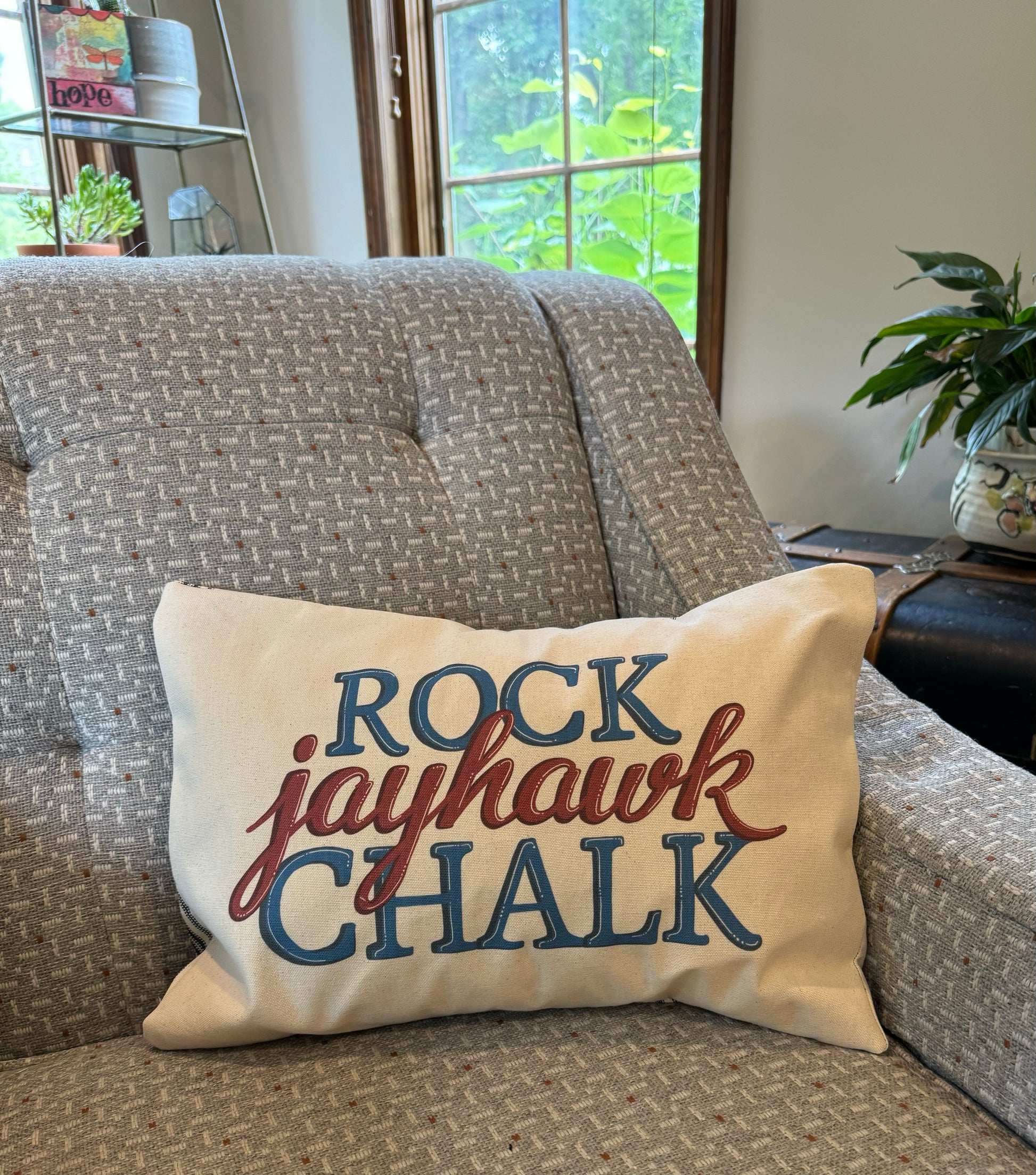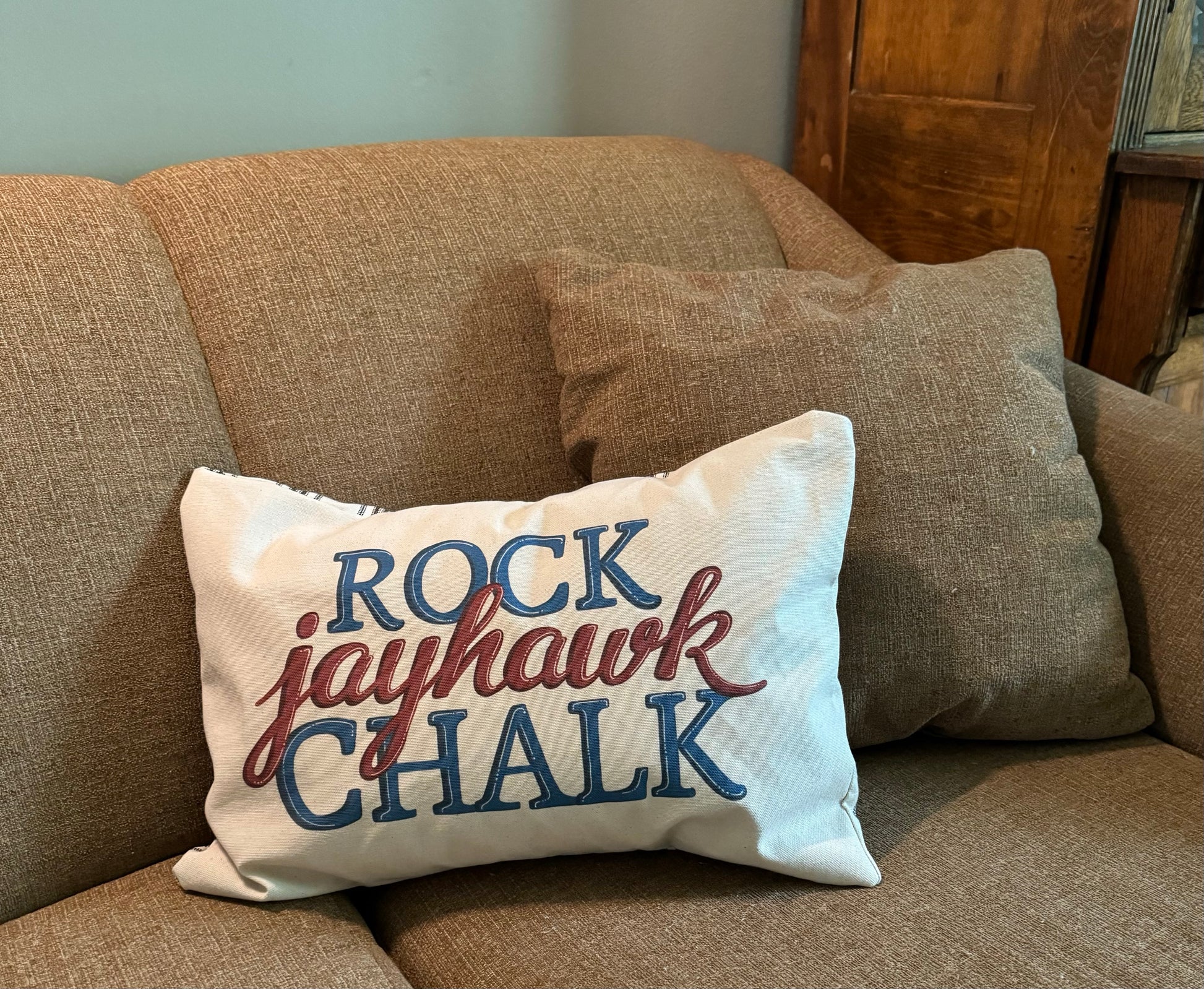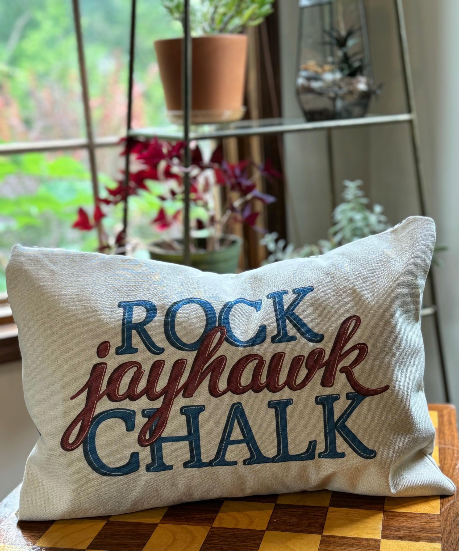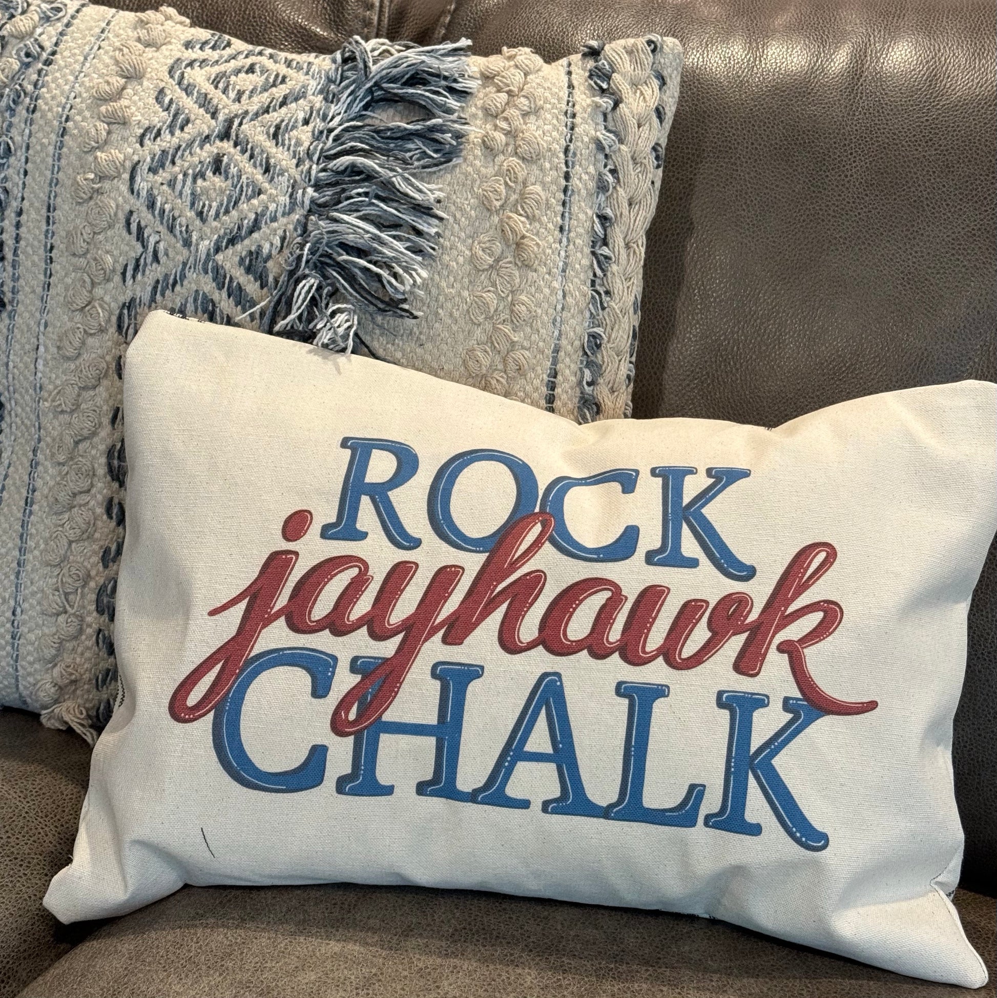 Add this simple Jayhawk pillow to any decor. Professionally printed on natural canvas the words ROCK CHALK JAYHAWK have an old school feel and color palette. The pillow measures 12”x 18” and comes with a faux down insert. The size and shape of the pillow is a nice compliment to typical larger sofa pillows. The back of the pillow has a simple envelope fold closure.