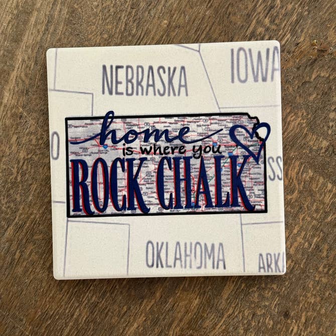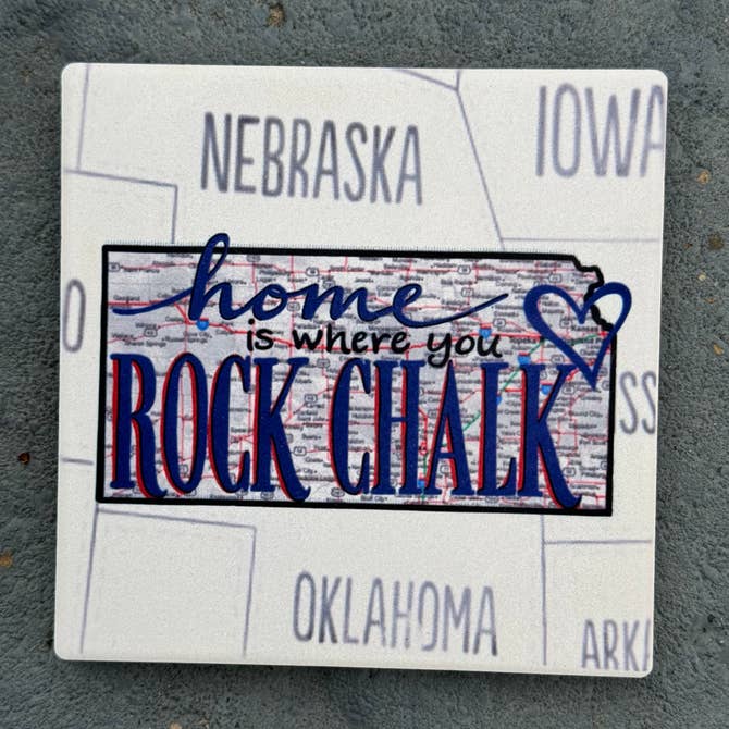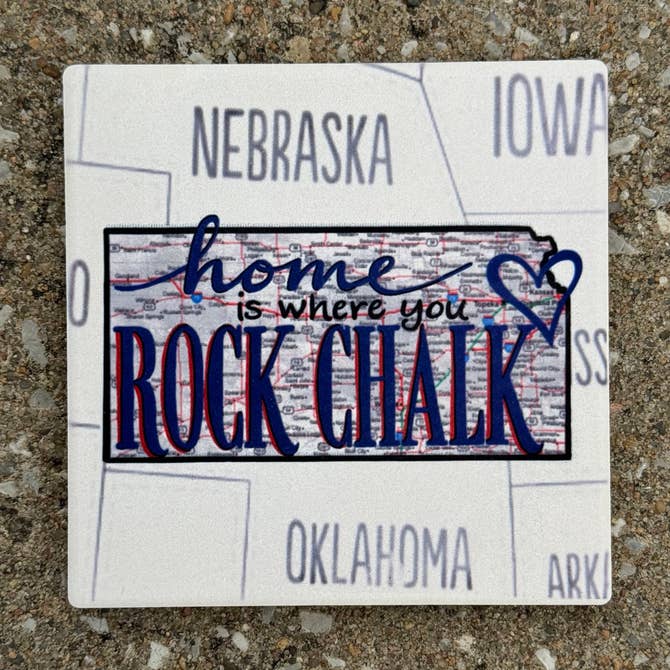 The words “Home is Where you Rock Chalk” have been written over the map of Kansas with a heart over Lawrence and the surrounding area. The artwork has been permanently sublimated directly into this natural stone coaster. The absorbent stone measures 4.25”x 4.25” and has a full cork back to protect surfaces. The artwork features the state of Kansas in the center with hints of the surrounding states. The stone has a soft matte, natural finish with neutral colors to match any decor- perfect for those with ties to the University of Kansas or for those you just love the Jayhawks. Mix and match this design with the other Kansas Map Coasters
