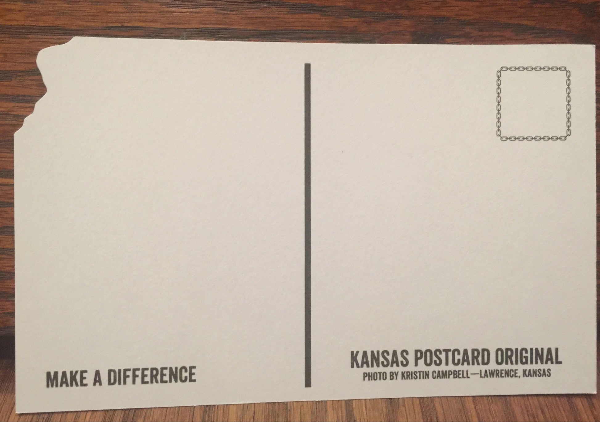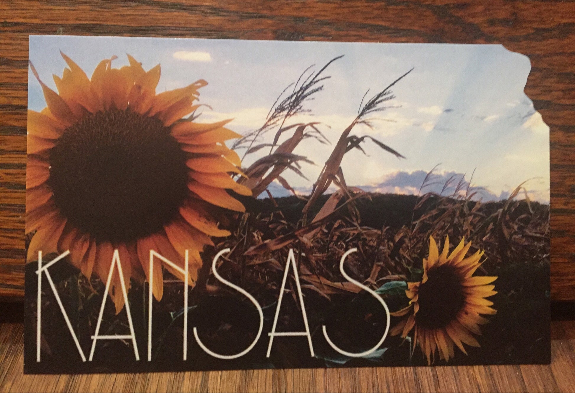 This photo was taken during sunset looking through a field of sunflowers. Unlike most rectangular postcard this card is custom die cut in the shape of Kansas.