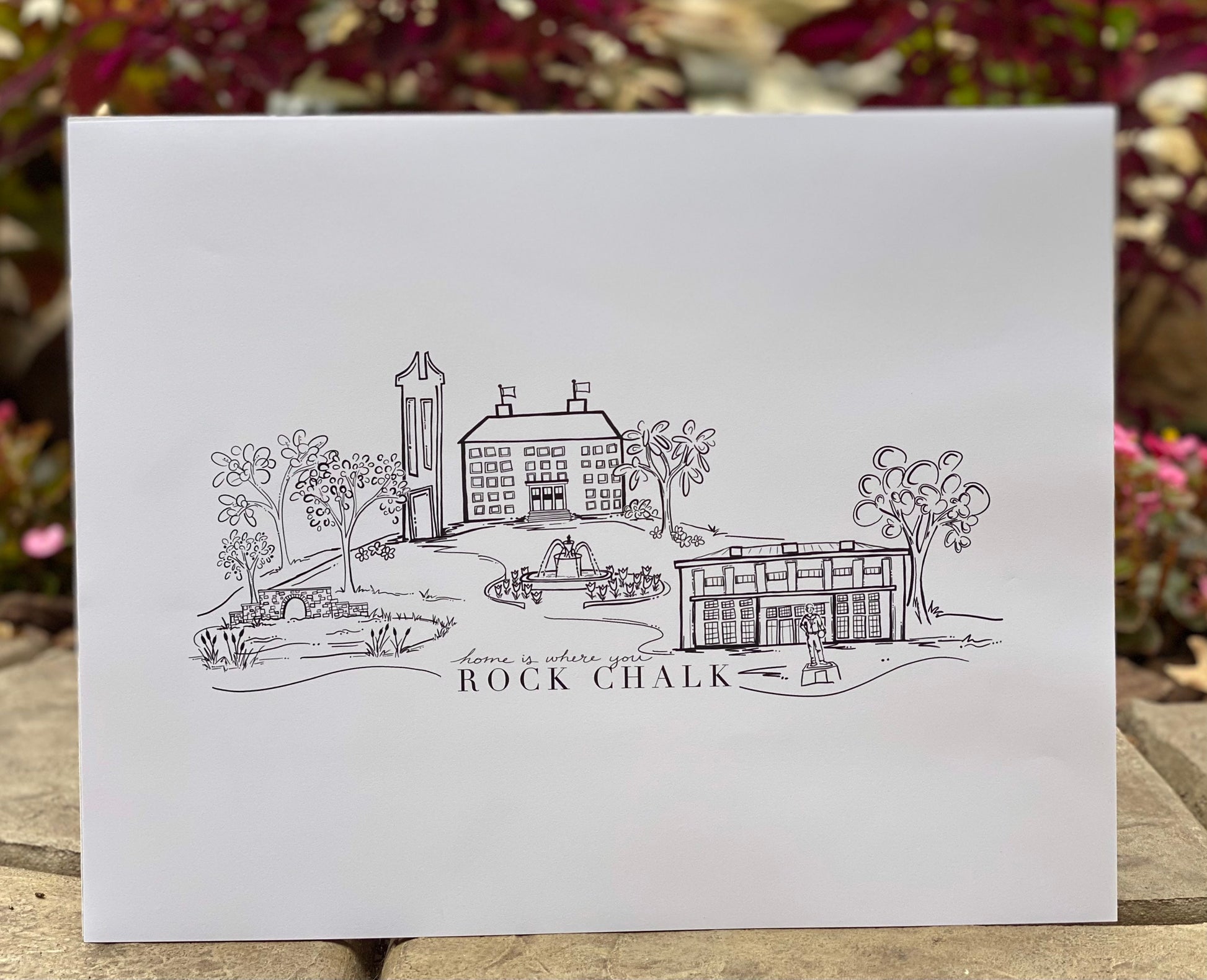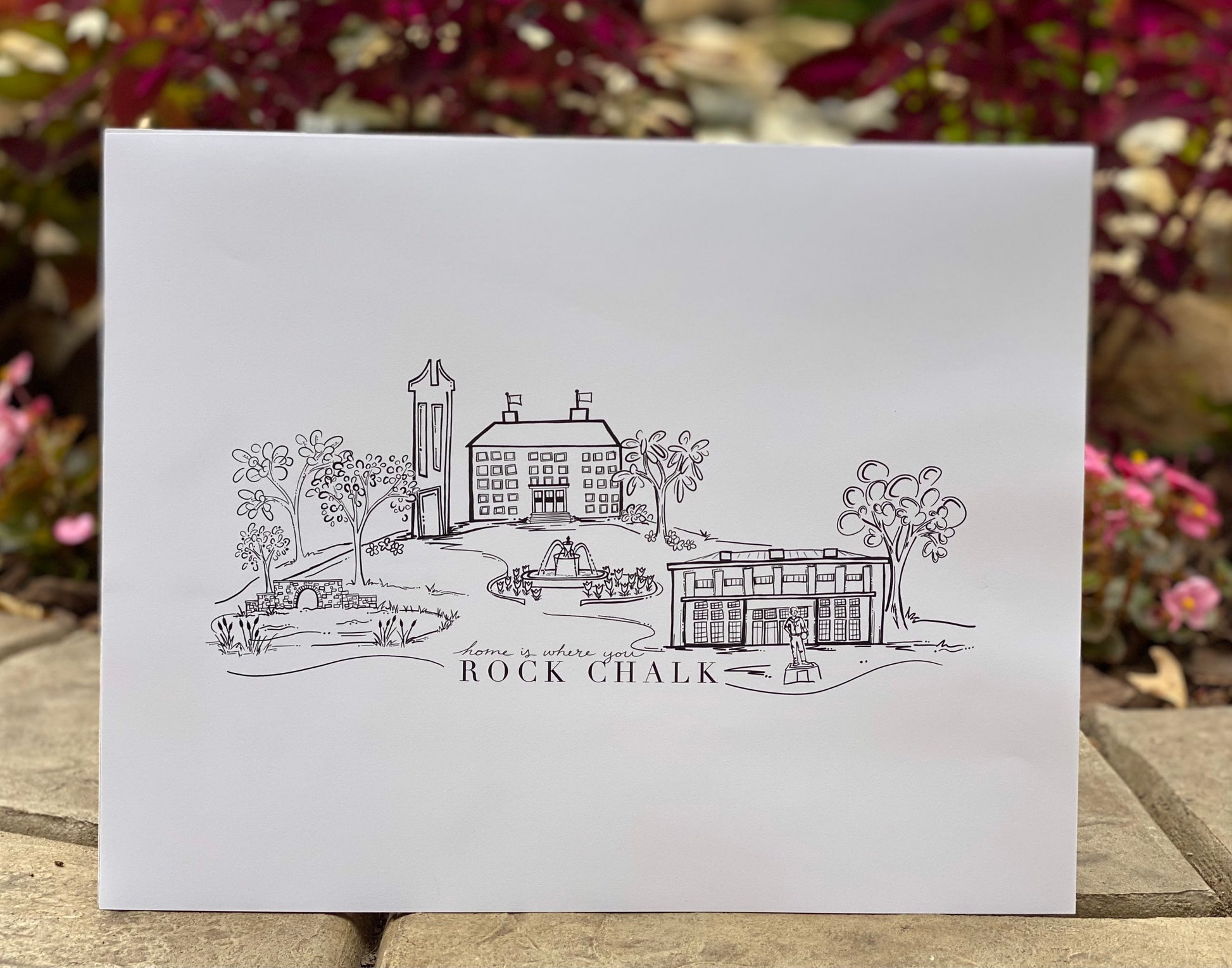 This whimsical sketch captures many of the highlights on the University of Kansas campus. From the hilltop with Fraser Hall all the way to Allen Fieldhouse this black and white print will fit any decor while sharing your love for the Jayhawks. The words home is where you Rock Chalk are front and center. My original art has been professionally printed on UV coated paper and come with a backer board and ready to place in a 11x14 frame.