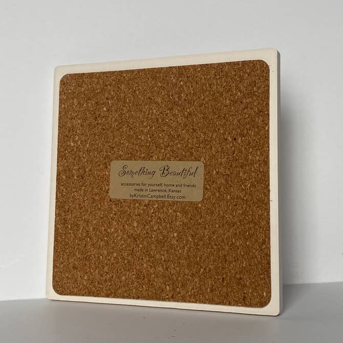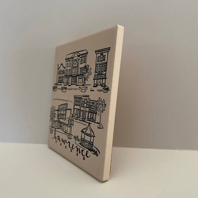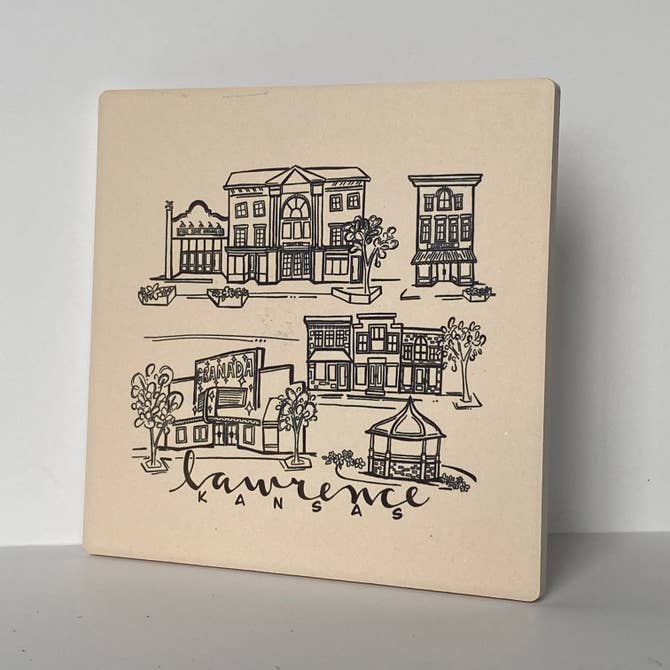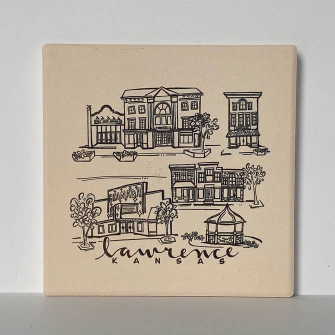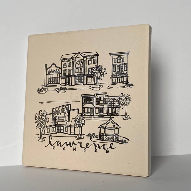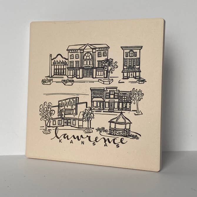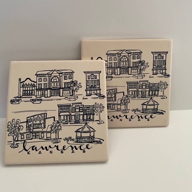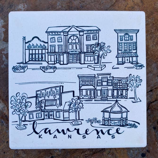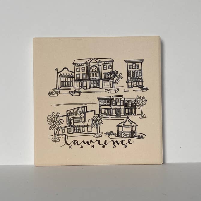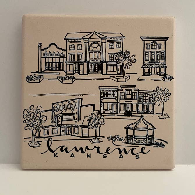This simple black ink coaster features sketches of some of the most iconic locations around Lawrence, Kansas. The absorbent stone coaster measures 4.25”x 4.25” and has a full cork back to protect surfaces. The artwork has been permanently sublimated directly into the stone and will not fade or scratch over time.