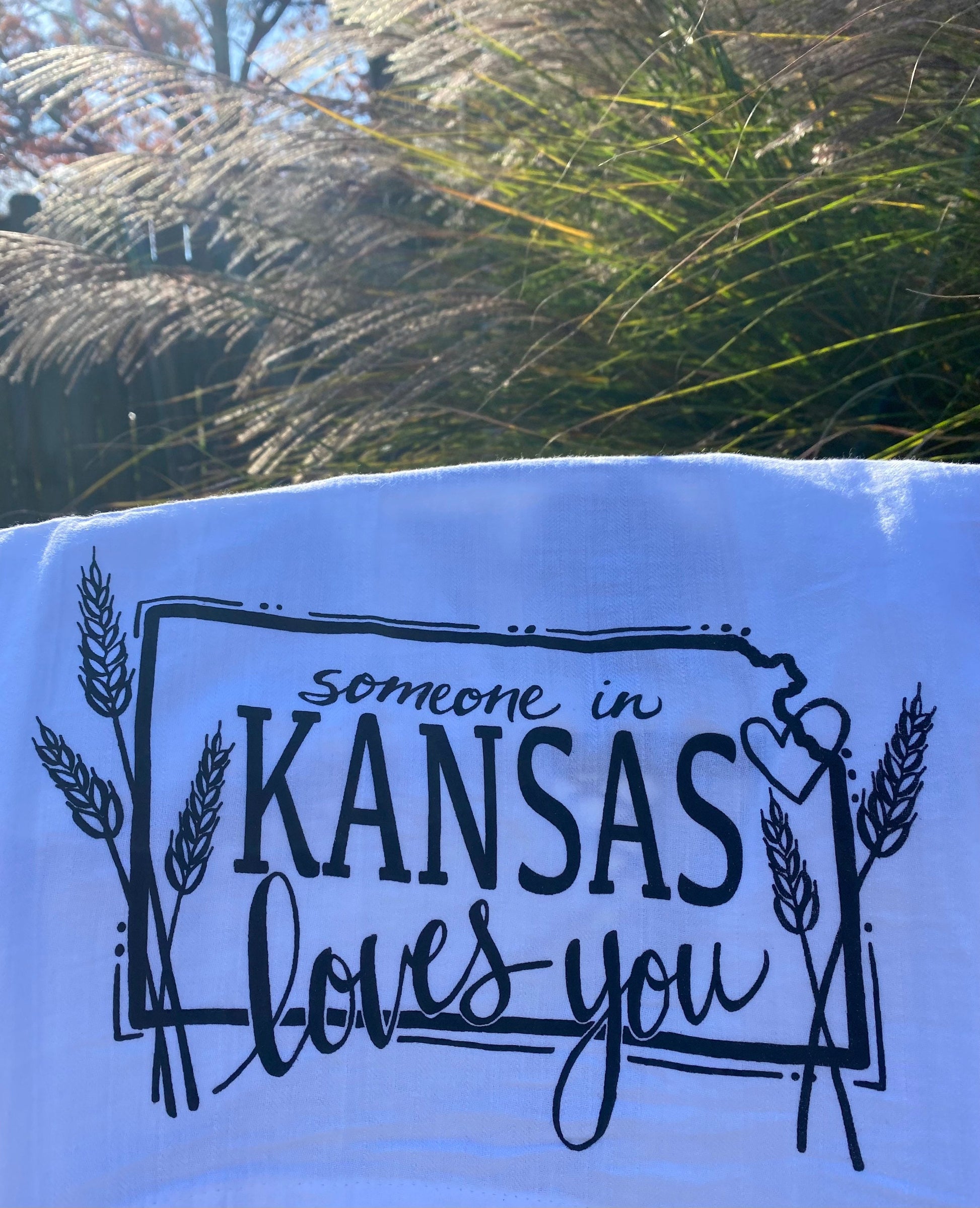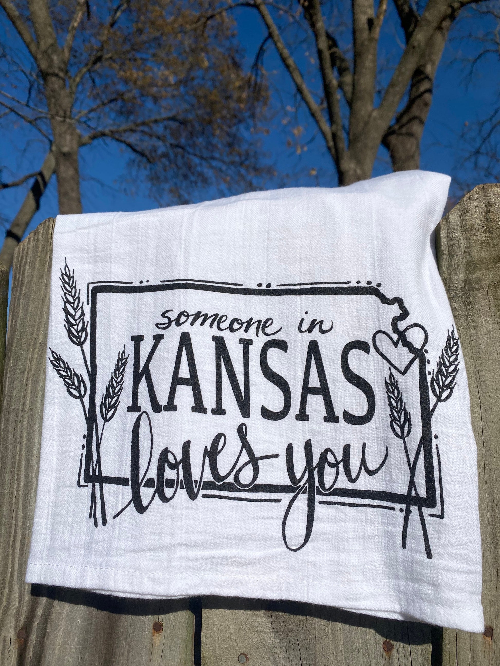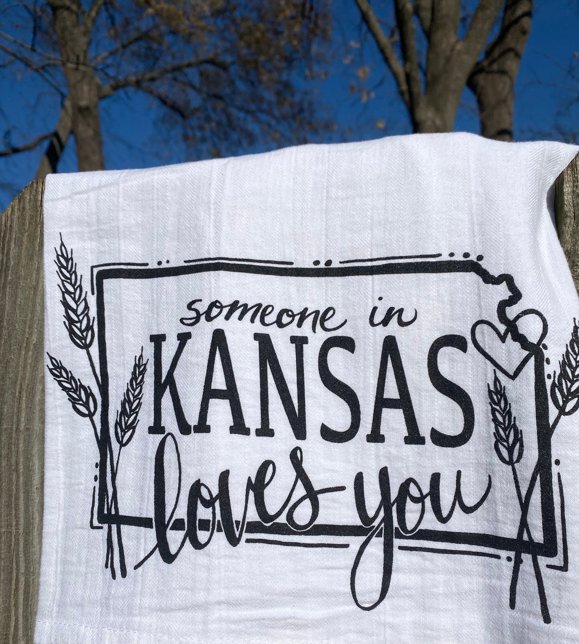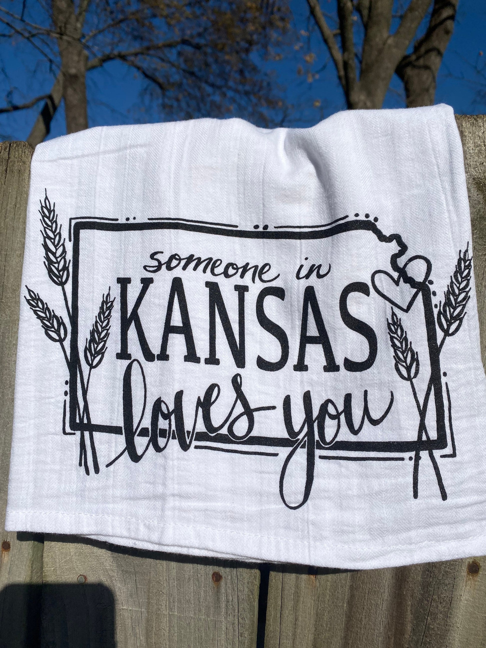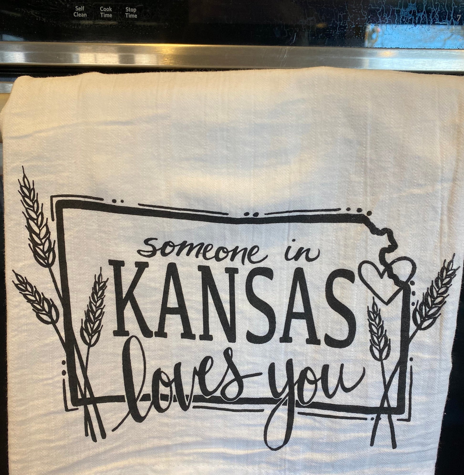 This beautiful four sack tea towel is thicker than most and has a beautiful herringbone pattern. My sketch of the state of Kansas with the words “Someone in Kansas loves you” will be a perfect gift for just about anyone on your list. Towel measures 28”x28”