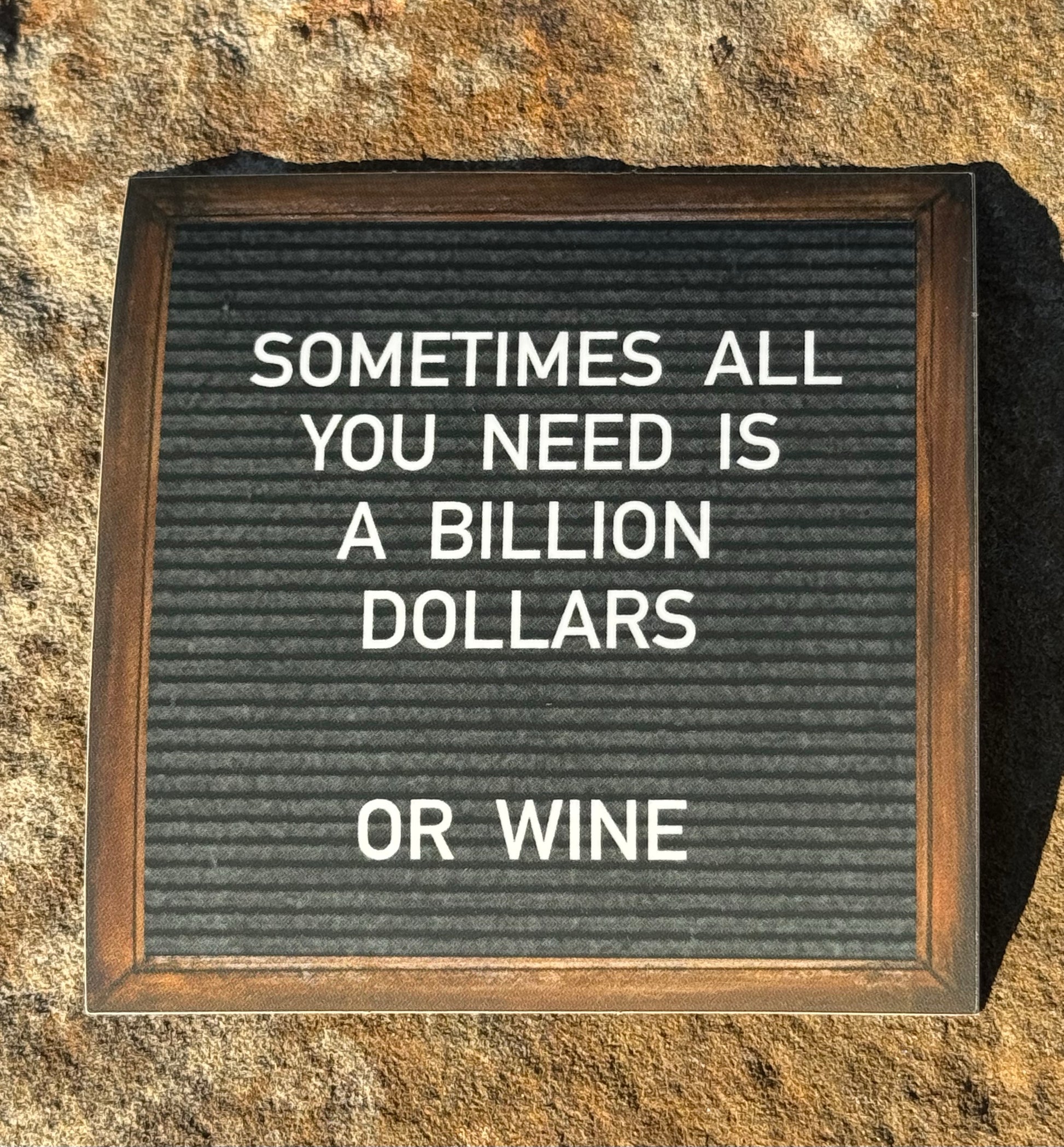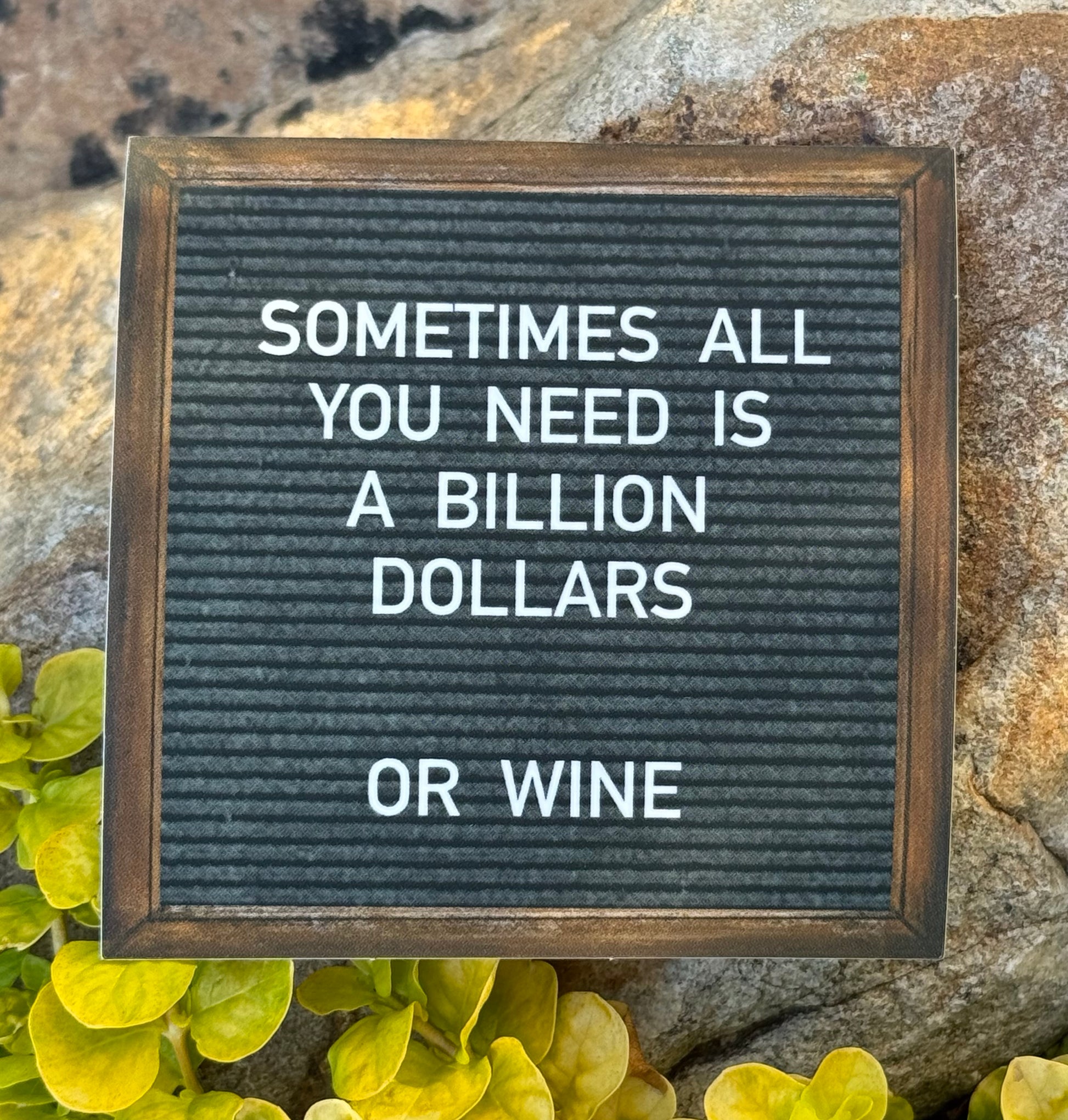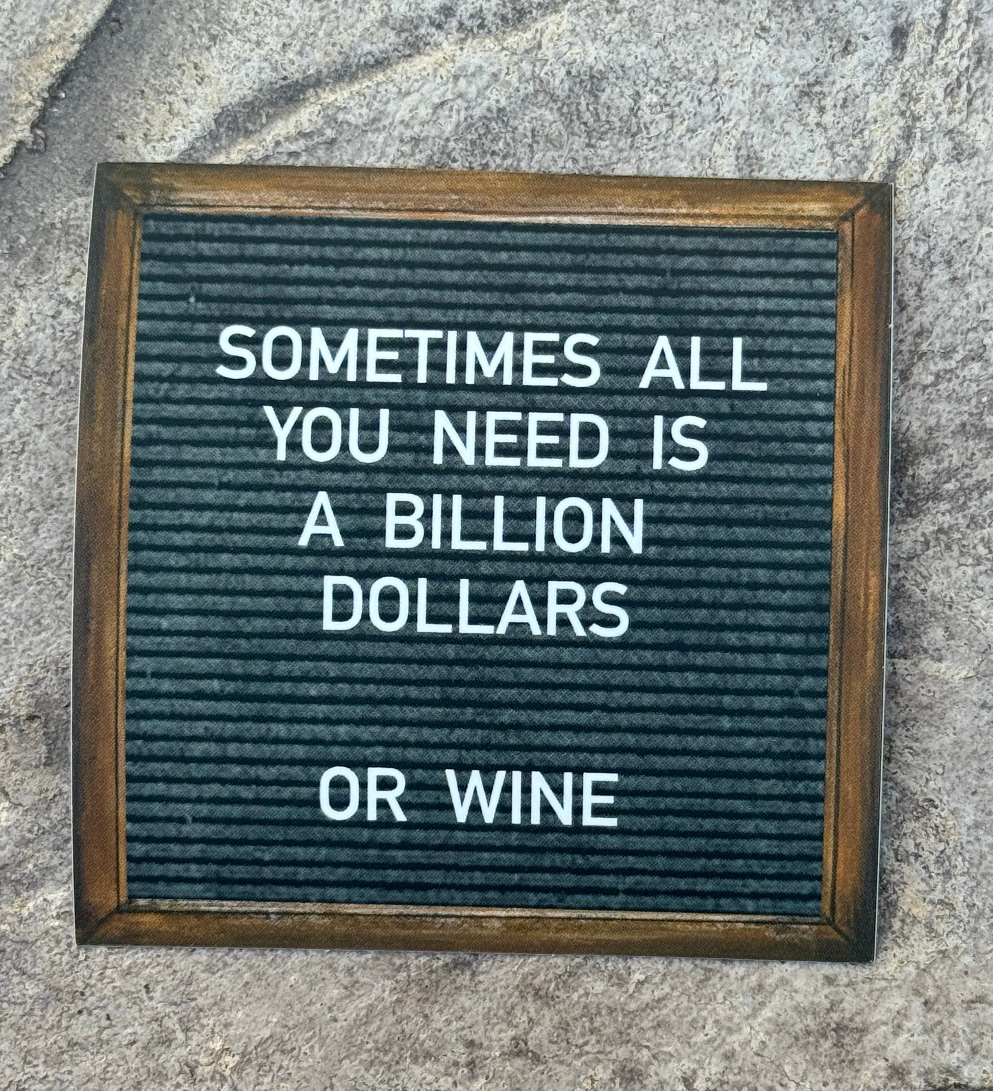 This beautiful sticker looks just like a felt letter board. It measures 3”x 3” and has a soft matte finish. Stickers are tough enough for your favorite water bottle, computer or just about anything. This sticker features the quote, "SOMETIMES ALL YOU NEED IS A BILLION DOLLARS- OR WINE"