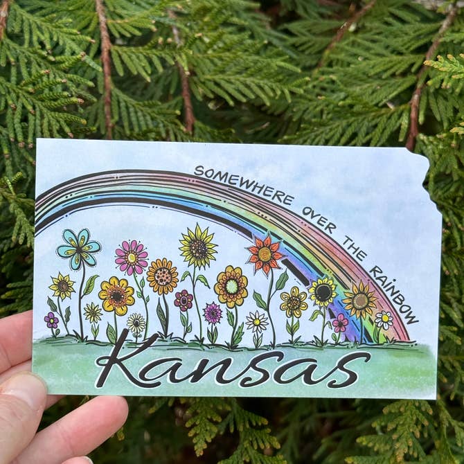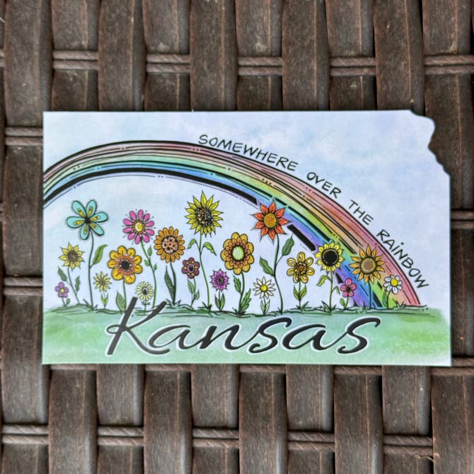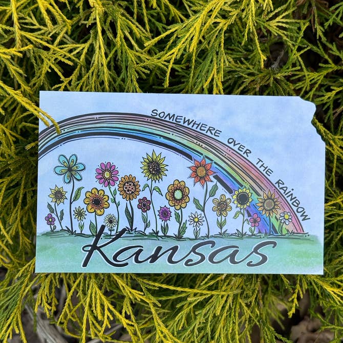 More than a basic postcard, this Kansas postcard is also die cut in the shape of Kansas. The background of this postcard is a simple Rainbow sketch with whimsical sunflowers at the base. Share a little Kansas love with this cheerful one-of-a-kind postcard