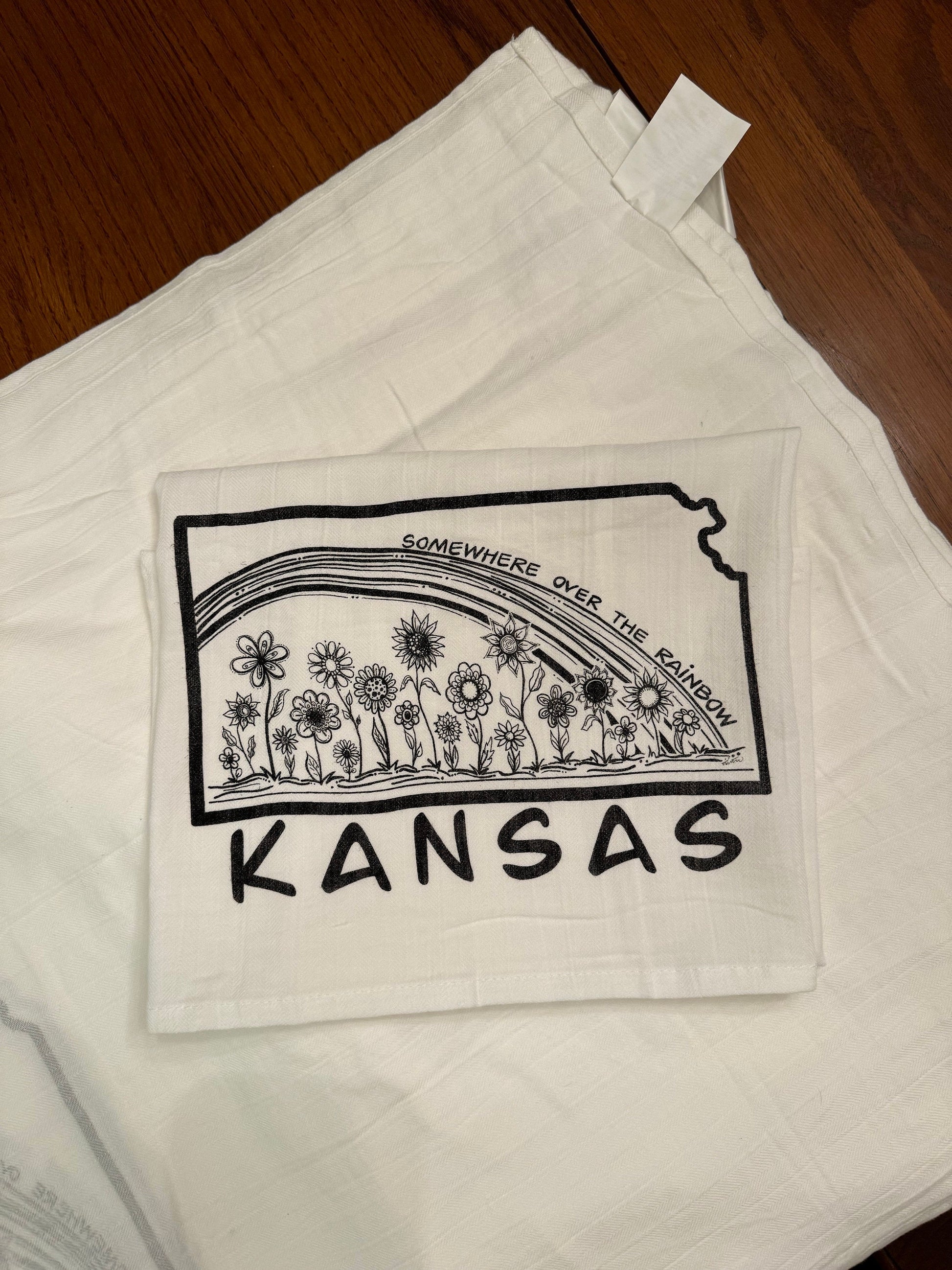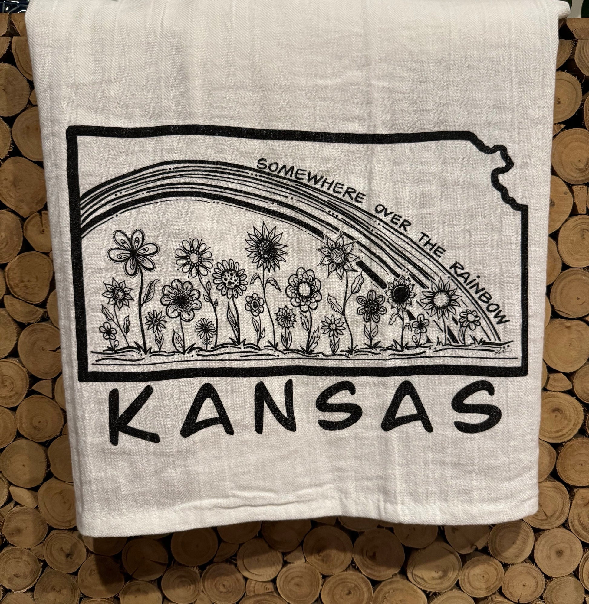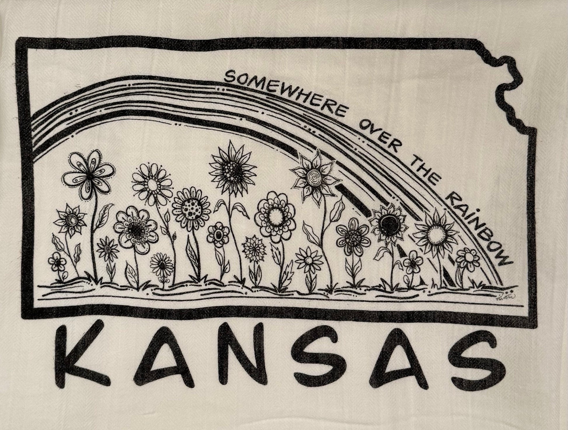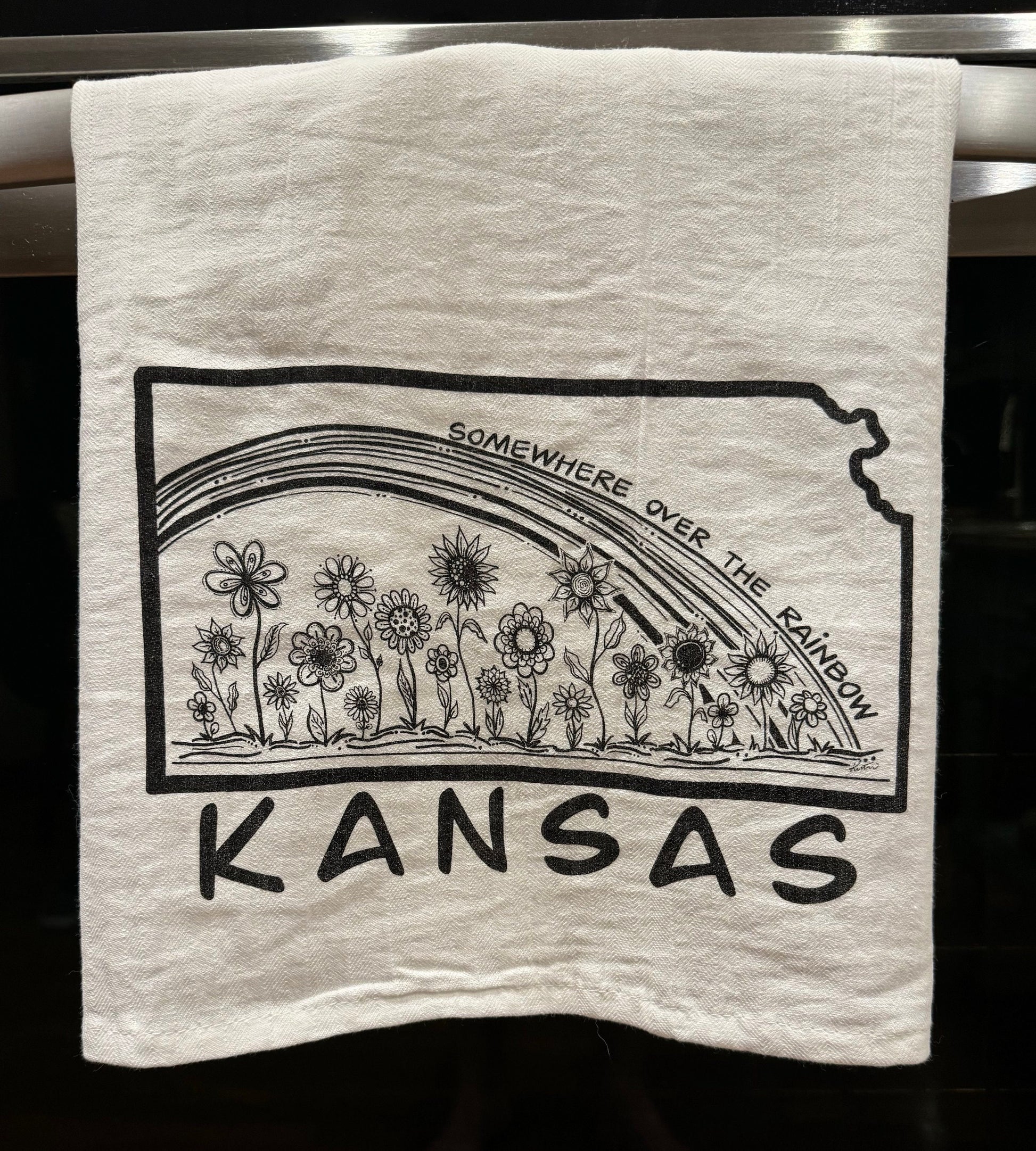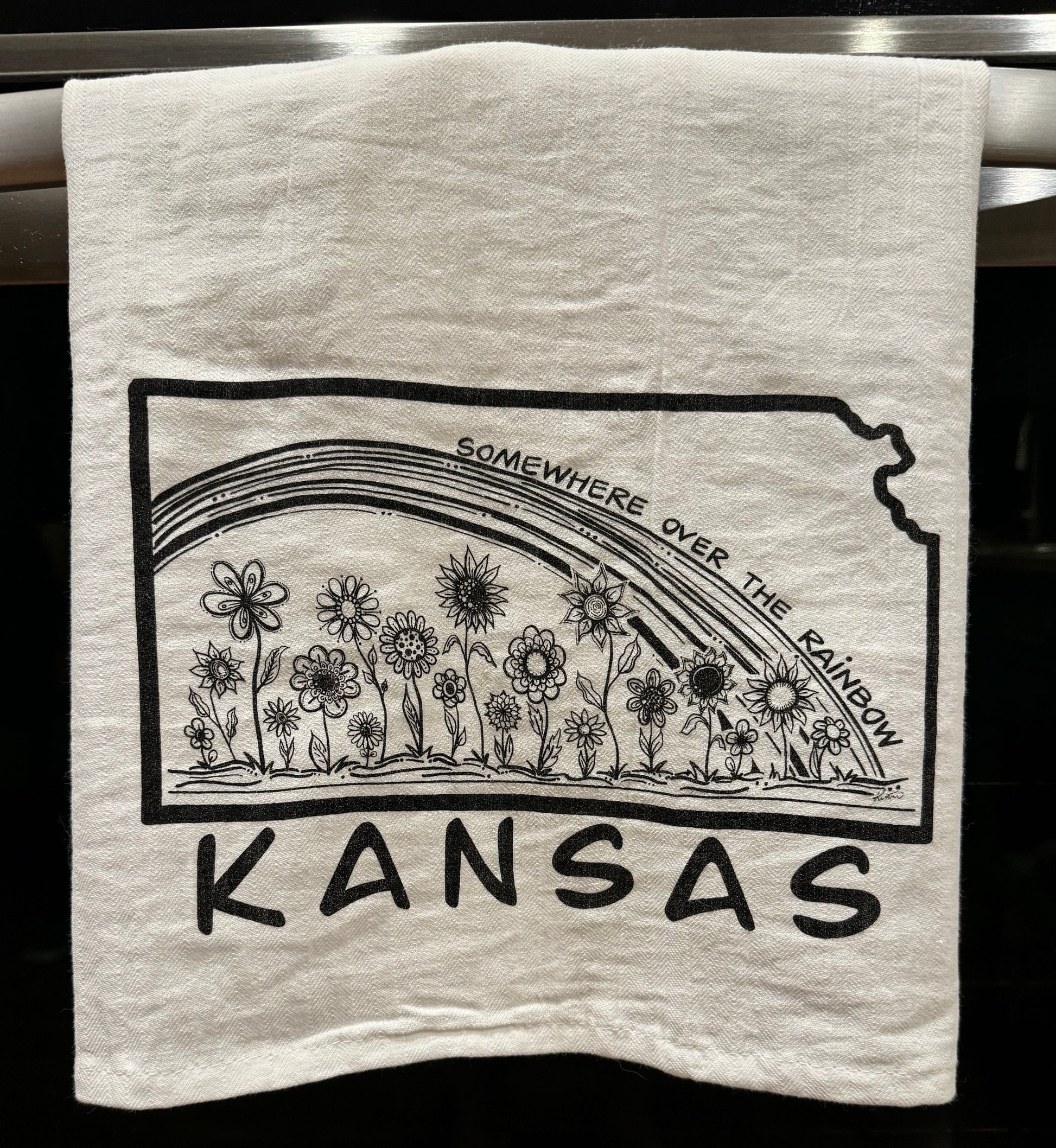 Add this cheerful flour sack towel to your kitchen. The outline of Kansas has a whimsical rainbow stretching across the sky and a line of assorted sunflowers at the base. The artwork has been professionally screen printed on this 27"x27" tea towel. Unlike most flour sack towels, these have a fine herringbone weave and wash and dry beautifully. Check out all of my other Kansas designs to compliment the Sunflower State. Each towel will be folded with a tag pinned to the front with all of the product info. Towels are designed and screen printed in Lawrence, KS. The detail in the screen print is just amazing- each flower has its own take on being a Kansas Sunflower. The words “Somewhere Over the Rainbow” stretch down the side of the rainbow.