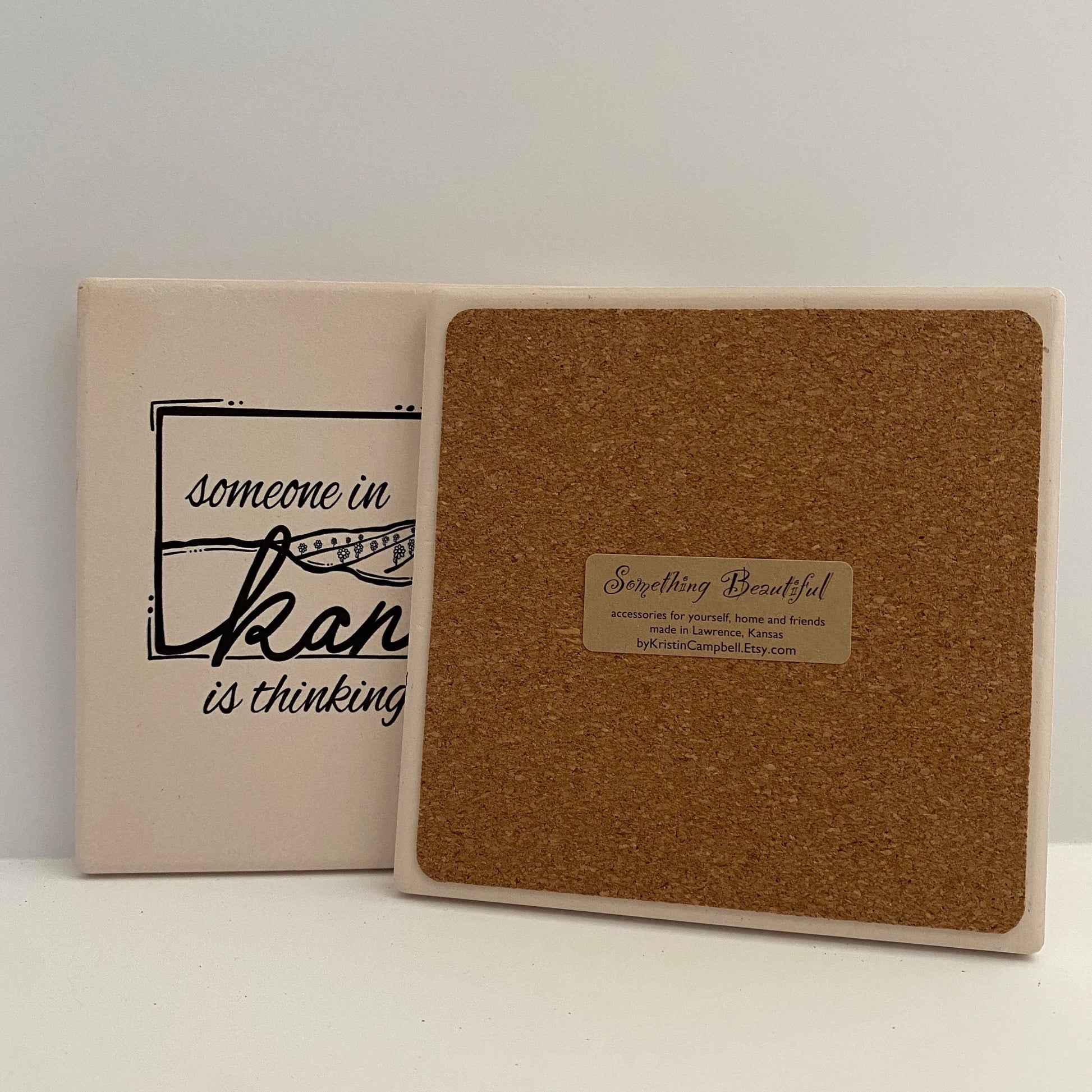 This absorbent stone coaster has a simple outline of Kansas with the words “Someone in Kansas is Thinking of You” My original sketch has been sublimated directly into the coaster. It will not fade or scratch over time. Coasters measure 4.25”x 4.25” and have a cork back to protect surfaces.
